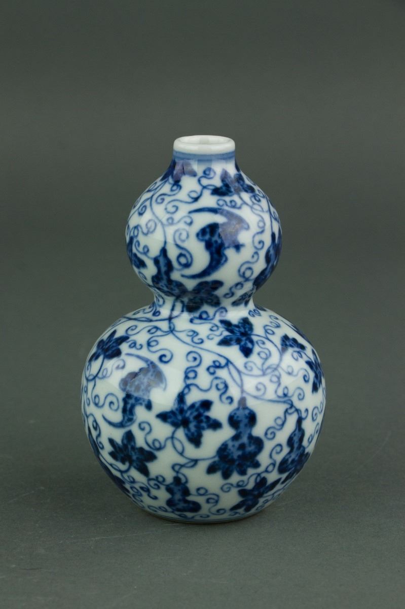 Chinese small blue and white porcelain vase; of double gourd shape; the body painted with leafy floral scrolls; six-character Jiaqing mark on base; W: 7 cm, H: 12 cm, 184 grams
