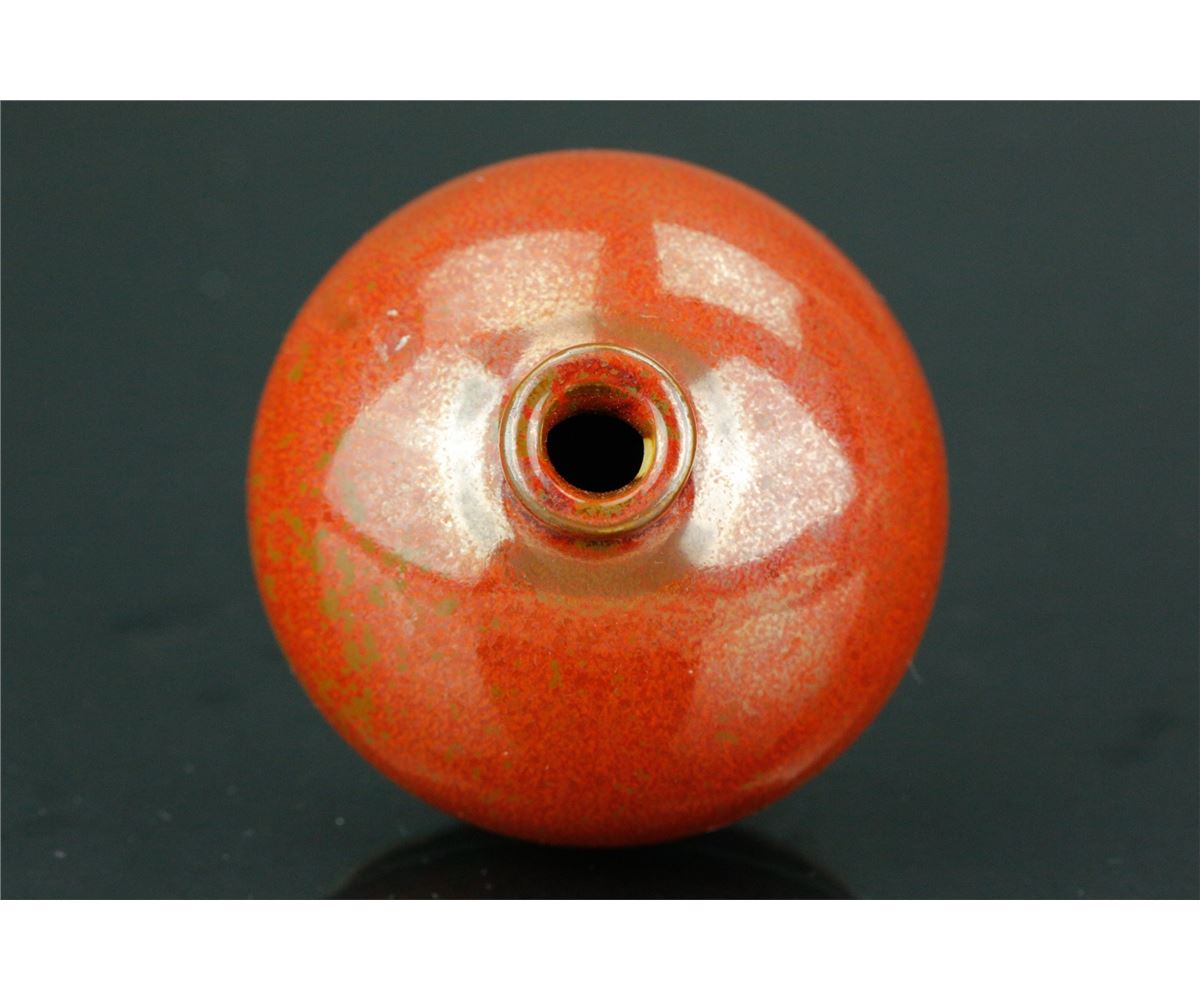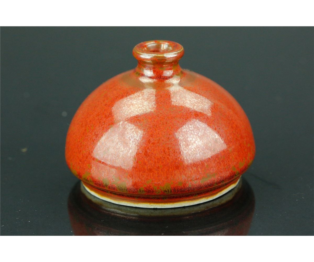 Chinese small copper red porcelain censer; of bell shape with narrow opening; featuring gilt-splashed copper red glaze on body and base; D: 6 cm, H: 4 cm, 52 grams