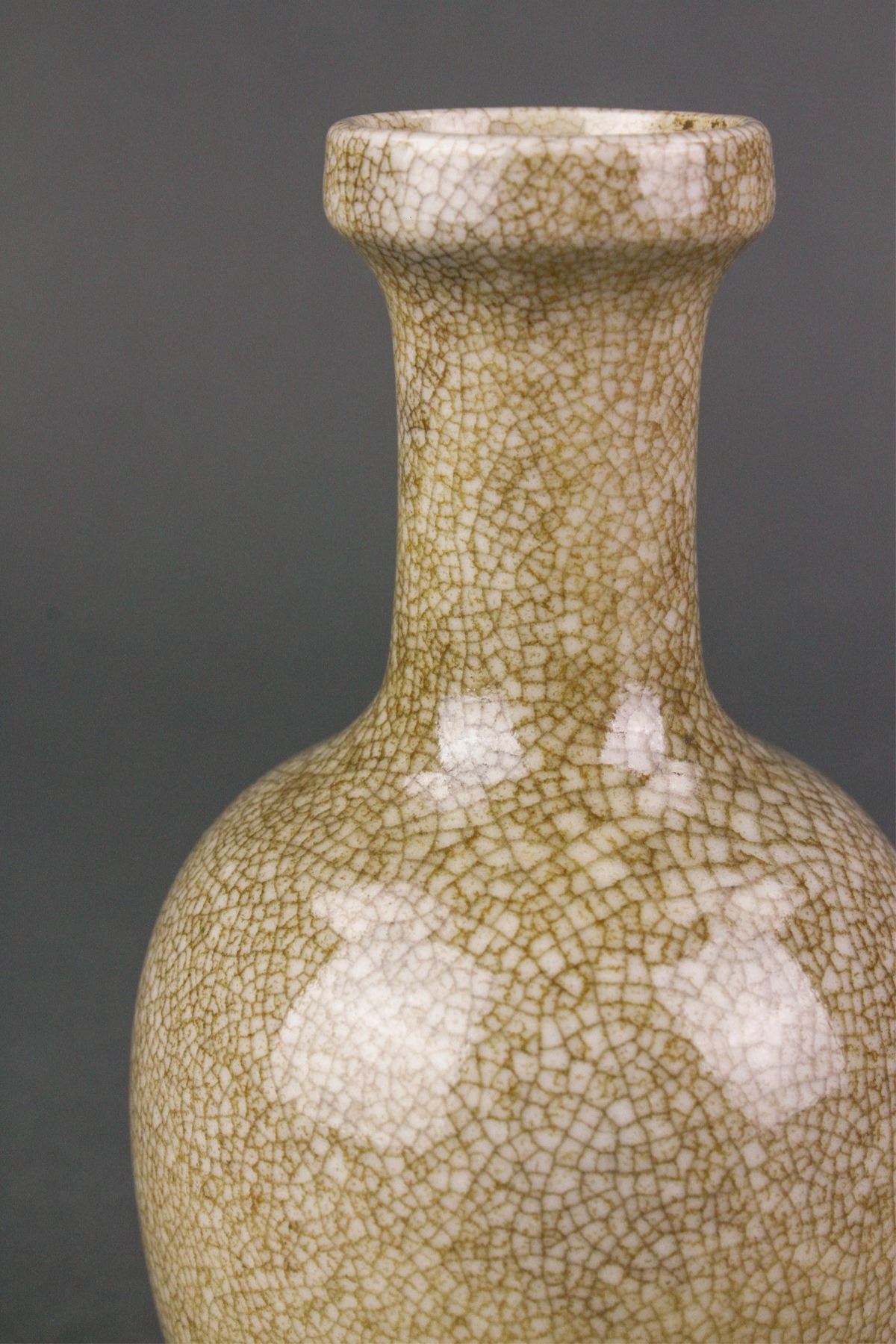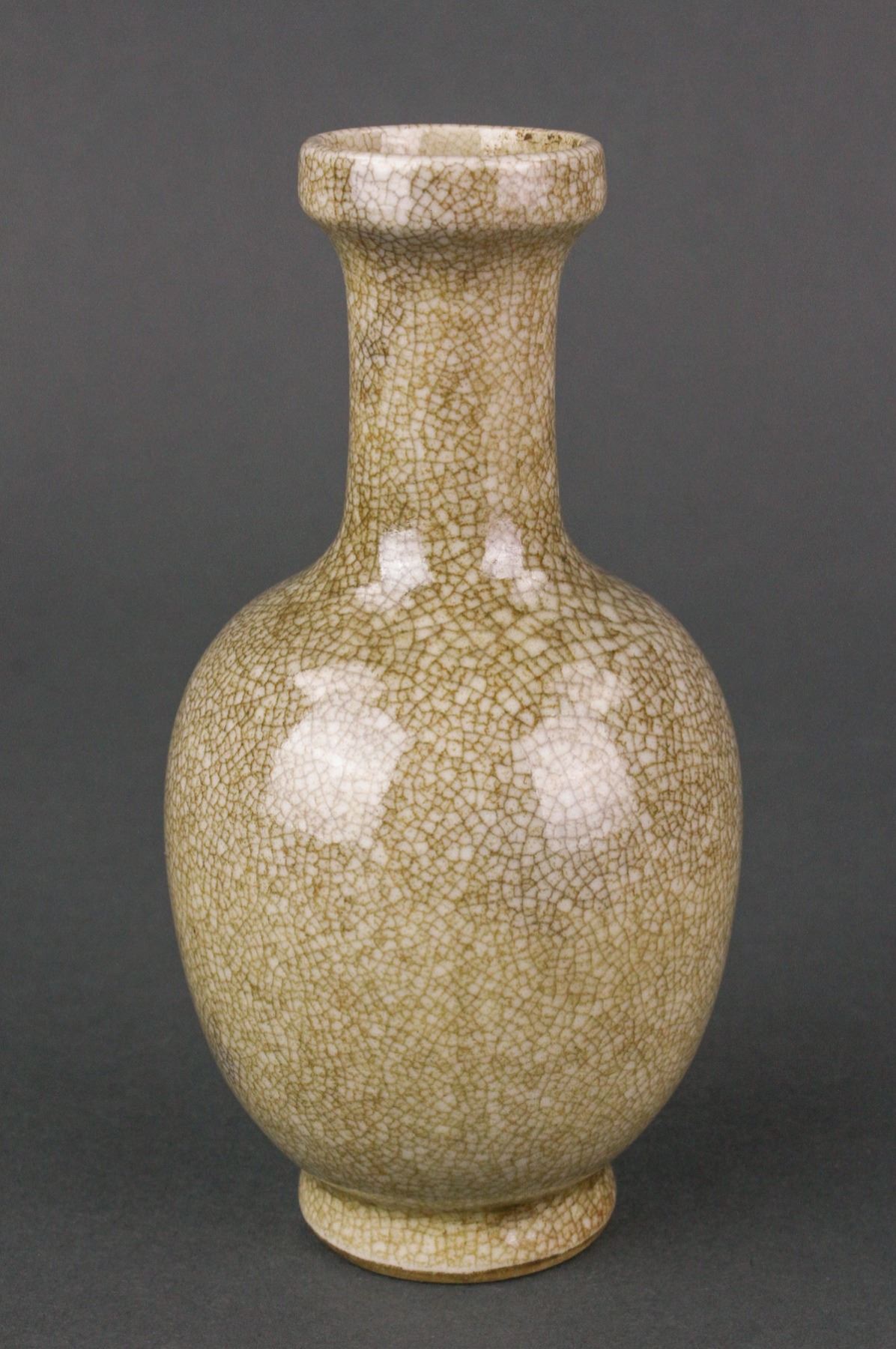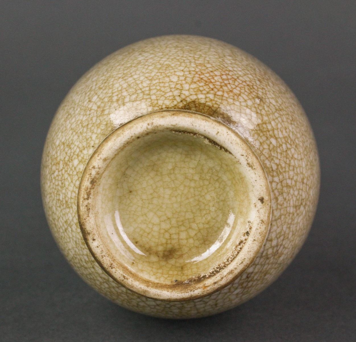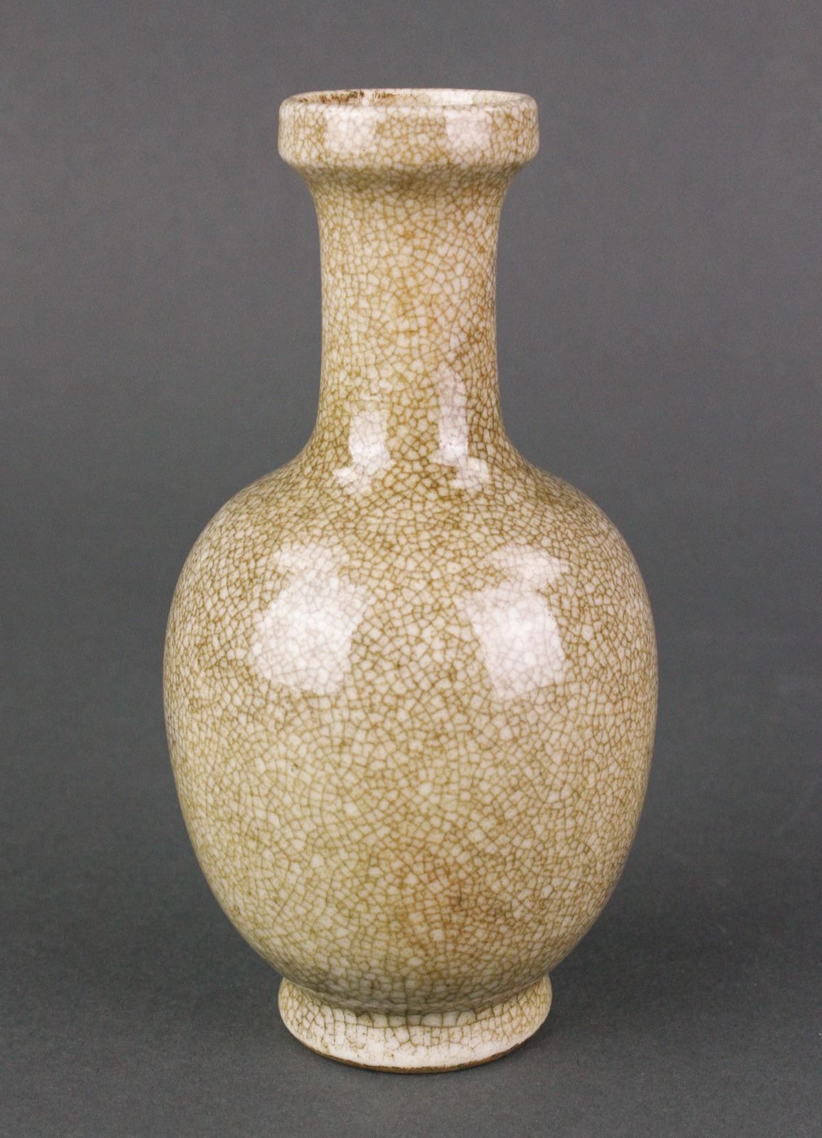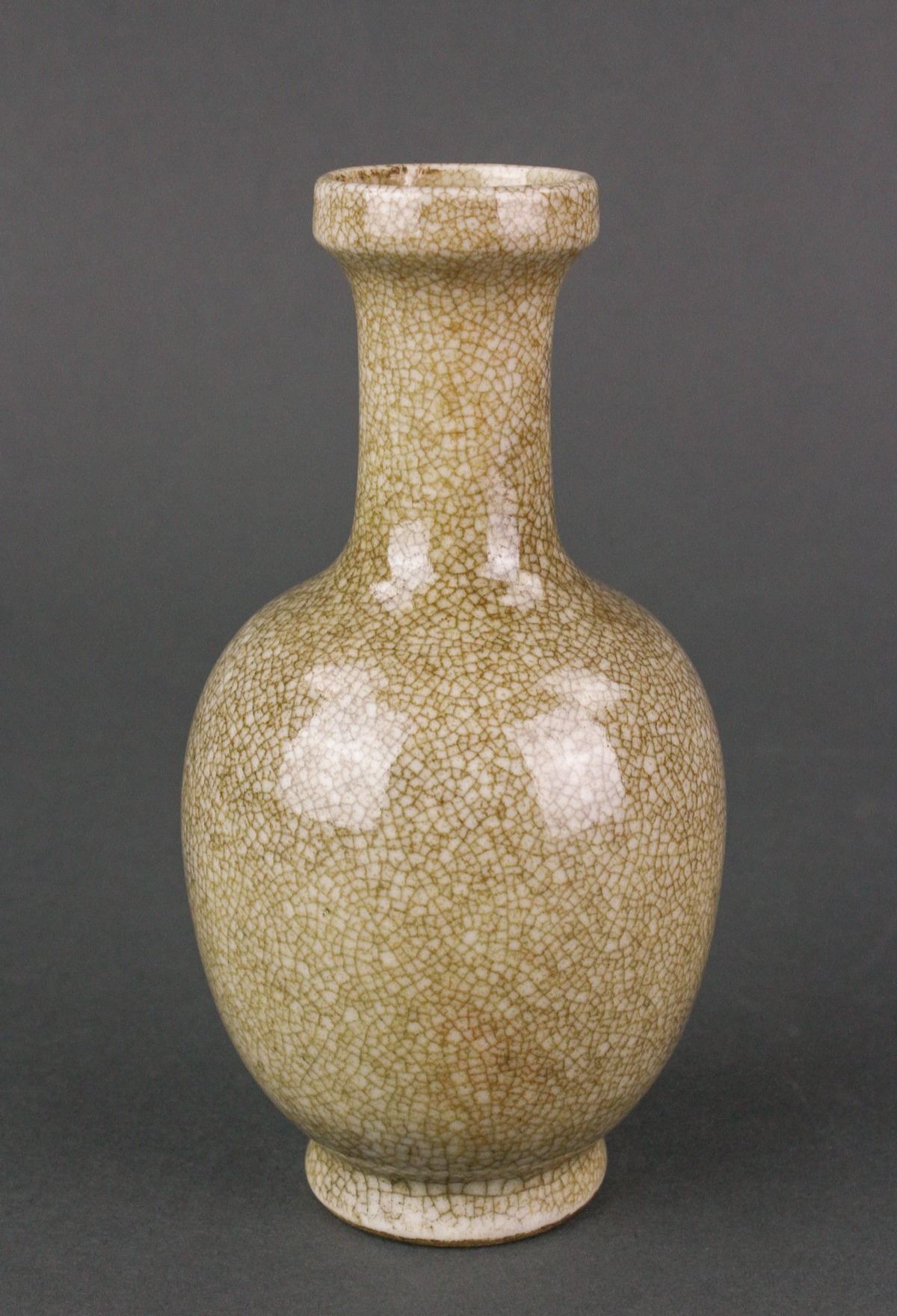 Chinese crackled porcelain vase; 18th or 19th century; of oval body with cylindrical neck and plate-shaped mouthrim; covered with crackled glaze on body; H: 11 cm, D: 5 cm, 126 grams