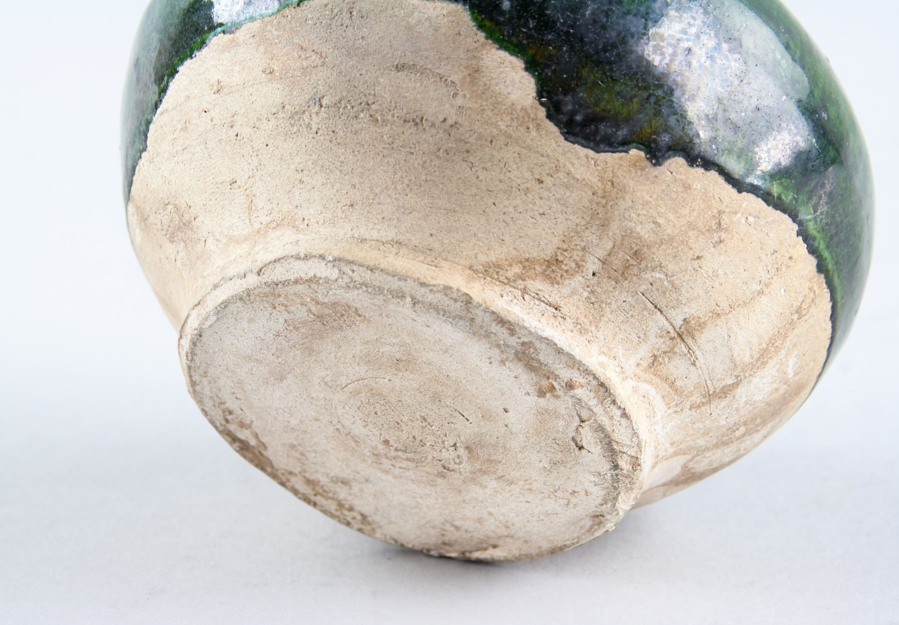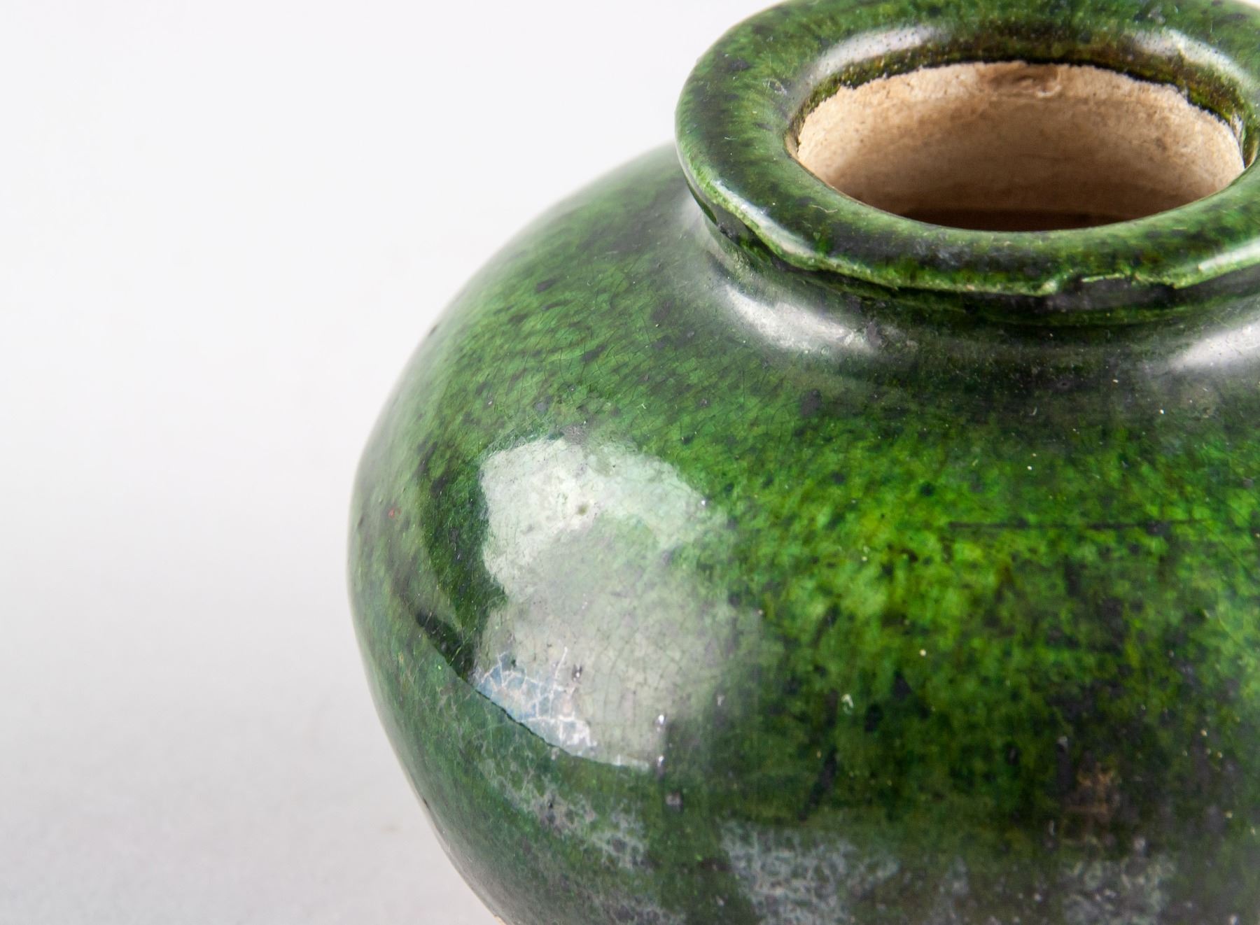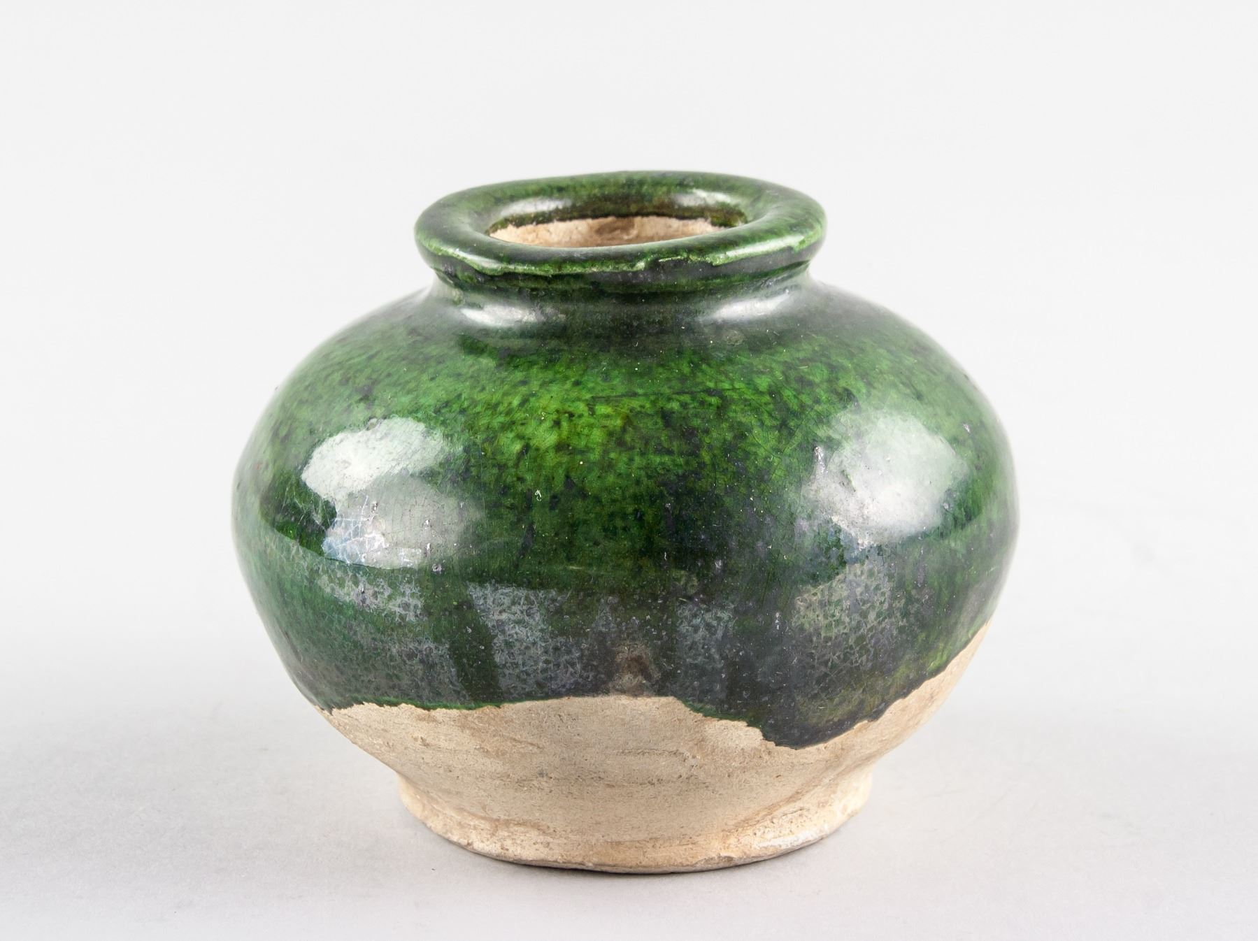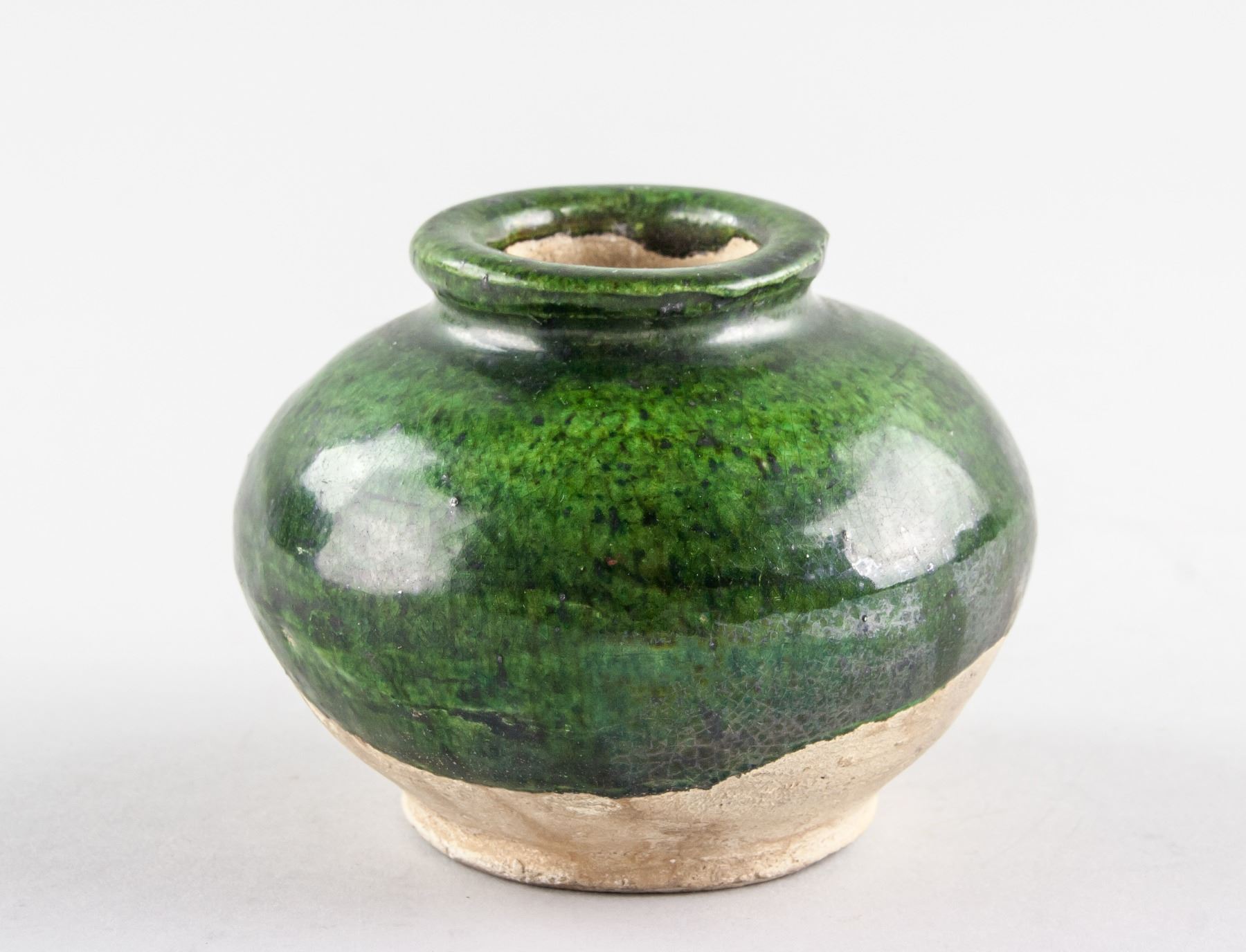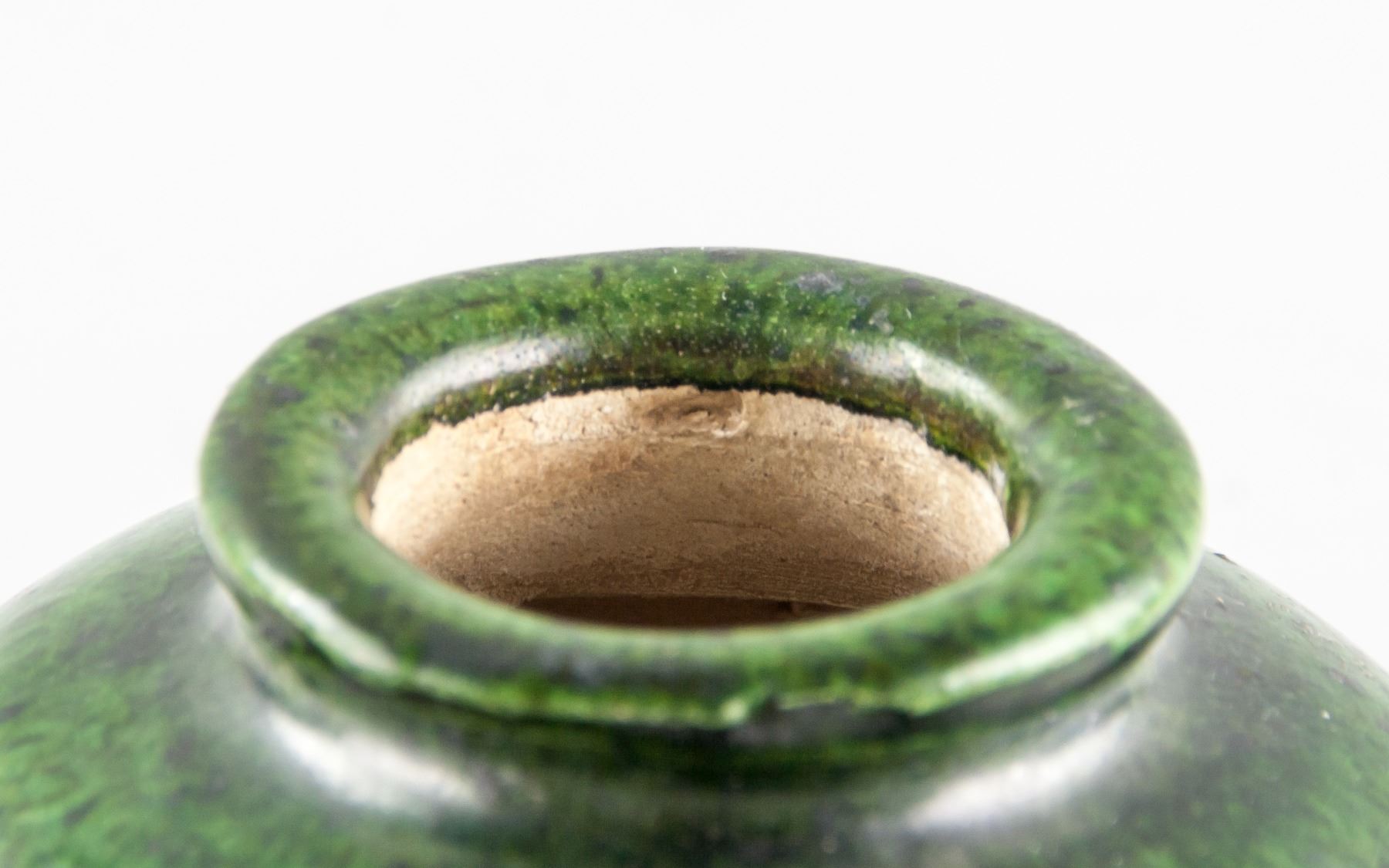Chinese green pottery jar; of compressed globular body; covered by spinach green glaze; 6 cm x 9.5 cm, 214 grams
