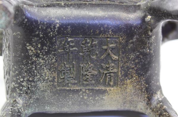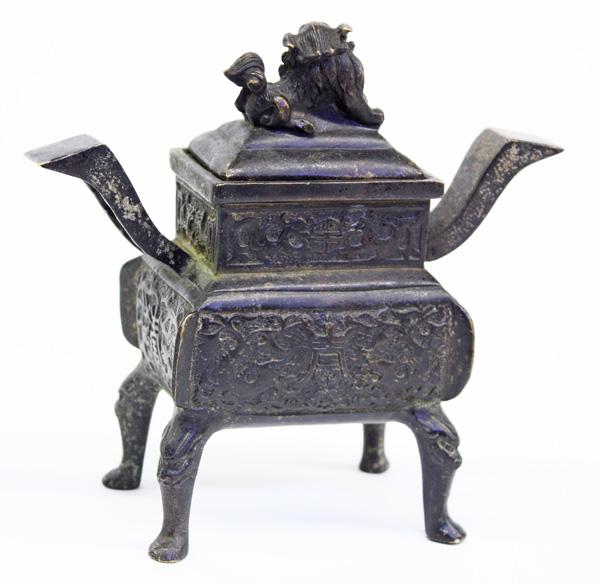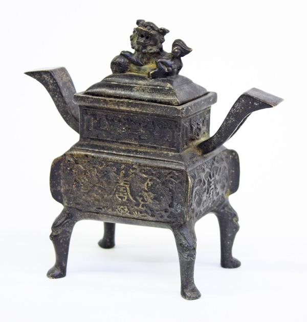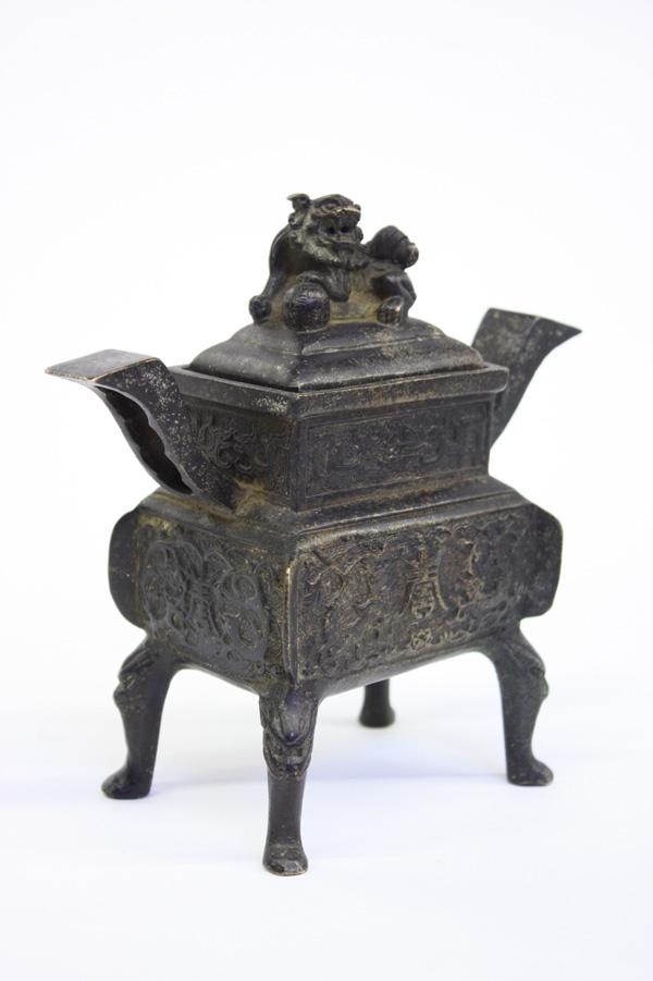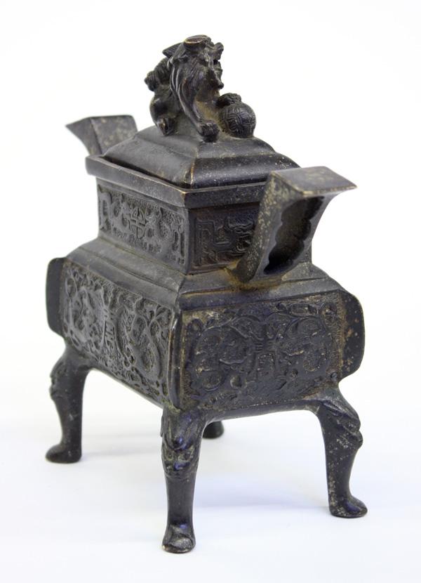 Chinese covered metal 'ding', the body of rectangular section cast with registers featuring confronting zoomorphs flanking shou characters, accented by flanges and upward turned shaped handles, rising from four shaped animal form supports, underside with apocryphal Qianlong mark; together with a fitted lid surmounted with a fu-lion finial, overall: 6.5''h x 6.5''w