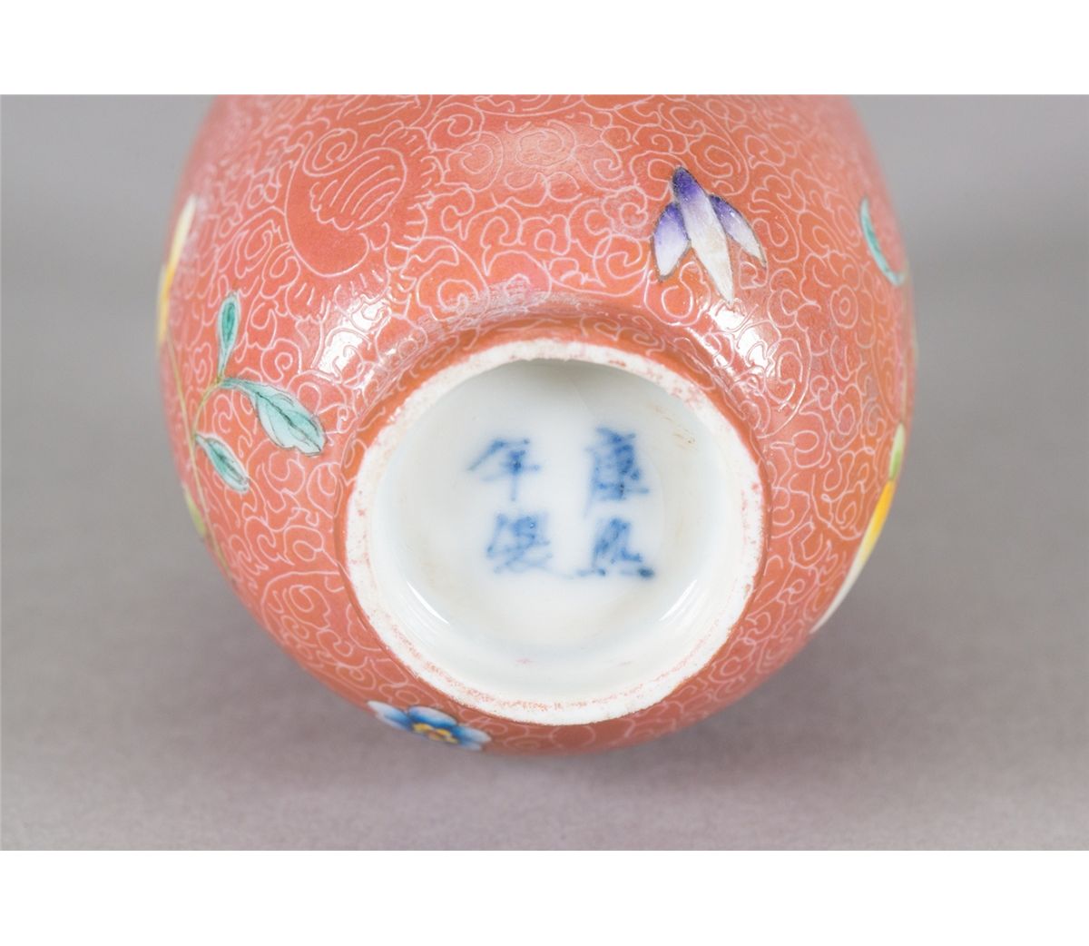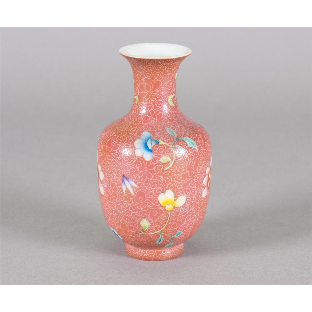 Chinese small peach bloom porcelain vase; of baluster form; of peach bloom ground; featuring orchid patterns on body; four-character Kangxi mark on base; H: 13 cm, W: 7 cm, 143 grams