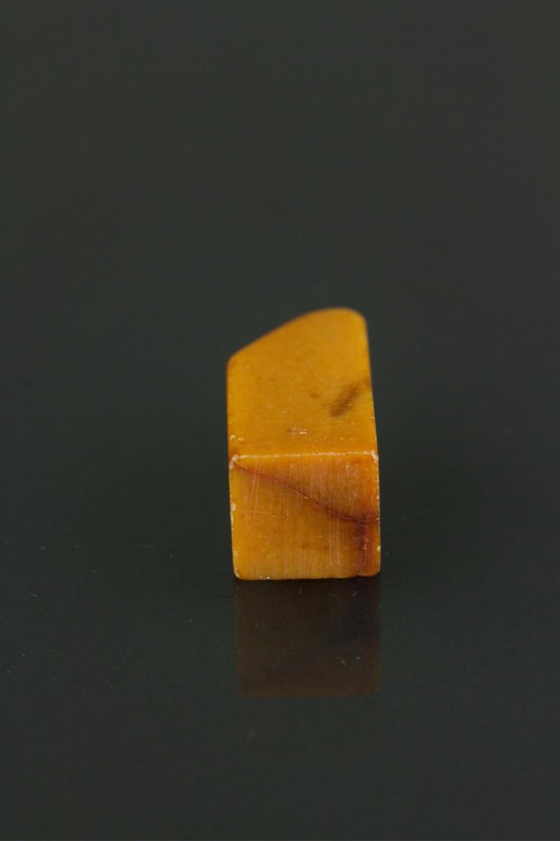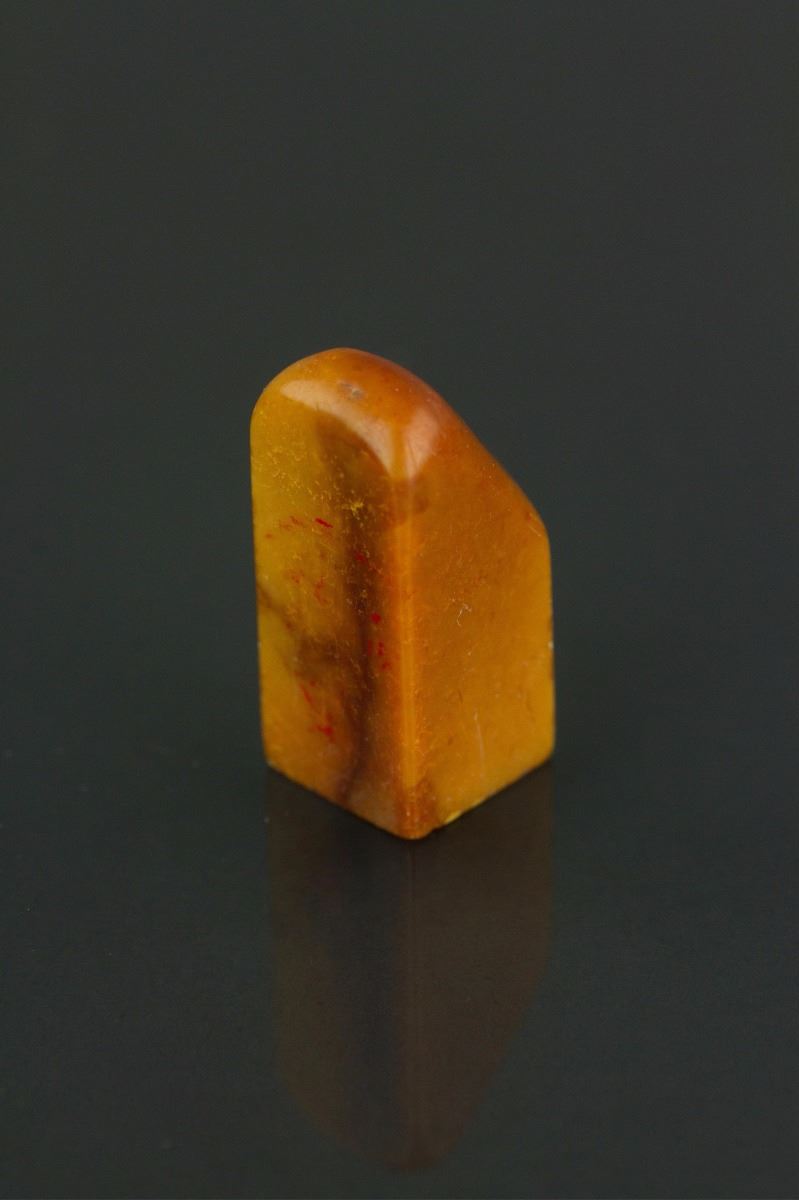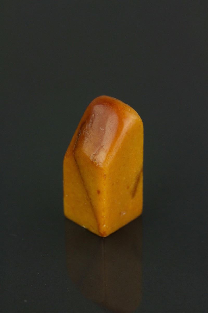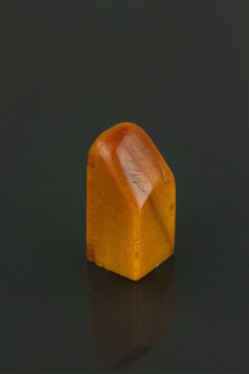 Chinese small Tianhuang stone seal; of rectangular section with uncarved seal face; the top of irregular shape; of yellowish-orange tone with amber-colored suffusions; H: 2.2 cm, W: 0.9 cm, L : 1 cm, 5 grams