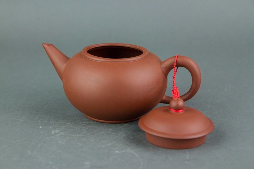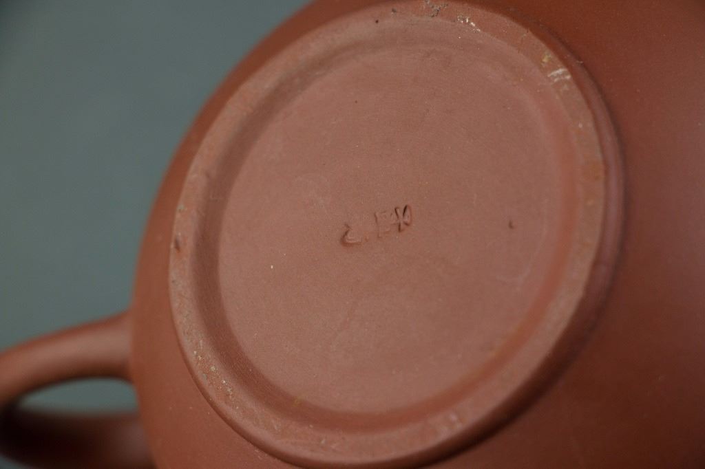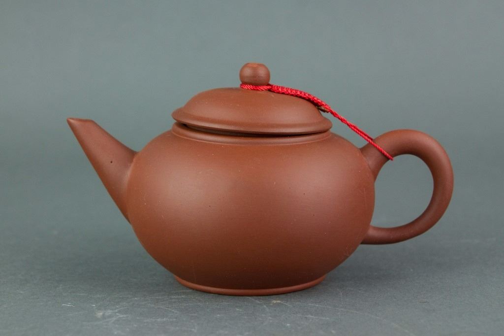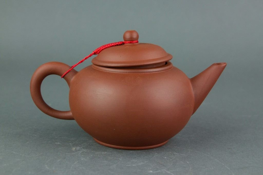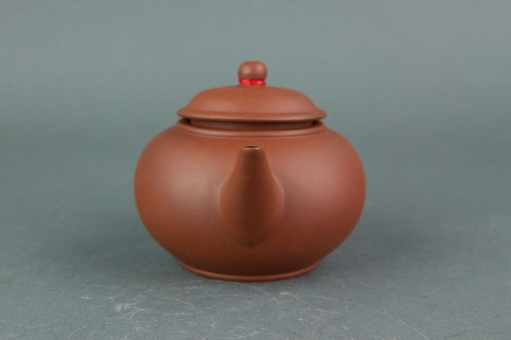 Chinese small Zisha teapot; of compressed globular body flanked by curved handle and straight spout; two-character artist mark on base; H: 9 cm, W: 15 cm, 158 grams