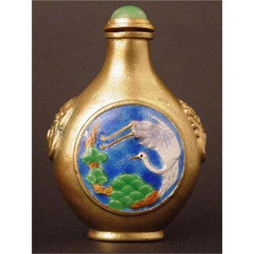 Snuff bottle with painted enamel decoration on front and back, and high relief lion figures on the sides. Decorated with traditional Chinese motif of long-legged white aquatic birds in enamel within a circle. Has bronze and jade stopper with spoon. Snuff (powdered tobacco) began to be used in China in the 1600's, as a substitute for smoking which was illegal. Snuff however, was perfectly acceptable, fashionable and considered to have medicinal properties. Antique snuff bottles were made our of a wide variety of materials including: porcelain, glass, jade, lacquer, hardstone, ivory, coral, copper, etc. This one appears to be metal. Bottle comes in a white, padded, silk-covered Chinese box.