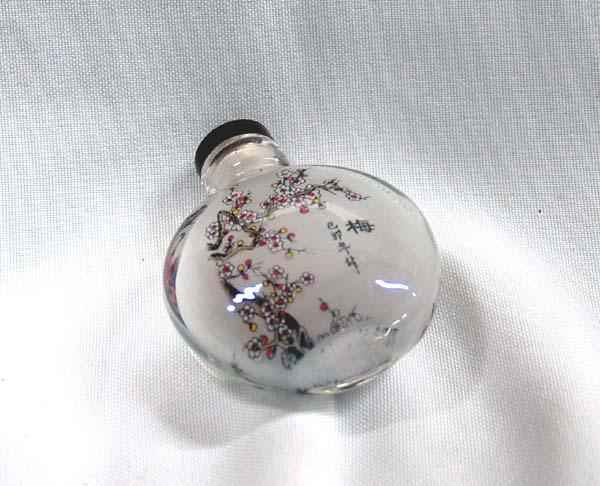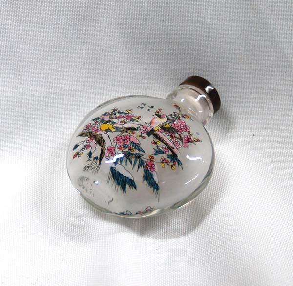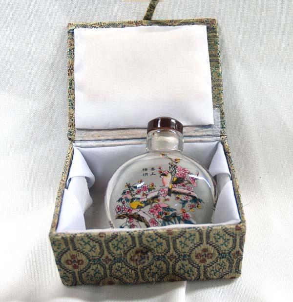 Chinese Snuff Bottle In Box. Measures approx. 2 3/4''H x 2 1/8''W. Hand painted on the inside of the bottle. Buyers Pay Actual Shipping and Handling Charges(see terms and conditions for more information).