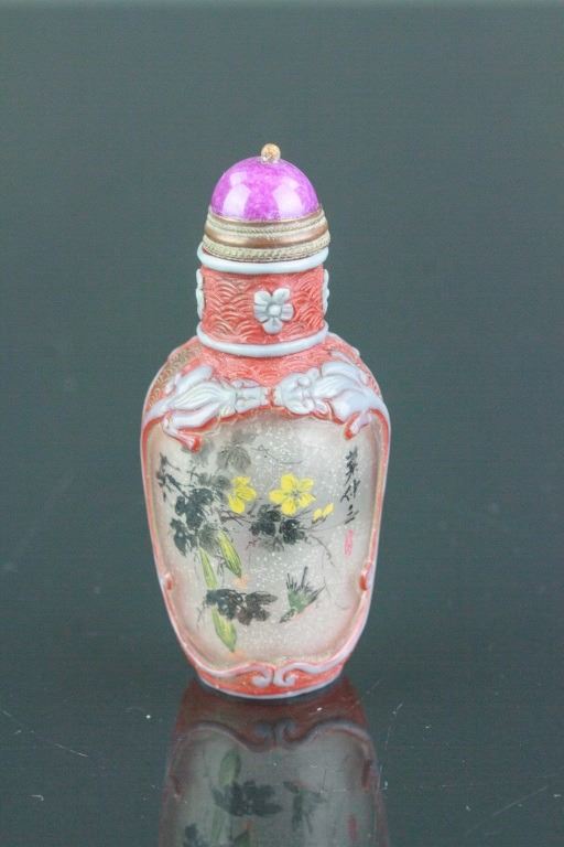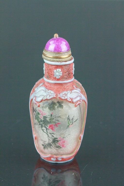 Chinese Peking glass snuff bottle; of rouleau form with lid; carved floral pattern on exterior side; with inner painting of birds and flowers; signed Ye Zhongsan; H: 7 cm, D: 2.5 cm, 63 grams