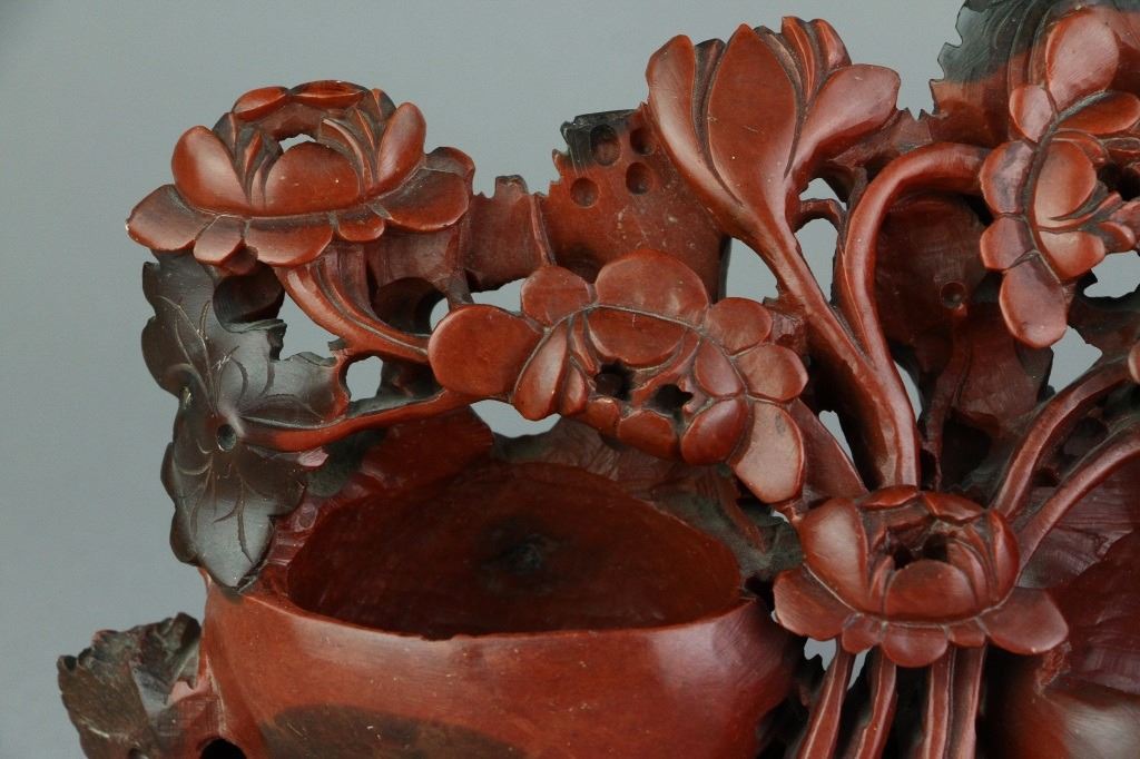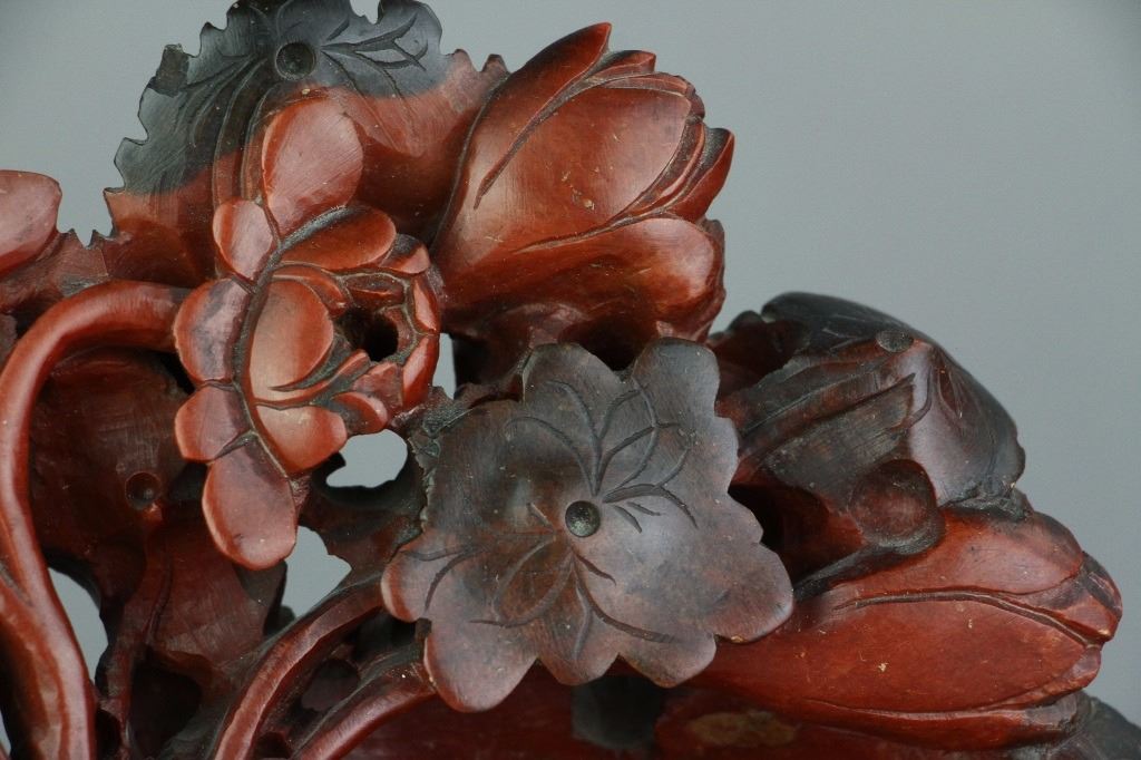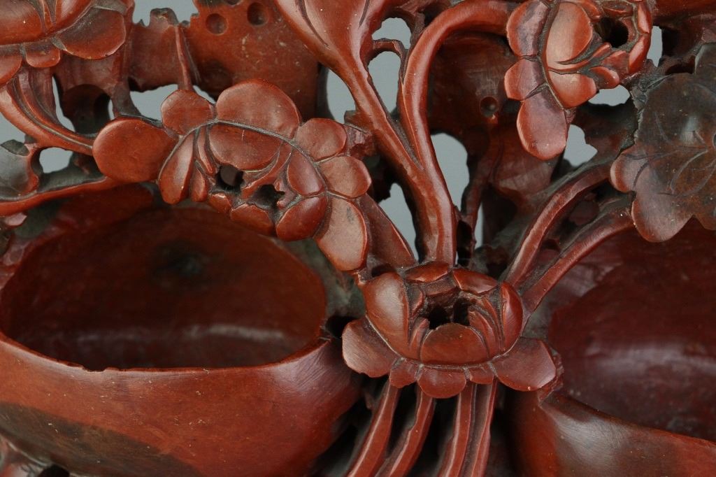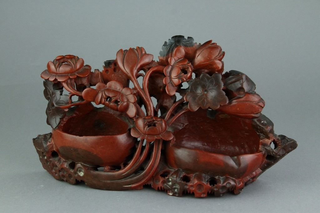 Chinese soapstone carved conjoined waterpot; openwork carved with cluster of lotus and ovoid shaped water containers; L: 26 cm, H: 16 cm, 1497 grams