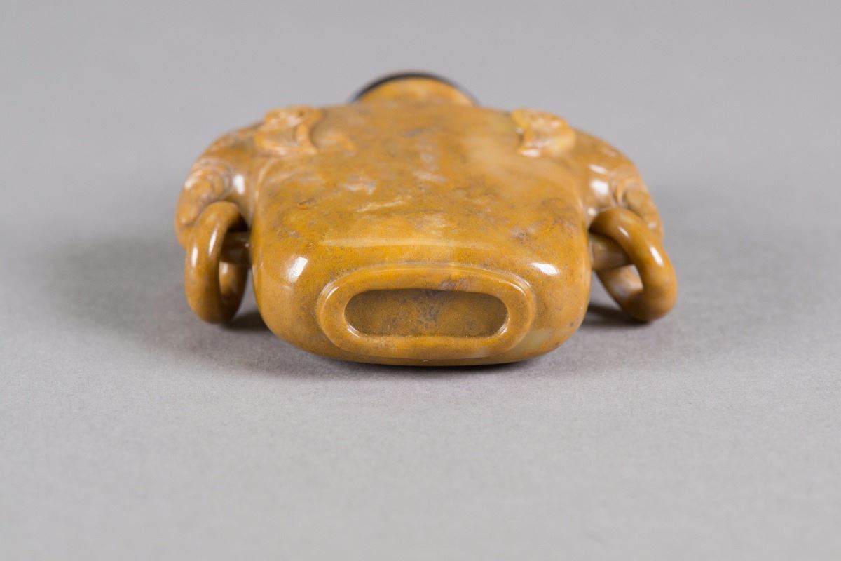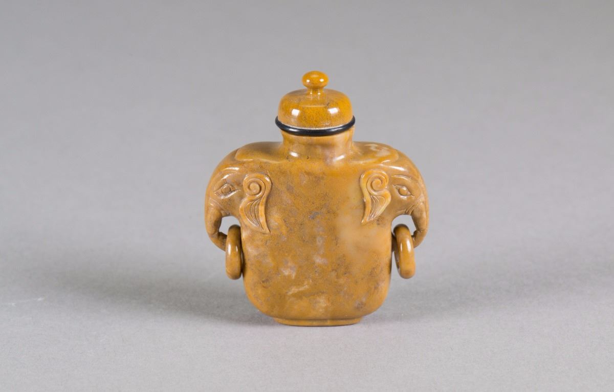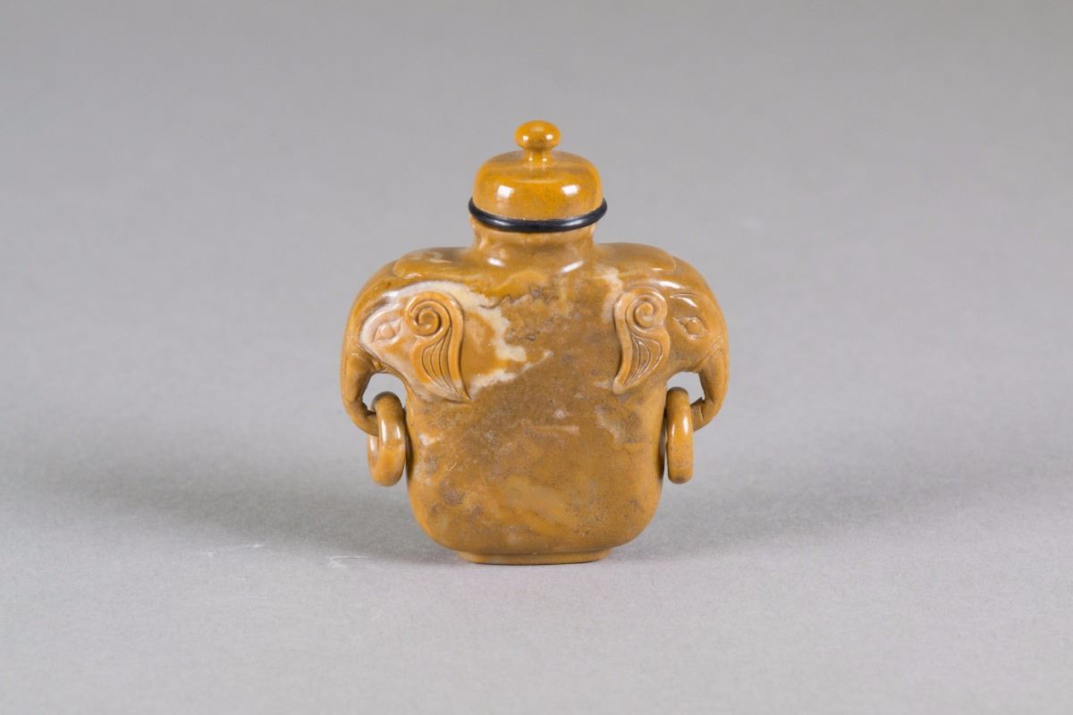 Chinese soapstone carved snuff bottle; featuring two elephant ring handles on sides; of light brown tone; H: 7.5 cm, W: 6 cm, 82 grams