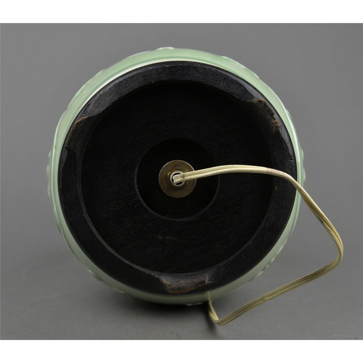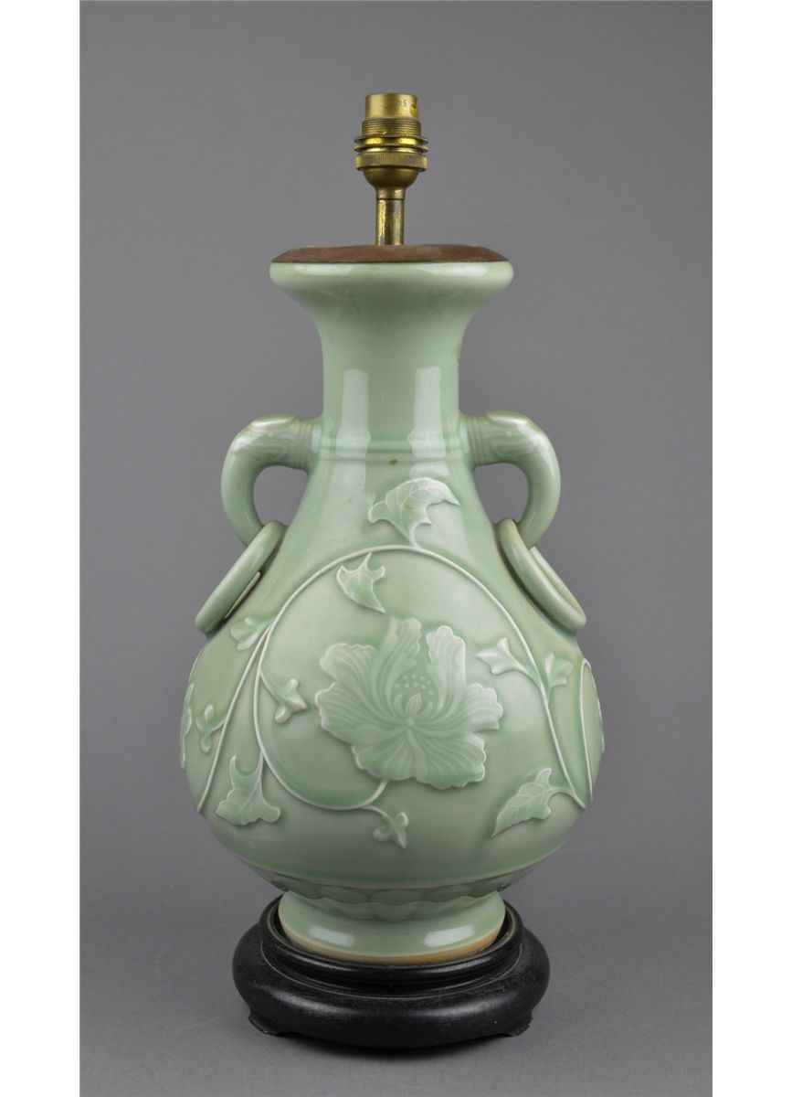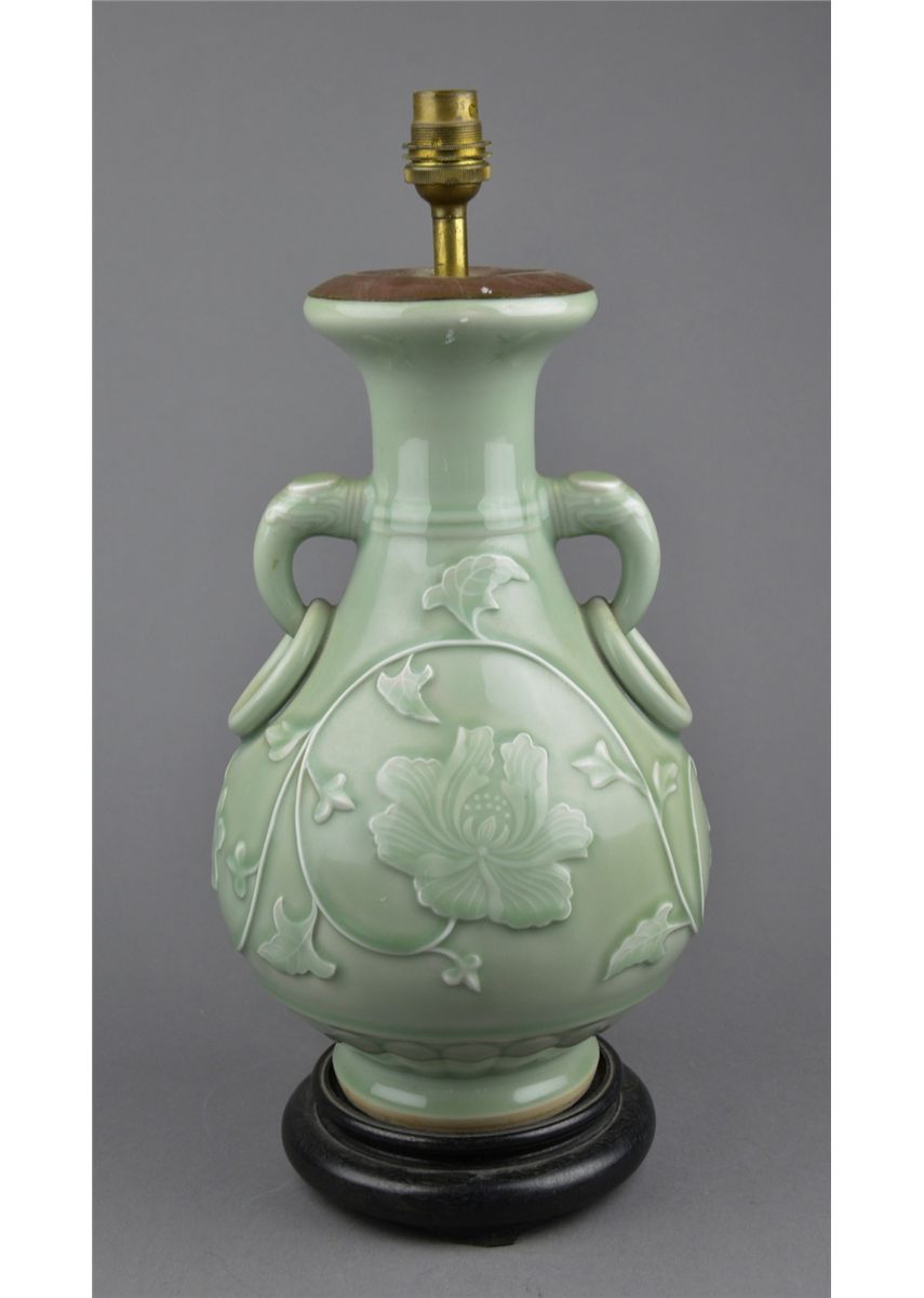 Chinese Song-style celadon glazed porcelain converted lantern; featuring lotus spray borne on scroll with foliate-shaped leaves; neck featuring handles; H: 42 cm, D: 20 cm, wood base