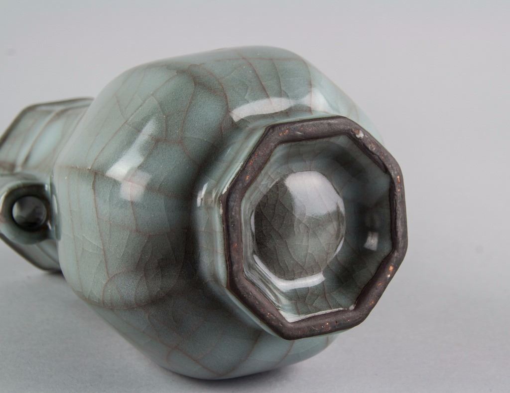 Chinese Song-style Guanyao porcelain vase, of sectioned Hu shape form, flanked with pair of lobbed handles, and covered in crackled glaze; H: 18 cm, D: 11 cm, 634 grams (chip and repair on rim)