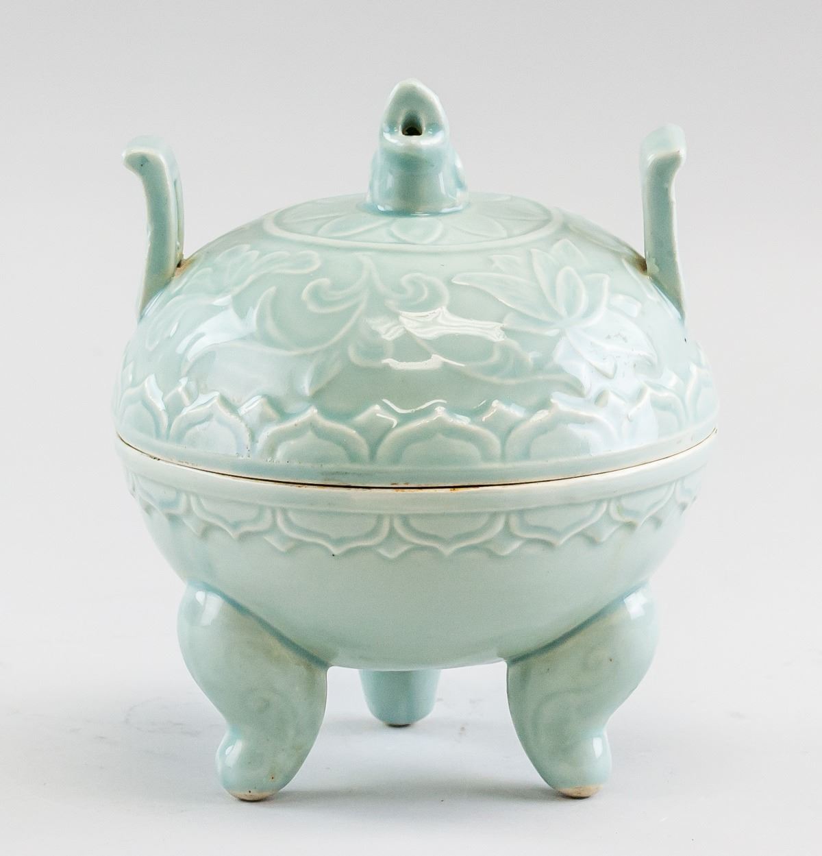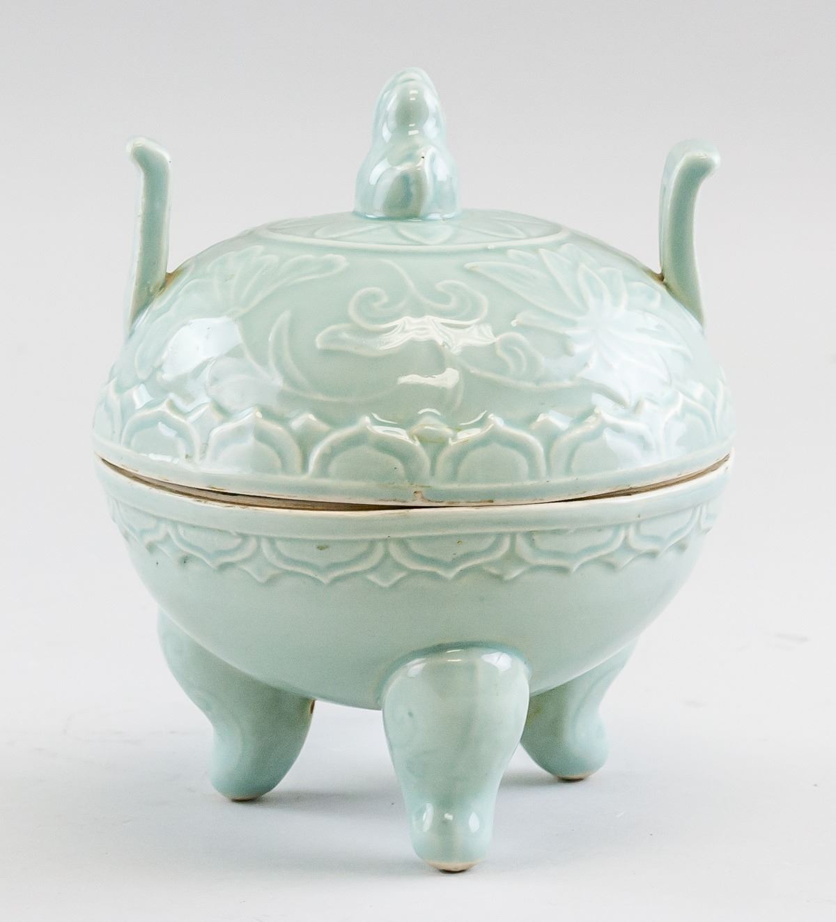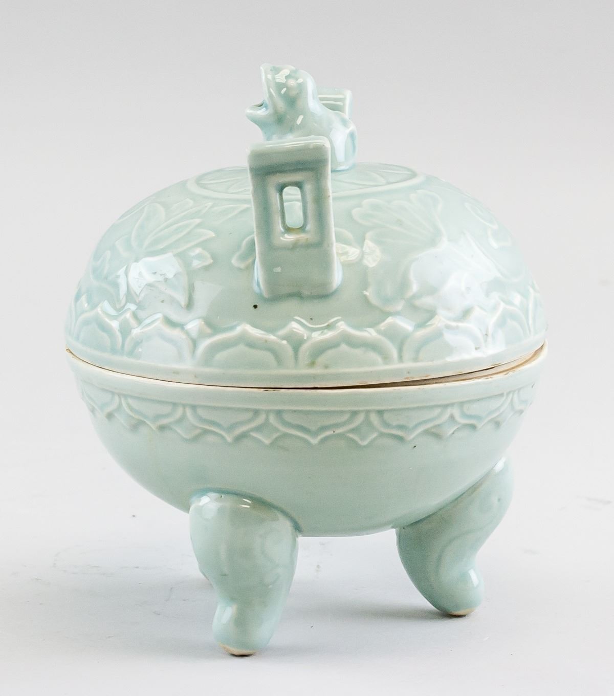 Chinese Song style Guan porcelain censer. of globular body, supported on three legs. Lid surmounted by a beast, flanked with two handles. Carved with lotus pattern on surface. 18 x 15 cm, 726 grams