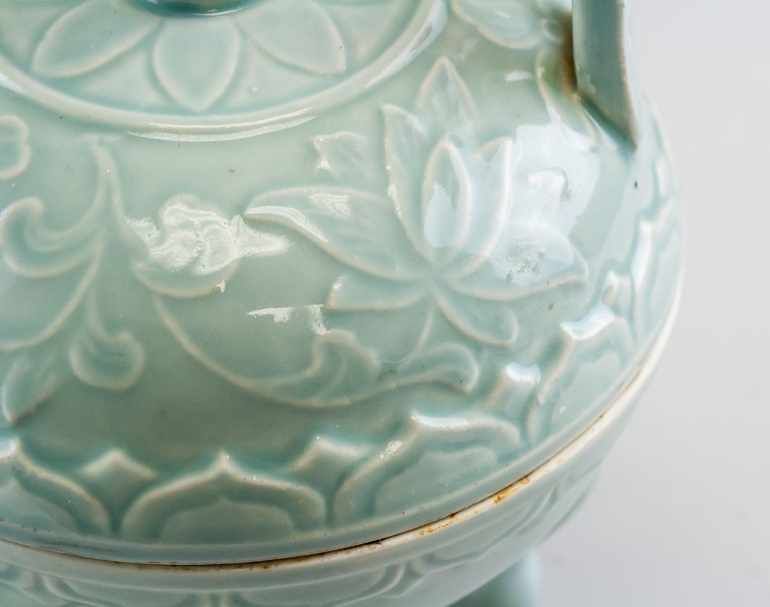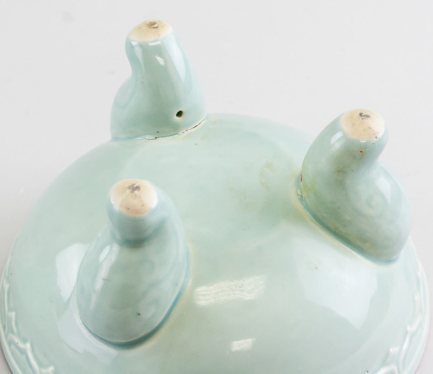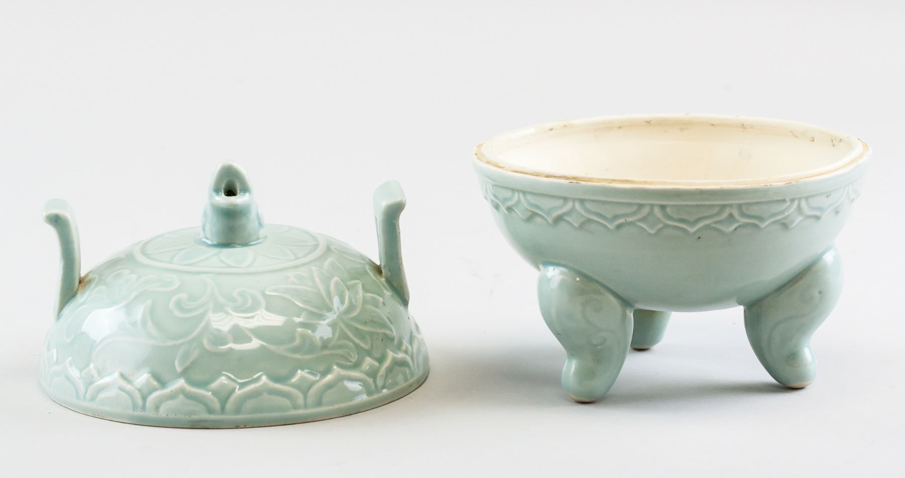Chinese Song style Guan porcelain censer. of globular body, supported on three legs. Lid surmounted by a beast, flanked with two handles. Carved with lotus pattern on surface. 18 x 15 cm, 726 grams