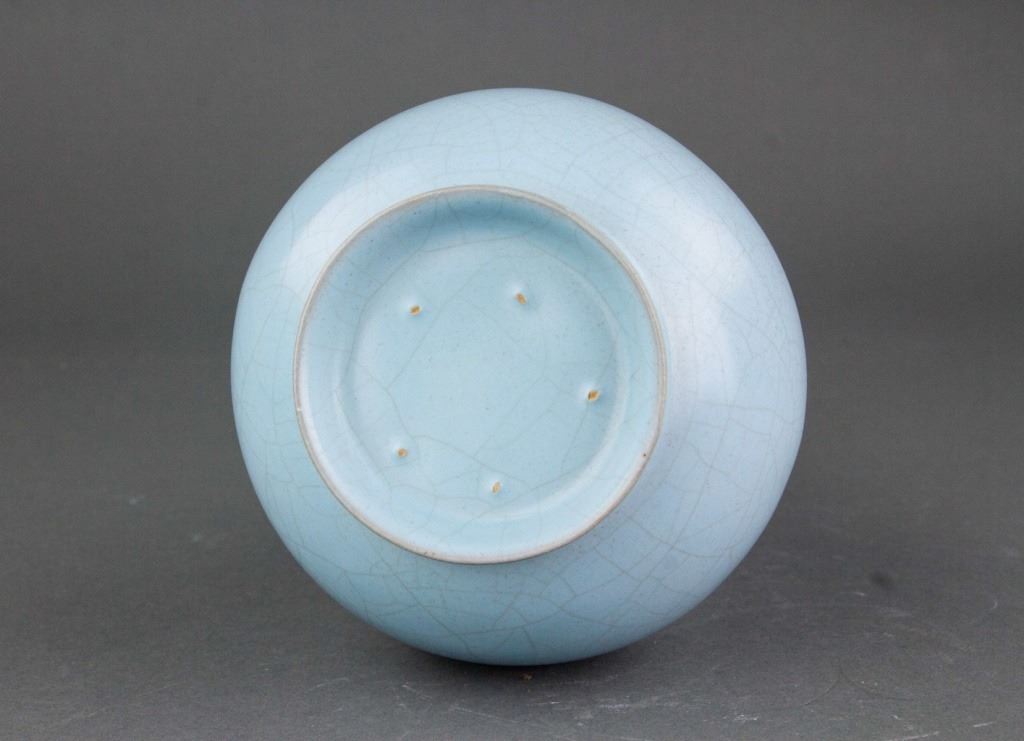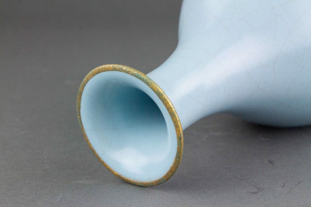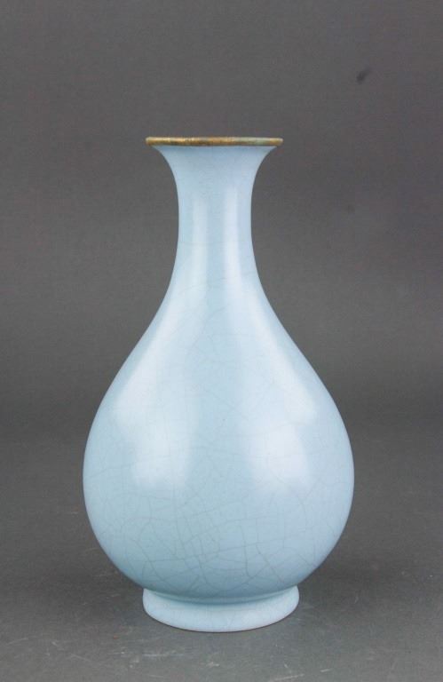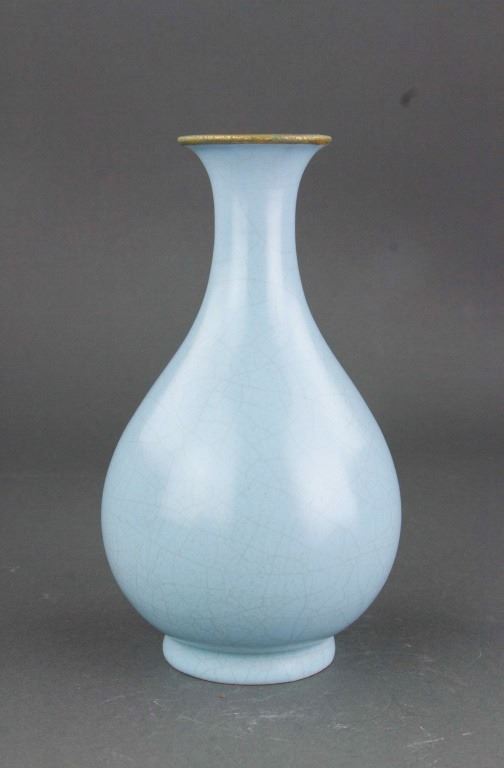 Chinese Song Guanyao style porcelain vase; of pear-shape body with splayed mouth rim; supported on short foot rim; covered with light blue crackle glaze; H: 18.5 cm, W: 10.5 cm, 453 grams