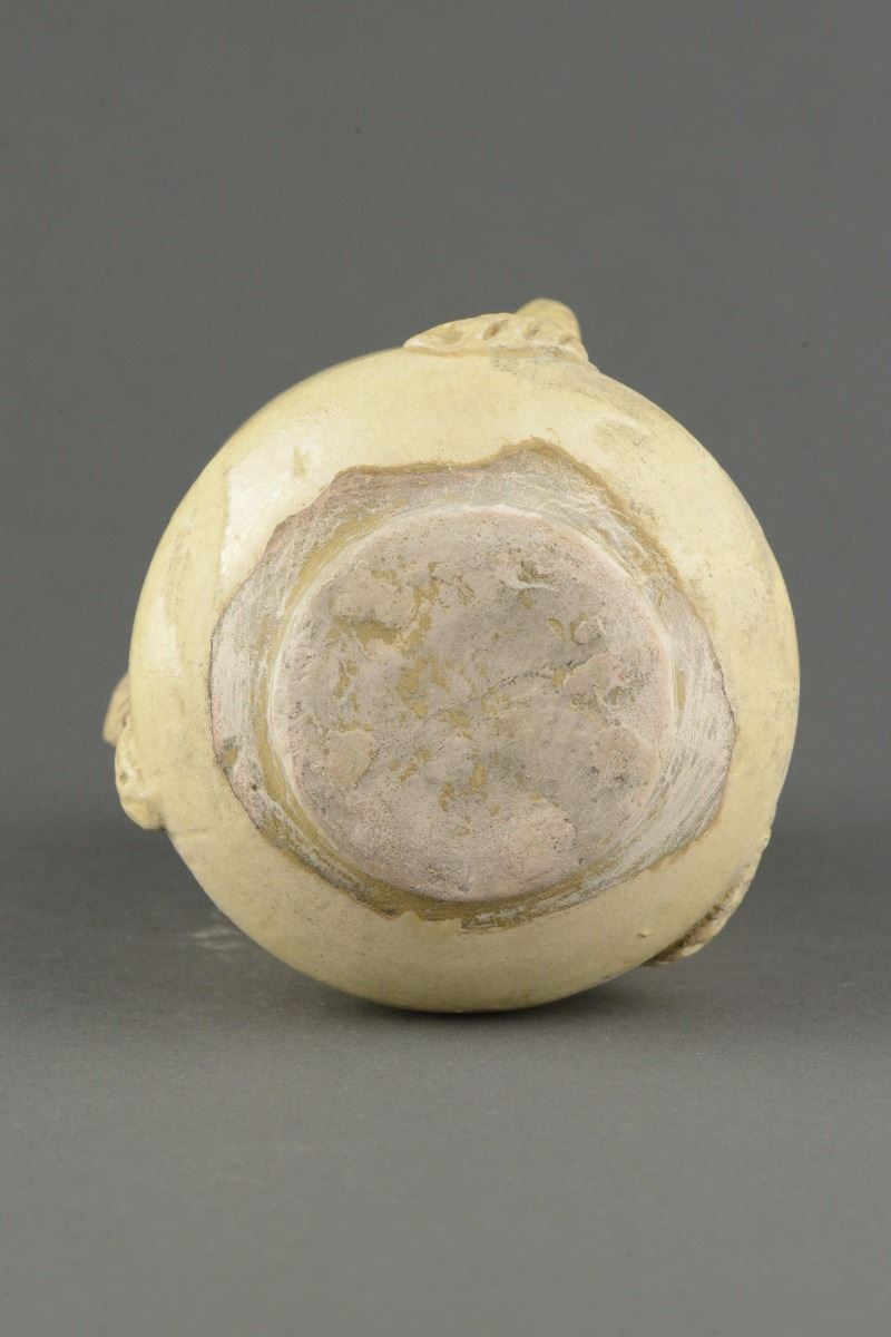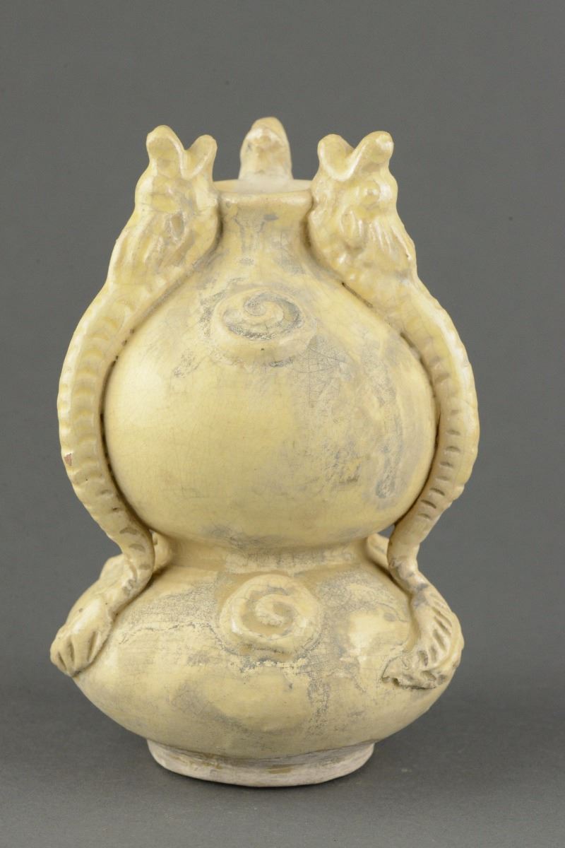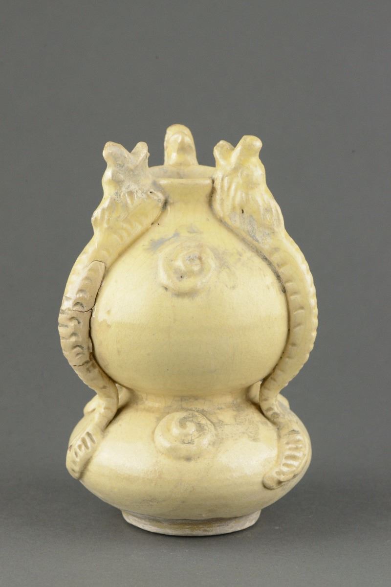 Fine Chinese Song style pottery jar, of double gourd form, flanked with three vertical positioned sinuous dragons with open mouths. With clear crackled glaze. H: 15.5 cm, D: 10 cm, 480 grams. Provenance: T. Ng Collection Toronto.