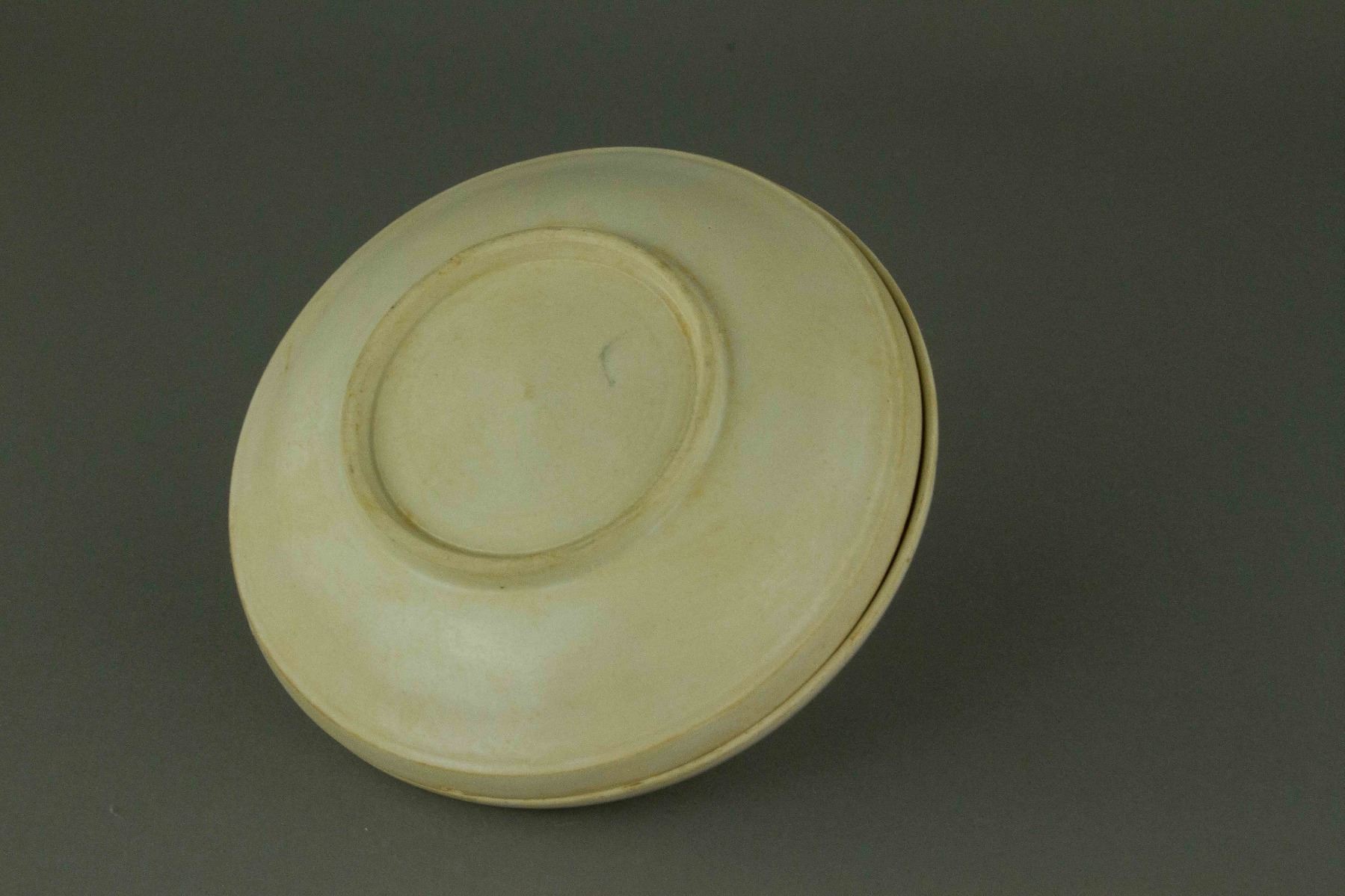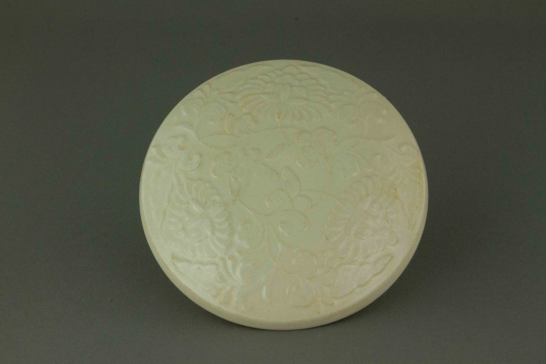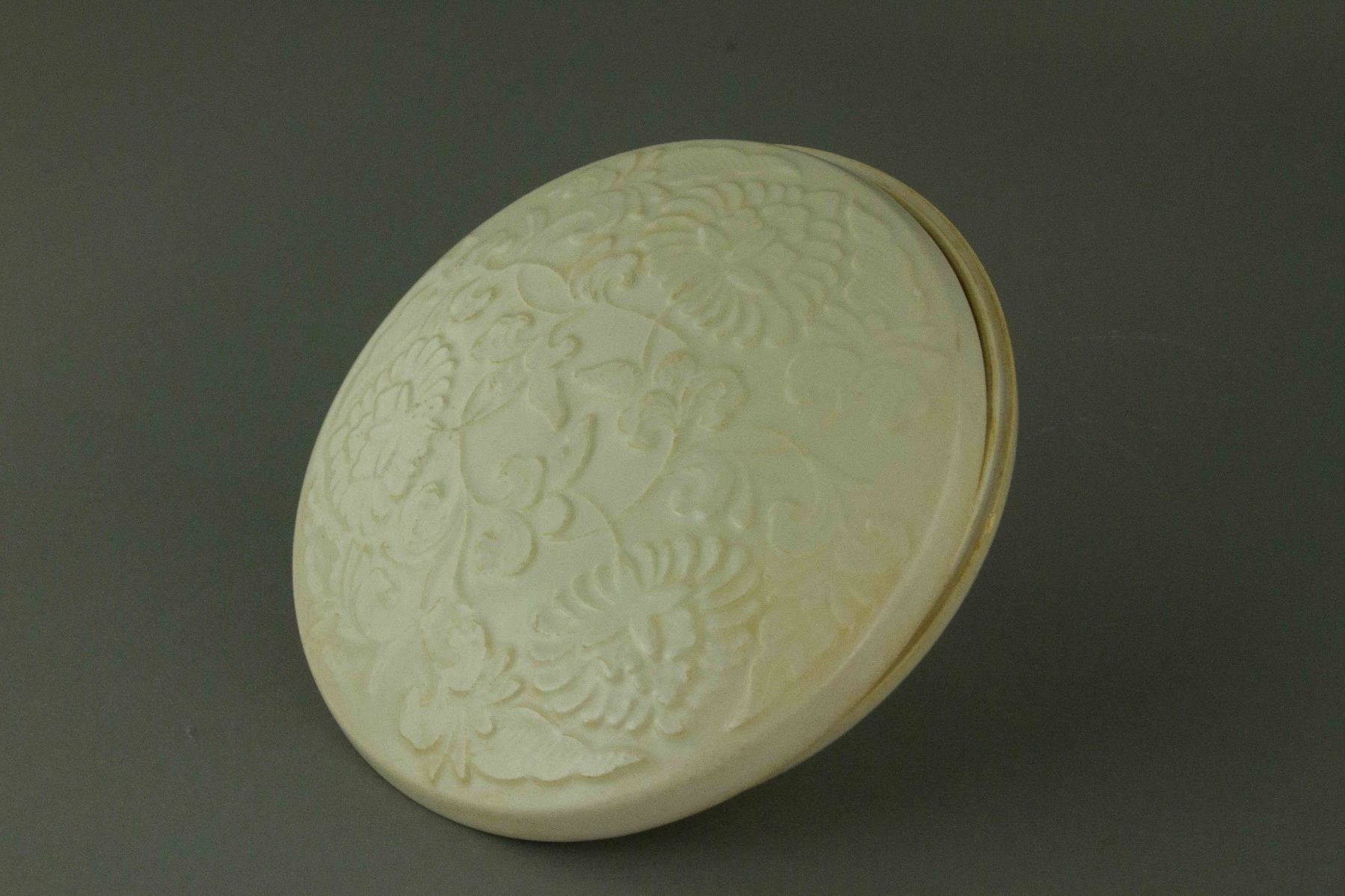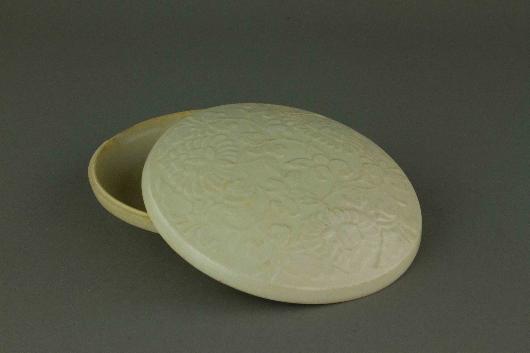 Chinese Song or Yuan style Dingyao porcelain cosmetic box; of flatten circular form; carved in low relief with chrysanthemum scrolls; covered in white glaze; H: 4 cm, D: 12 cm, 225 grams. PROVENANCE: Private collection, Circa 1980 (Nagoya, Japan)