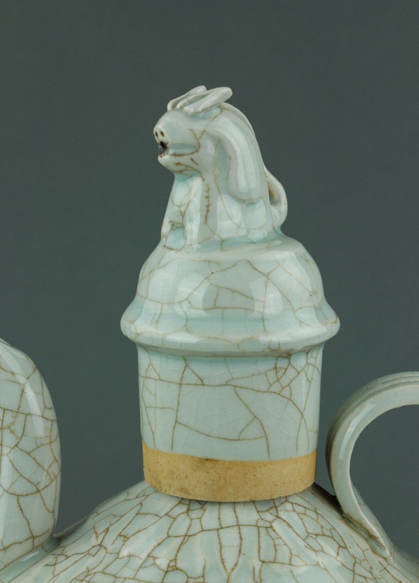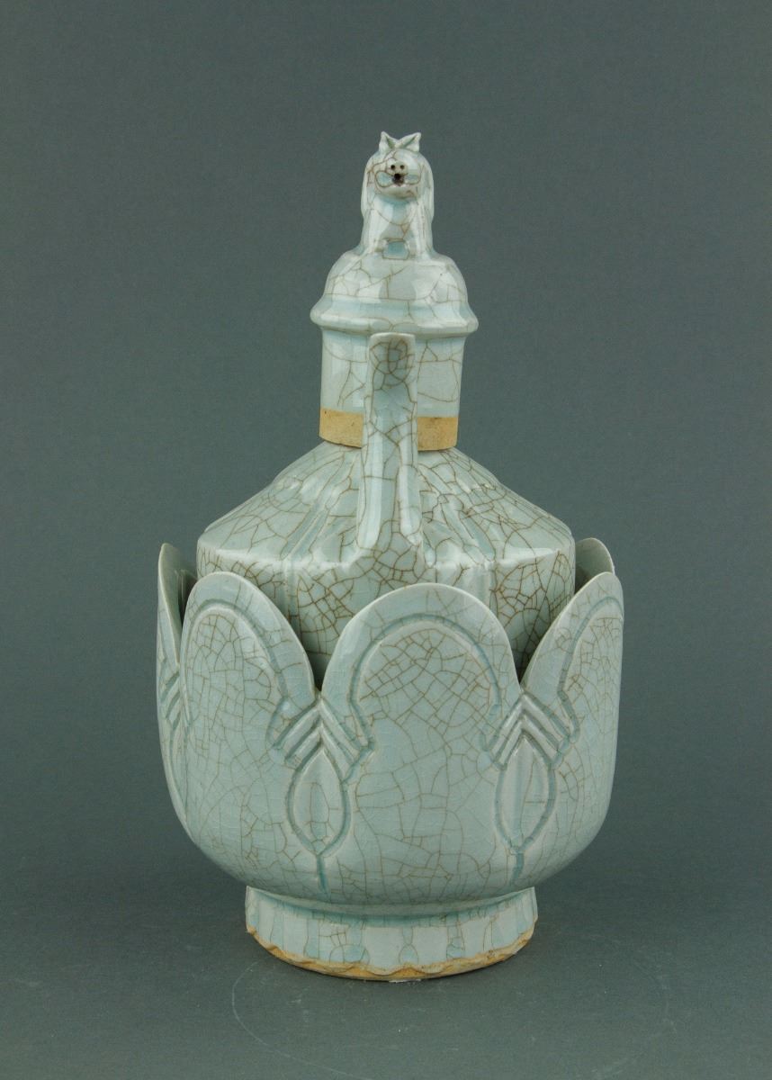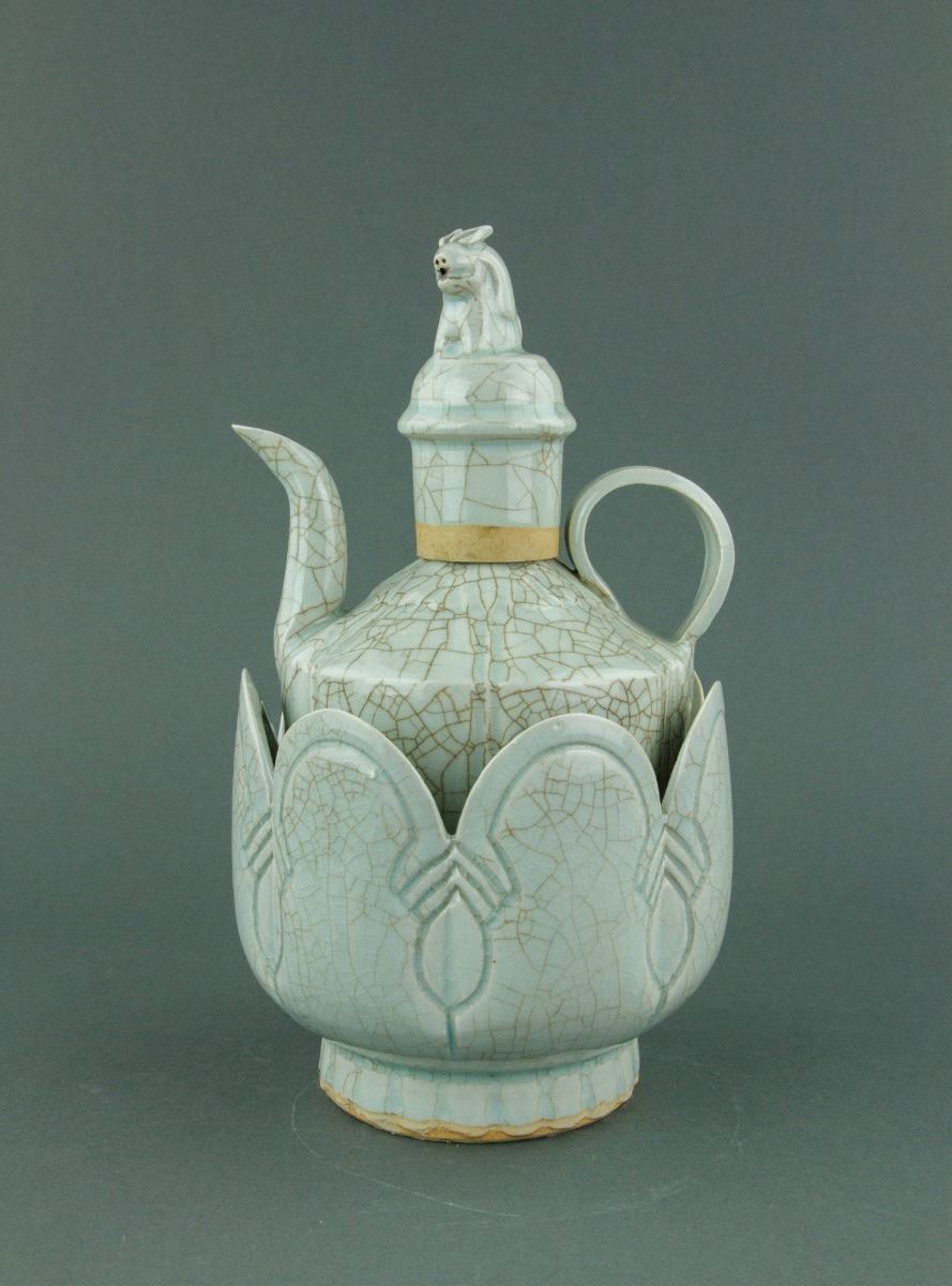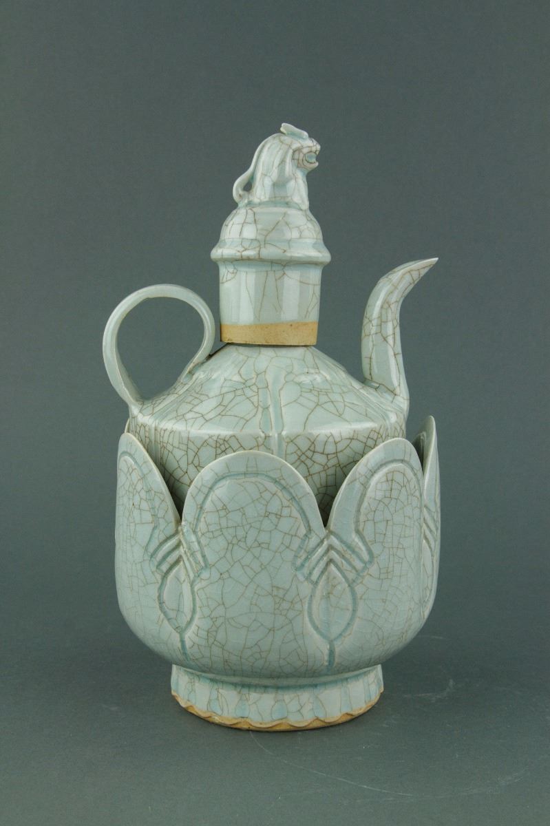 Chinese Song or Yuan style porcelain ewer and matching bowl; the melon-shaped body connecting to a cone shoulder and cylindrical mouth; mounted with a cover attached with a mythical beast finial; the warming bowl with lobed sides rising to a scalloped rim; the ewer and bowl are both covered with crackle celadon glaze except the base; H: 30 cm, W: 16 cm, 1953 grams