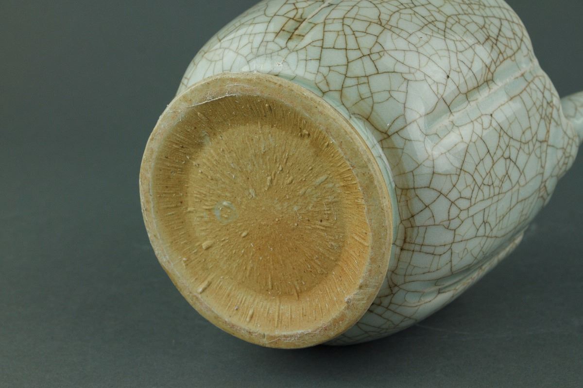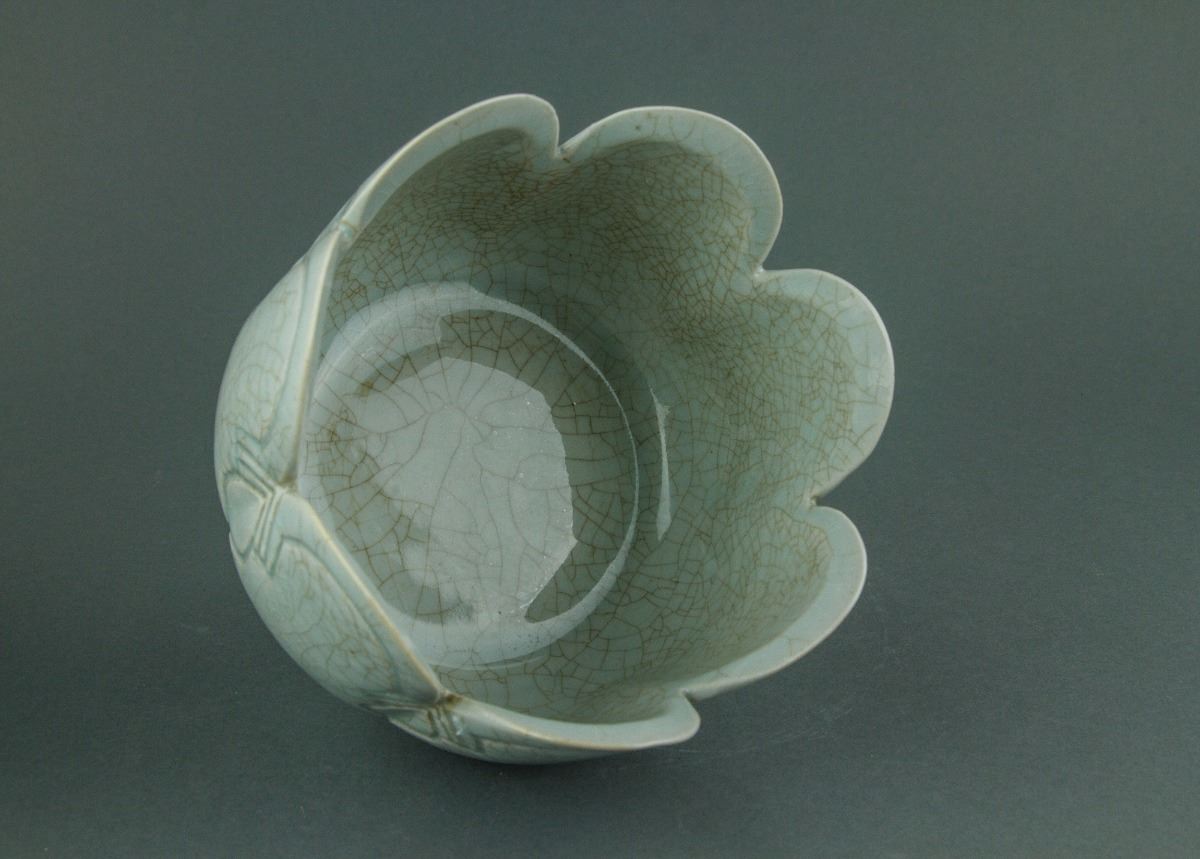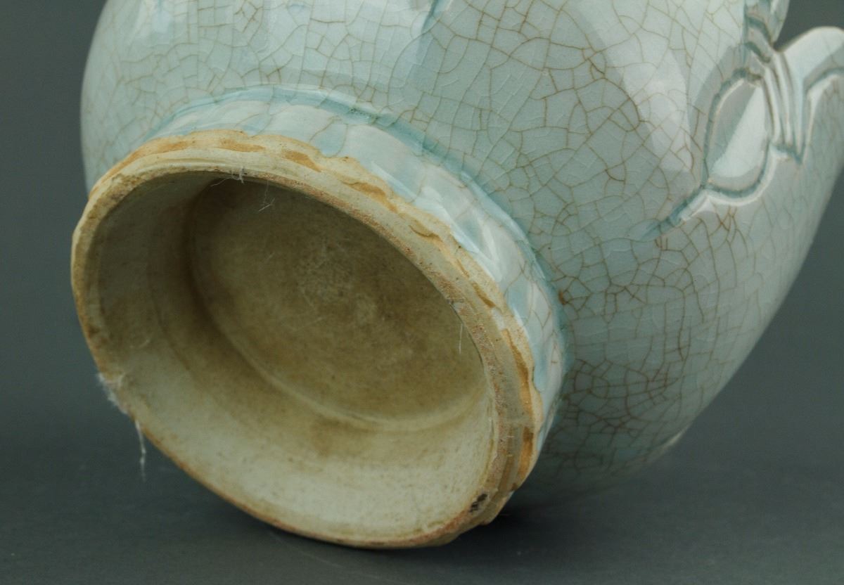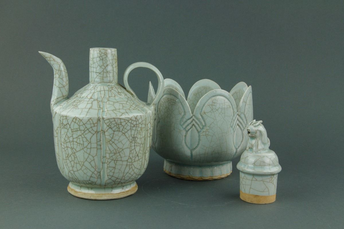 Chinese Song or Yuan style porcelain ewer and matching bowl; the melon-shaped body connecting to a cone shoulder and cylindrical mouth; mounted with a cover attached with a mythical beast finial; the warming bowl with lobed sides rising to a scalloped rim; the ewer and bowl are both covered with crackle celadon glaze except the base; H: 30 cm, W: 16 cm, 1953 grams