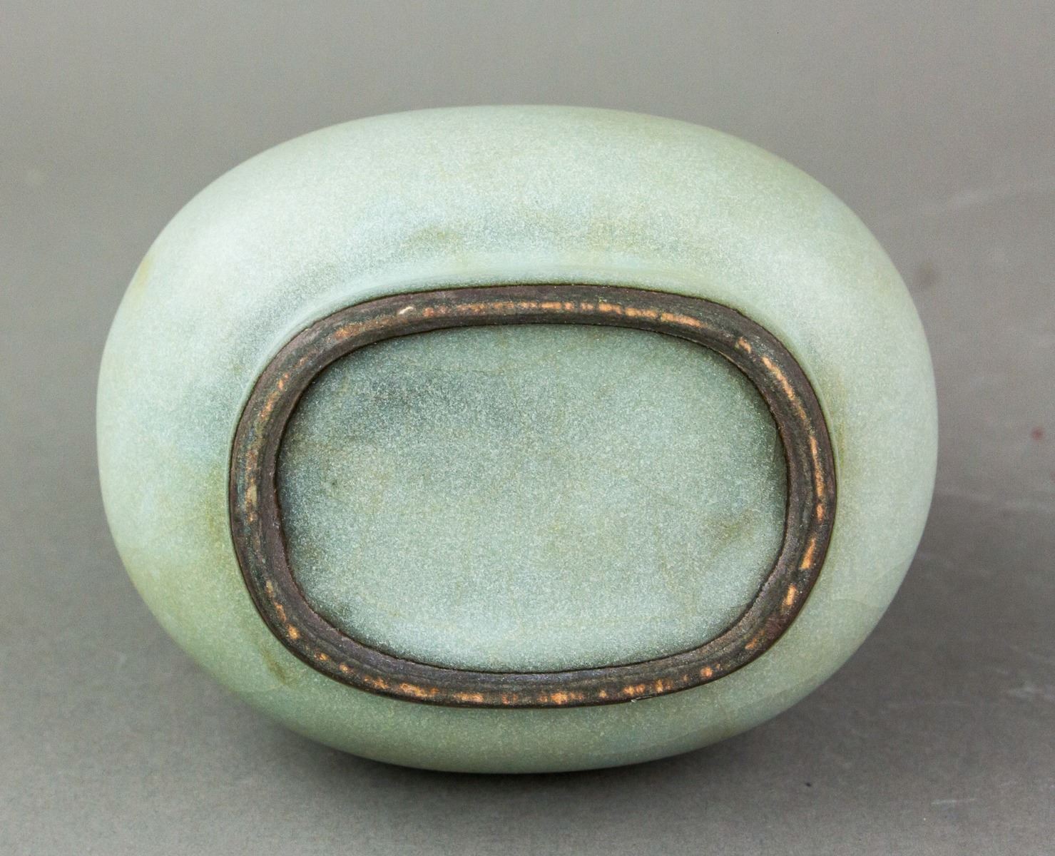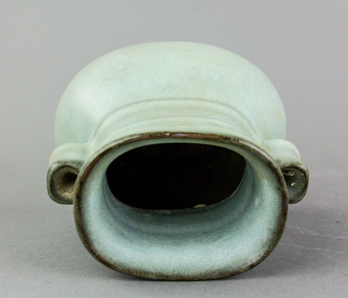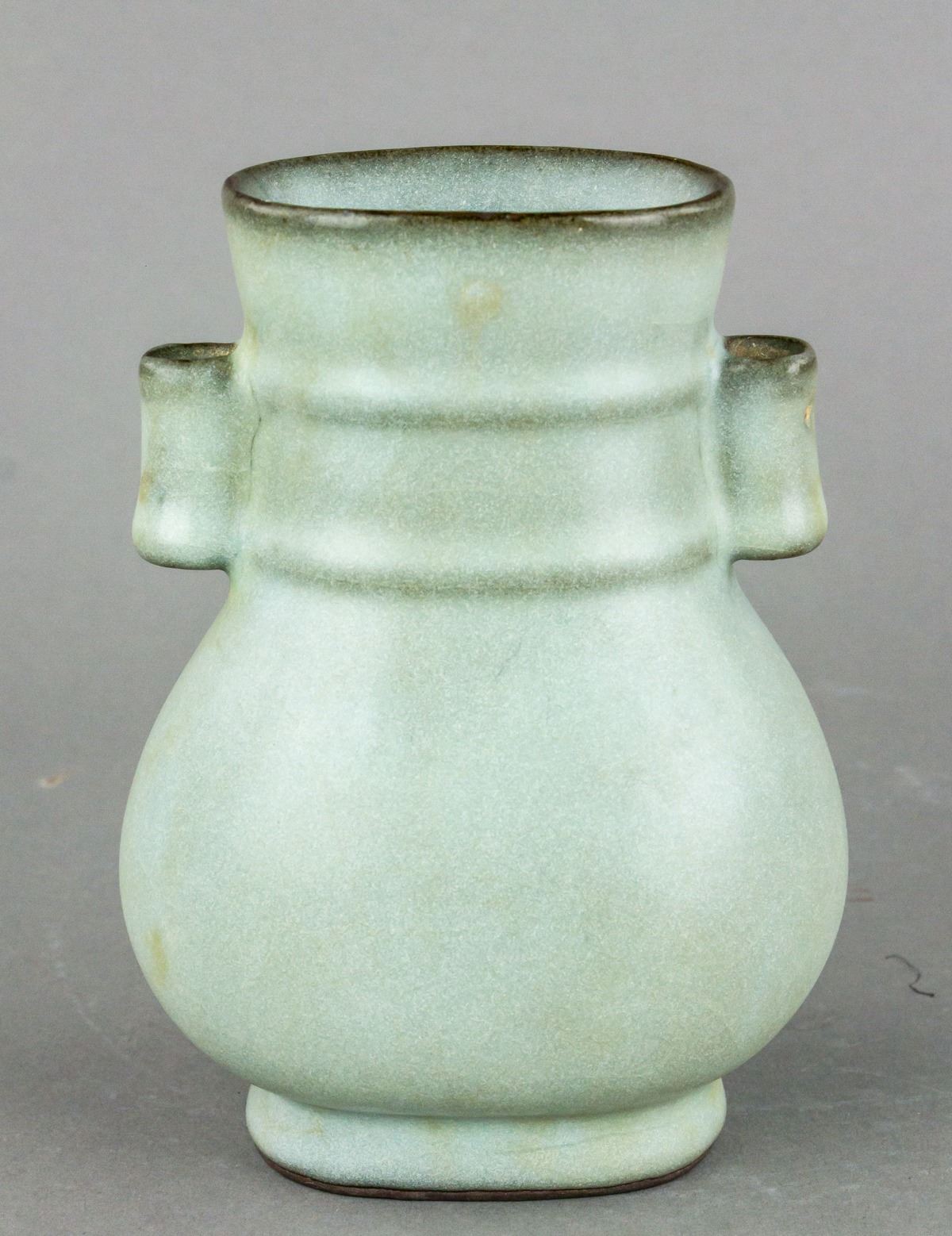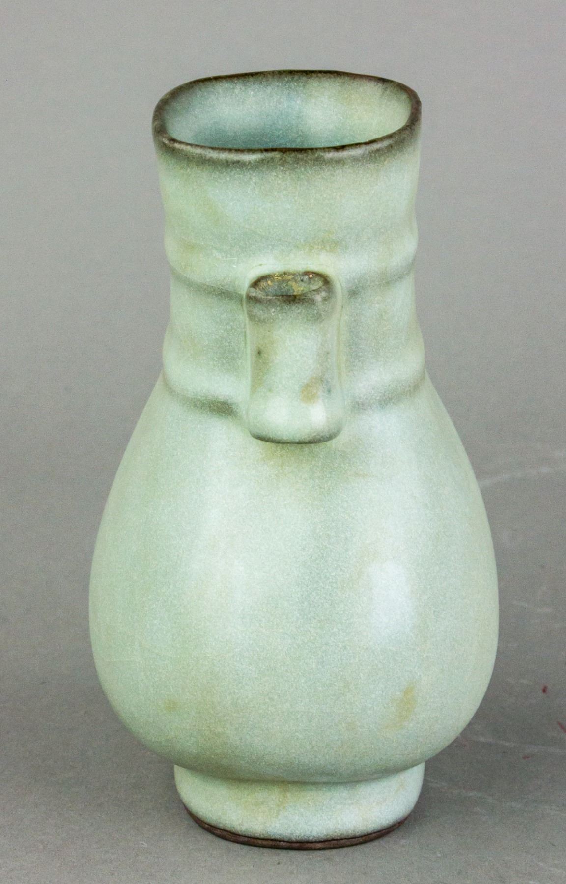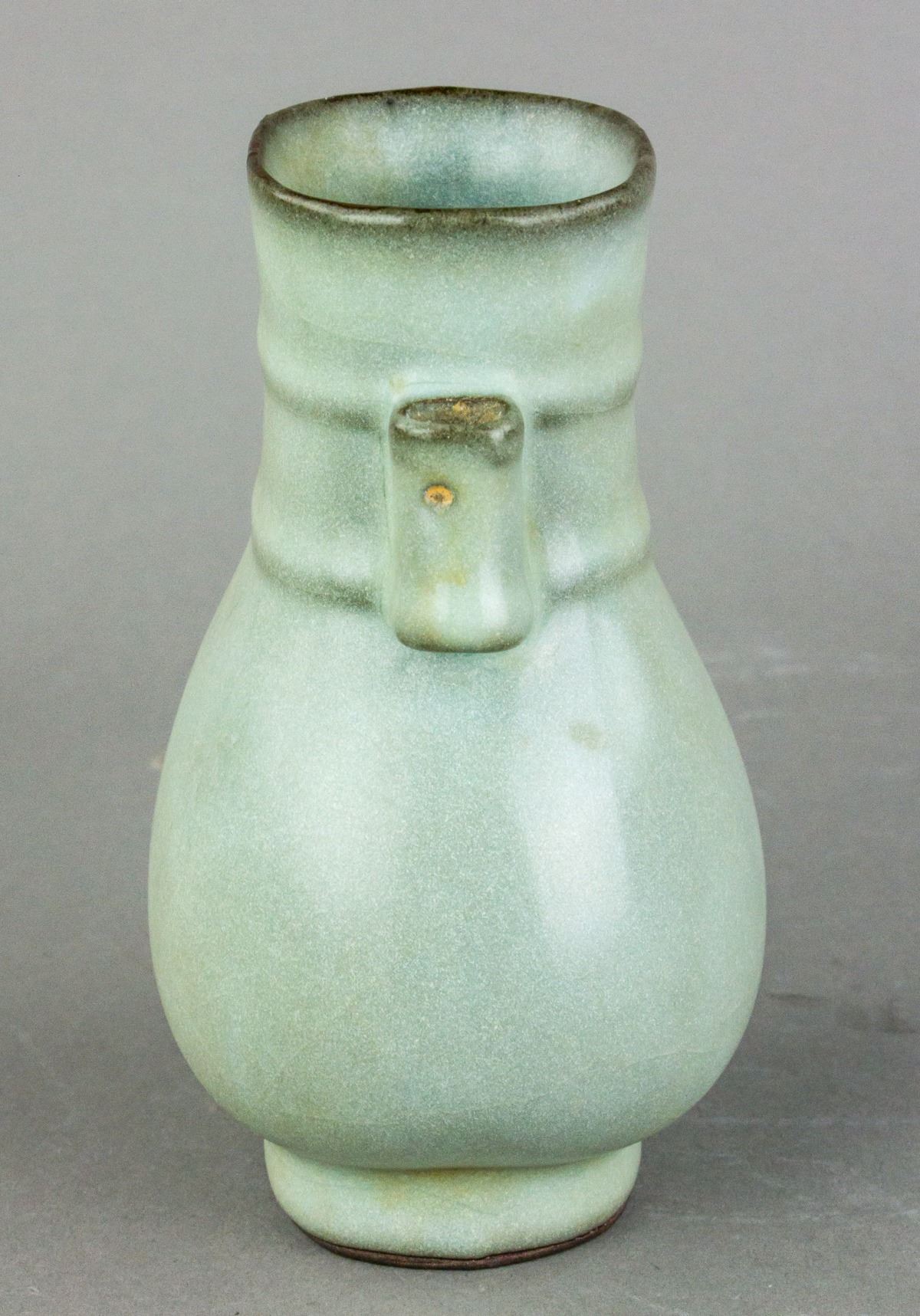 Chinese porcelain Hu vase; Song or Yuan style; of pear-shaped body flanked by double tubular ears; decorated with two raised strings on neck; covered in celadon glaze; H: 14.5 cm, W: 7.9 cm, L: 9.5 cm, 491 grams