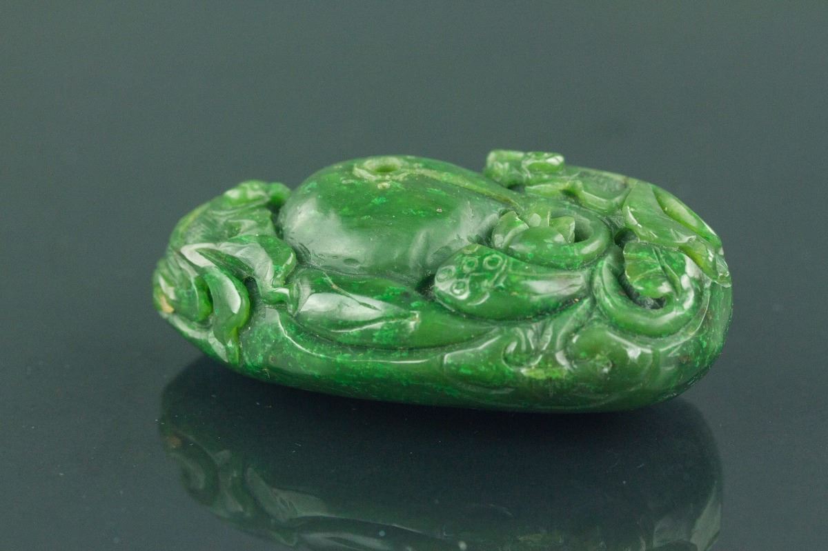 Chinese hardstone pendant; carved in form of pond with fish and lotus; of spinach green tone; H: 2.5 cm, W: 5.5 cm, L: 9 cm, 210 grams