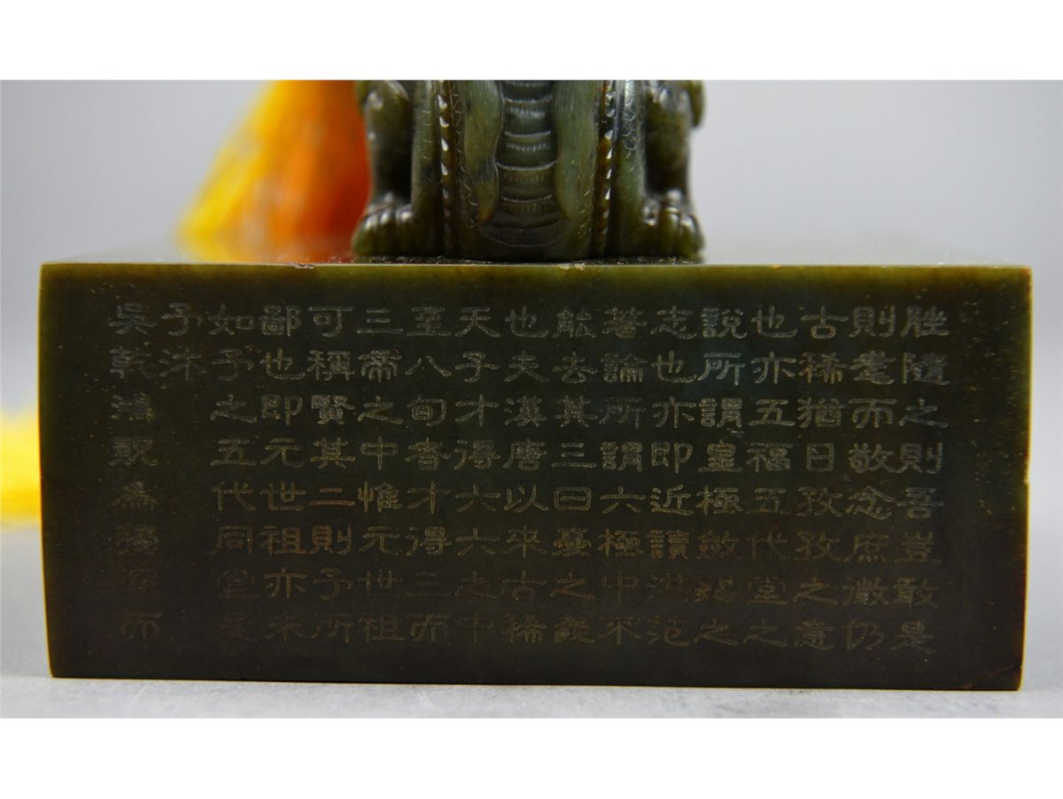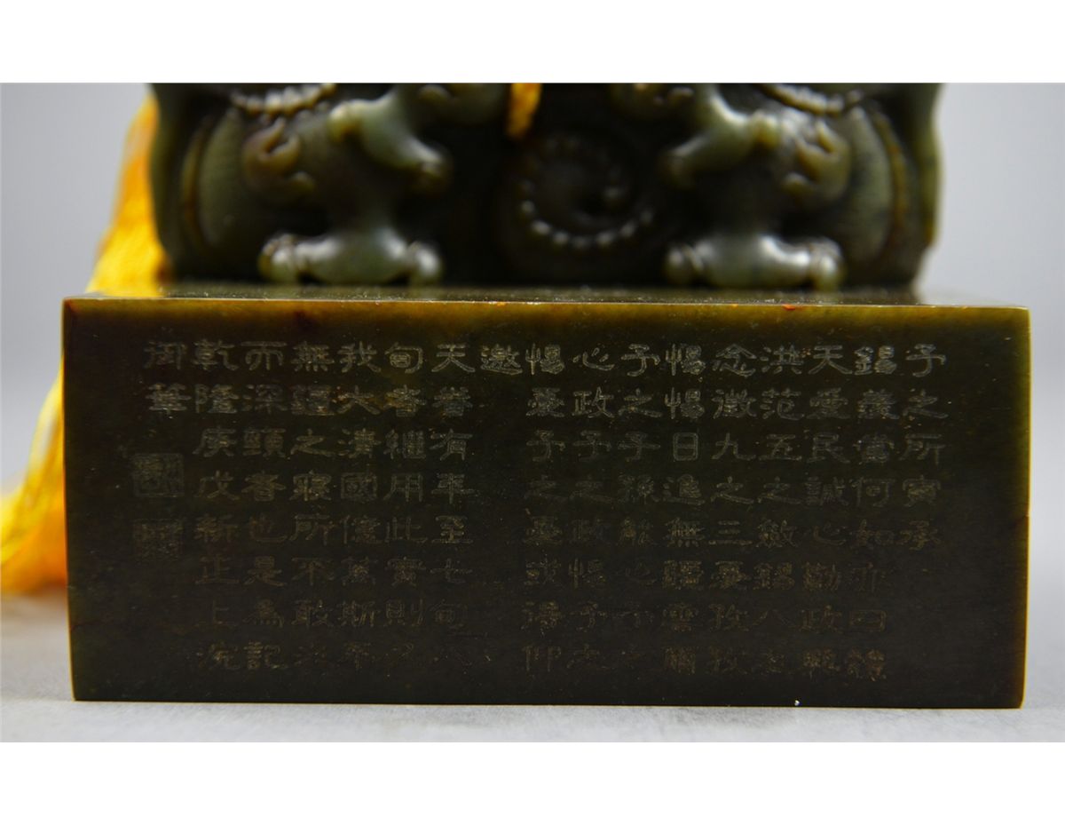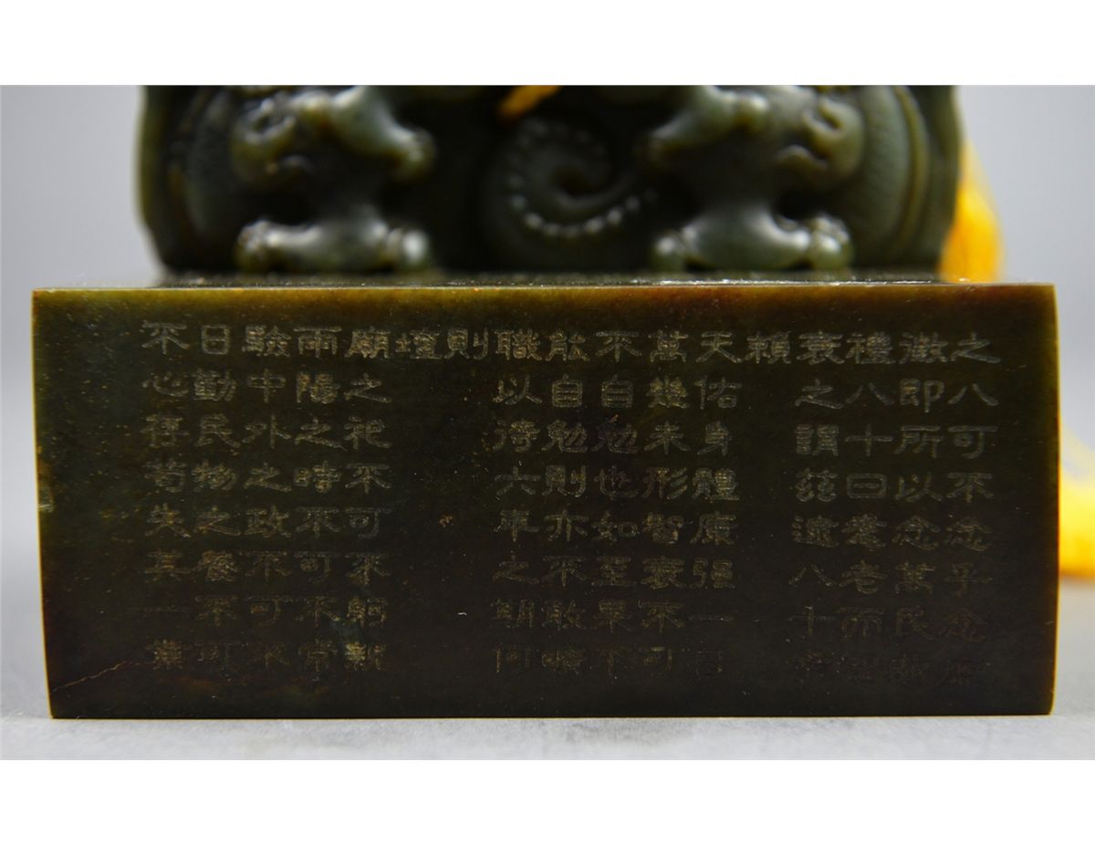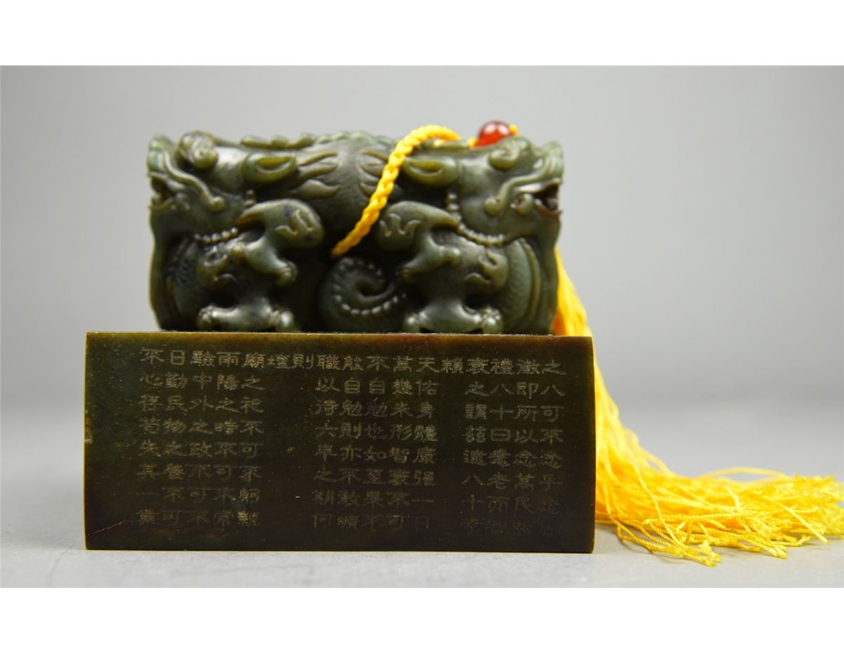Chinese carved spinach green jade seal, square form with incised script; surmounted by dragon in relief; L: 12 cm, W: 12 cm, H: 5 cm, 2967 grams, accompanied by Imperial seal reference book: 'Imperial Seals of the Ming & Qing Dynasty: Classics of the Forbidden City'; published in full colours; edited by the Palace Museum, The Forbidding City Publishing House; 29 cm x 29 cm; Provenance: Toronto collector