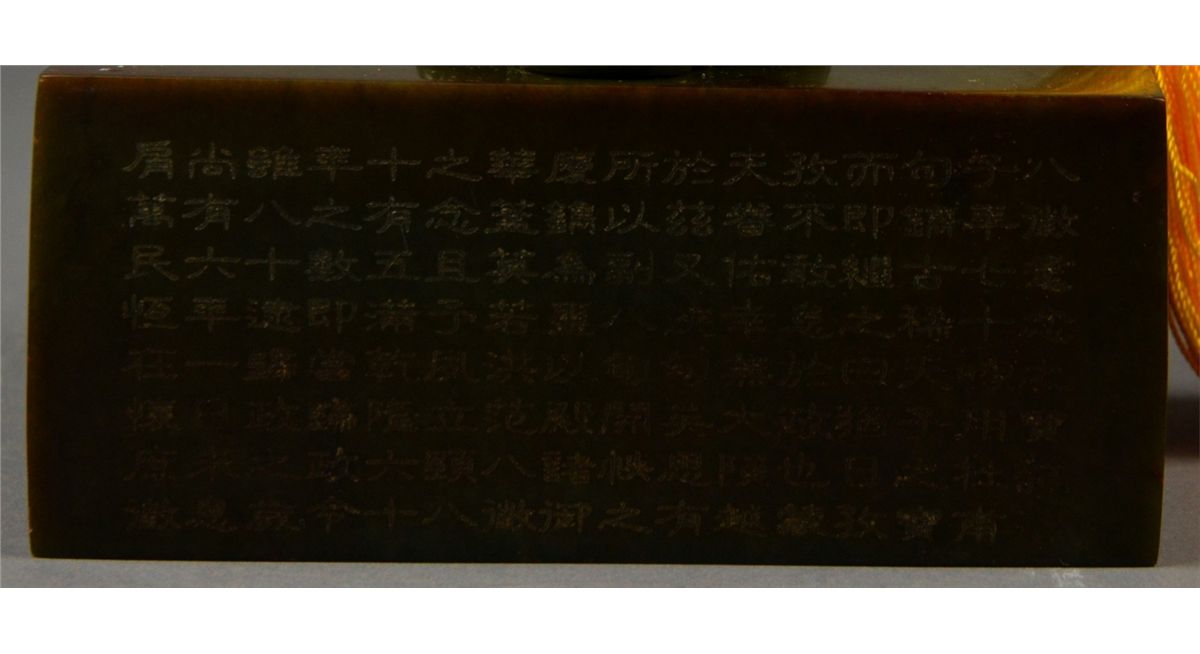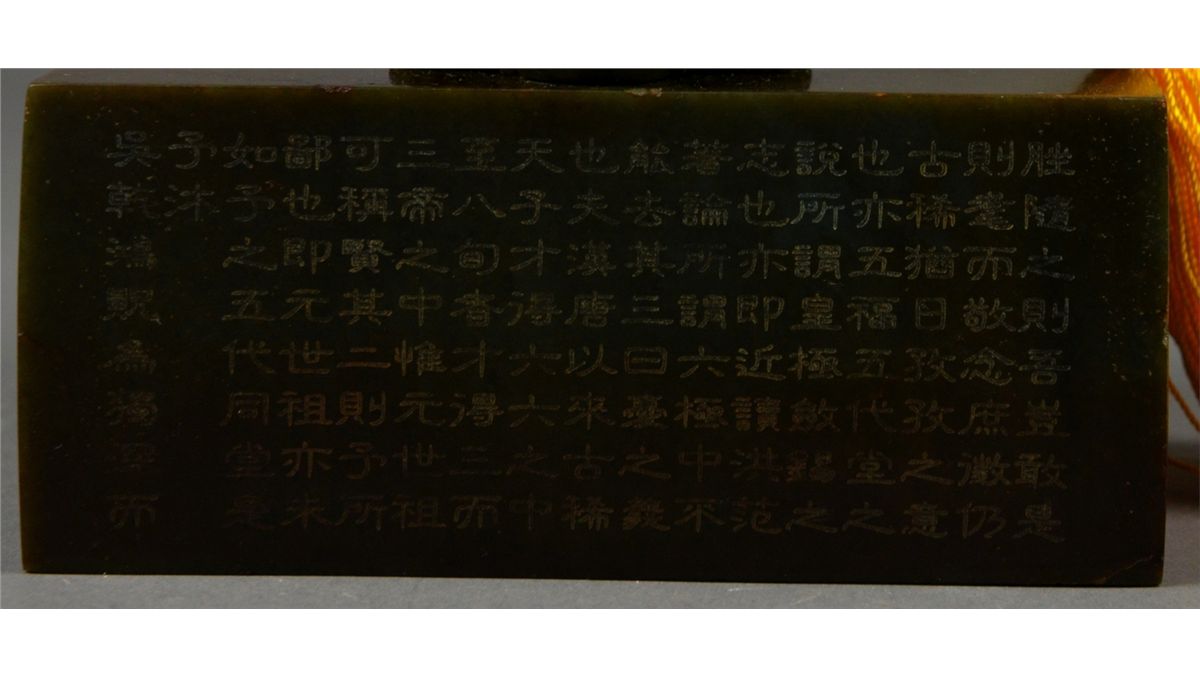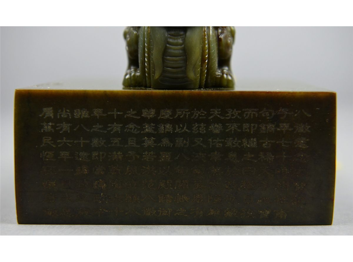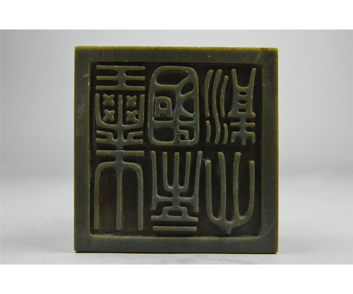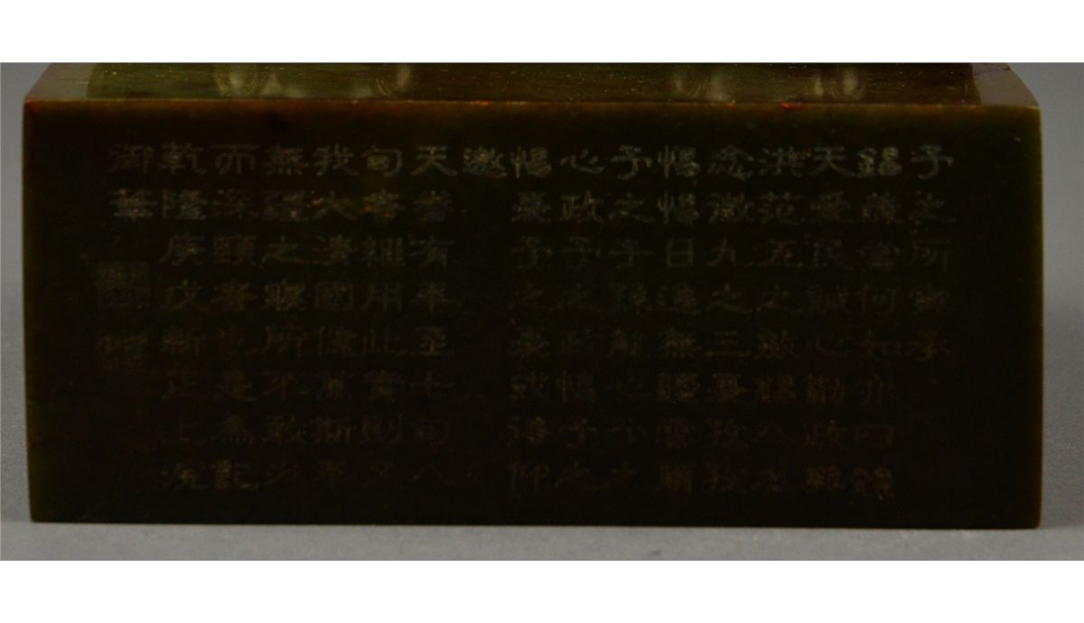Chinese carved spinach green jade seal, square form with incised script; surmounted by dragon in relief; L: 12 cm, W: 12 cm, H: 5 cm, 2967 grams, accompanied by Imperial seal reference book: 'Imperial Seals of the Ming & Qing Dynasty: Classics of the Forbidden City'; published in full colours; edited by the Palace Museum, The Forbidding City Publishing House; 29 cm x 29 cm; Provenance: Toronto collector