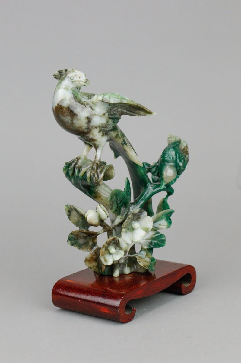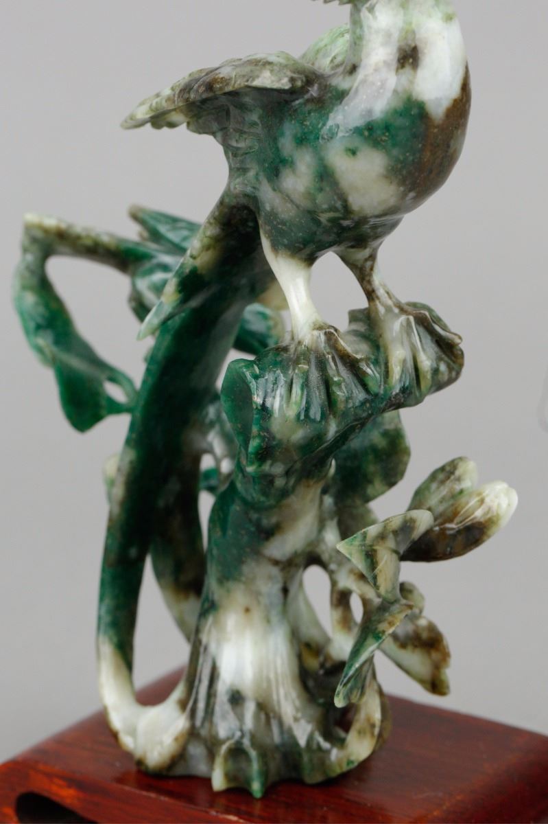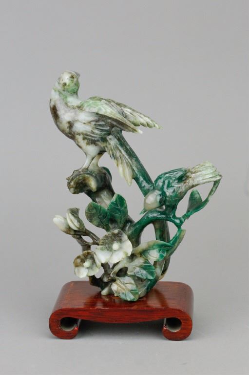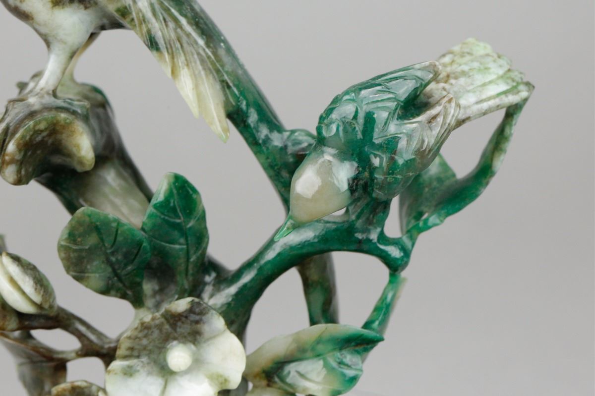 Chinese spinach jade carved birds figure; depicting a mother bird and a baby bird standing on flower branches; of spinach green and pale green tone; supported by custom made wood stand; H: 16.5 cm without stand, W: 11.5 cm, 434 grams