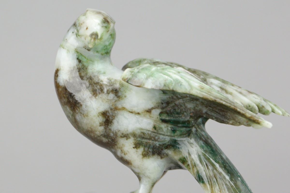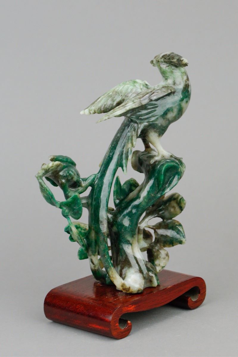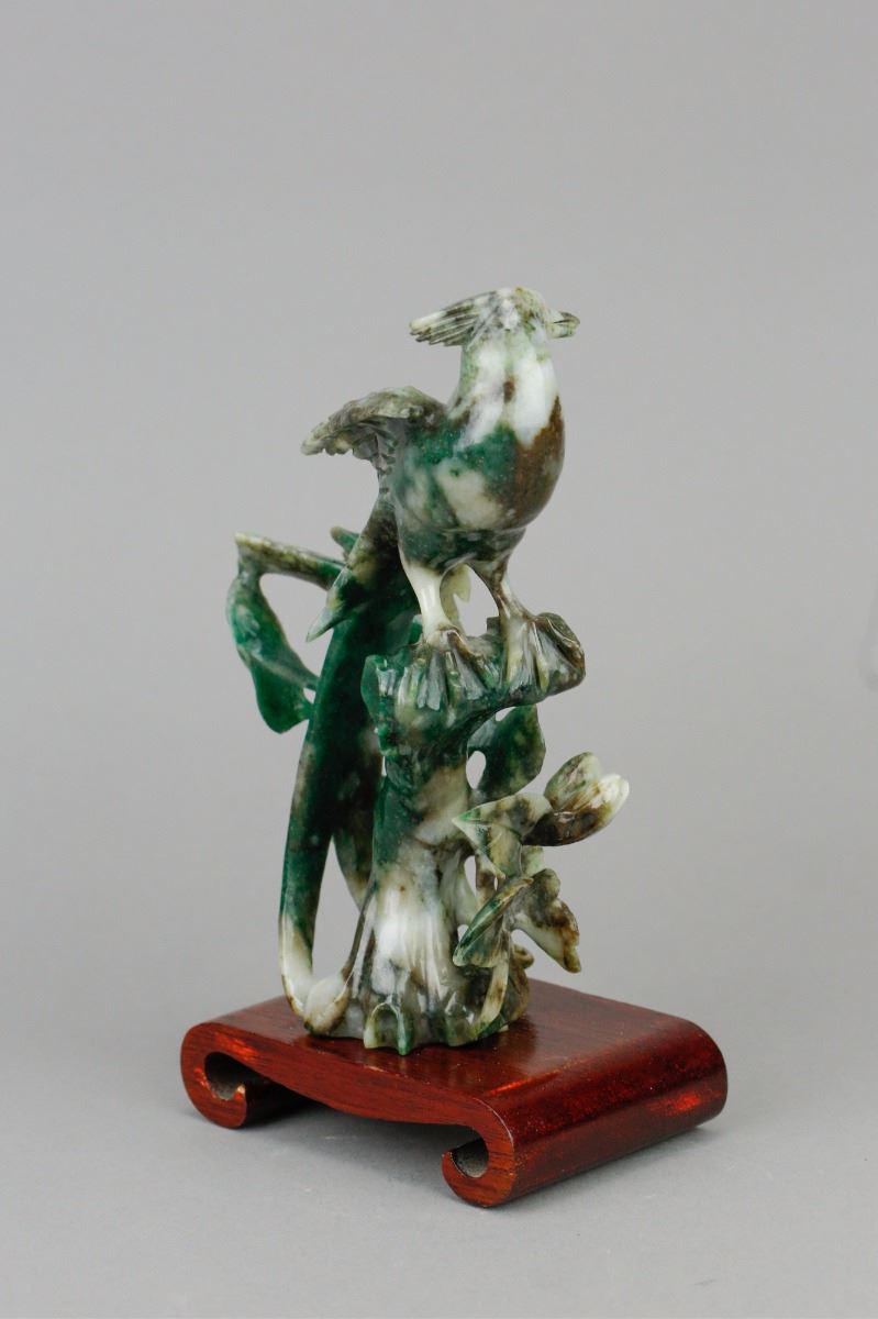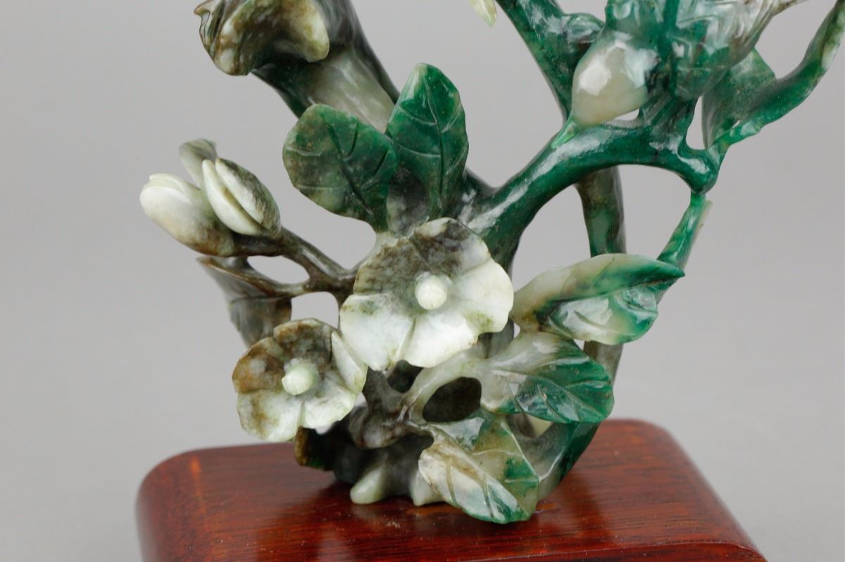 Chinese spinach jade carved birds figure; depicting a mother bird and a baby bird standing on flower branches; of spinach green and pale green tone; supported by custom made wood stand; H: 16.5 cm without stand, W: 11.5 cm, 434 grams