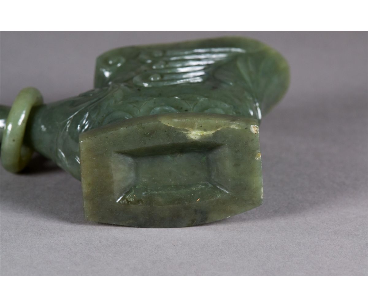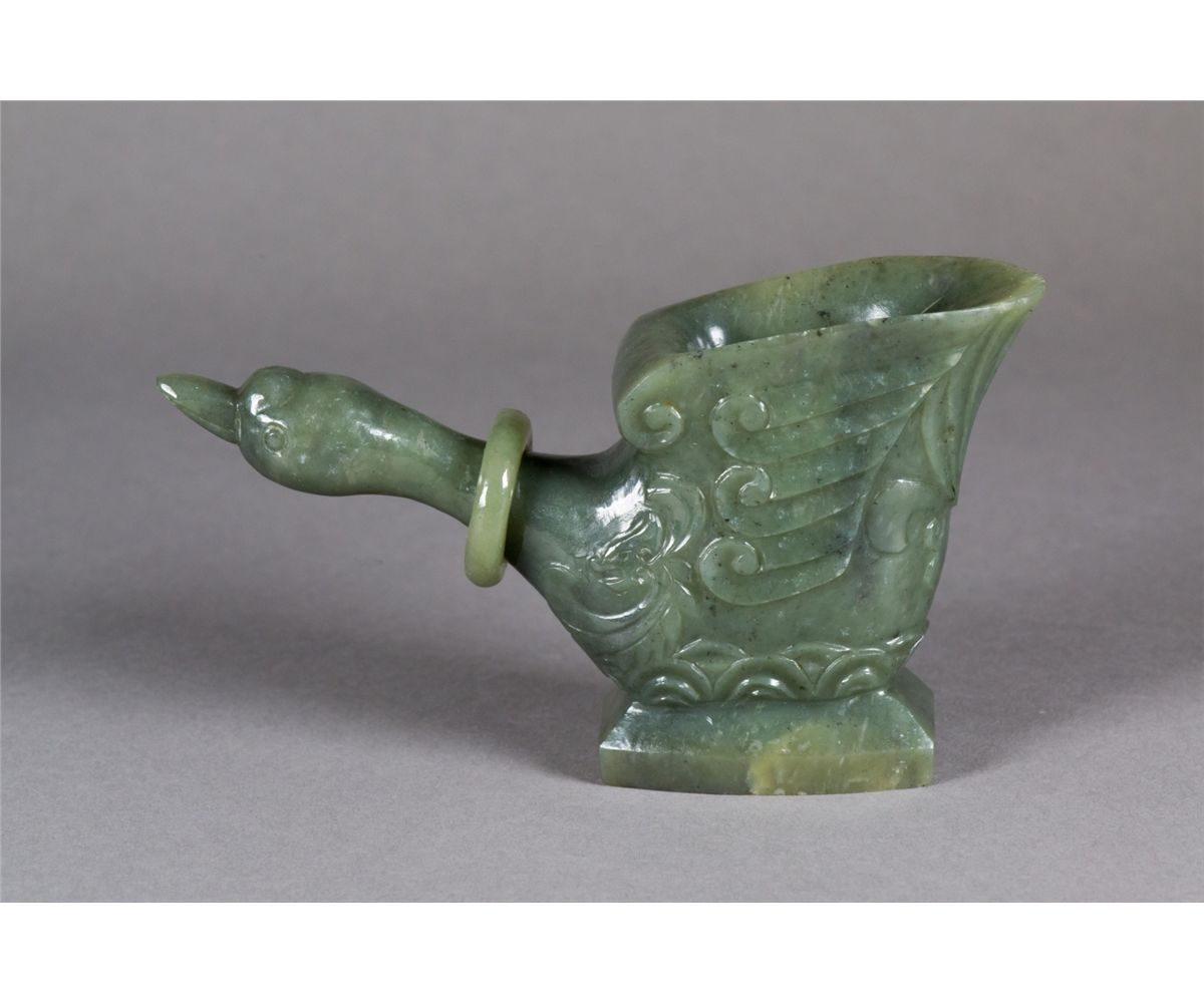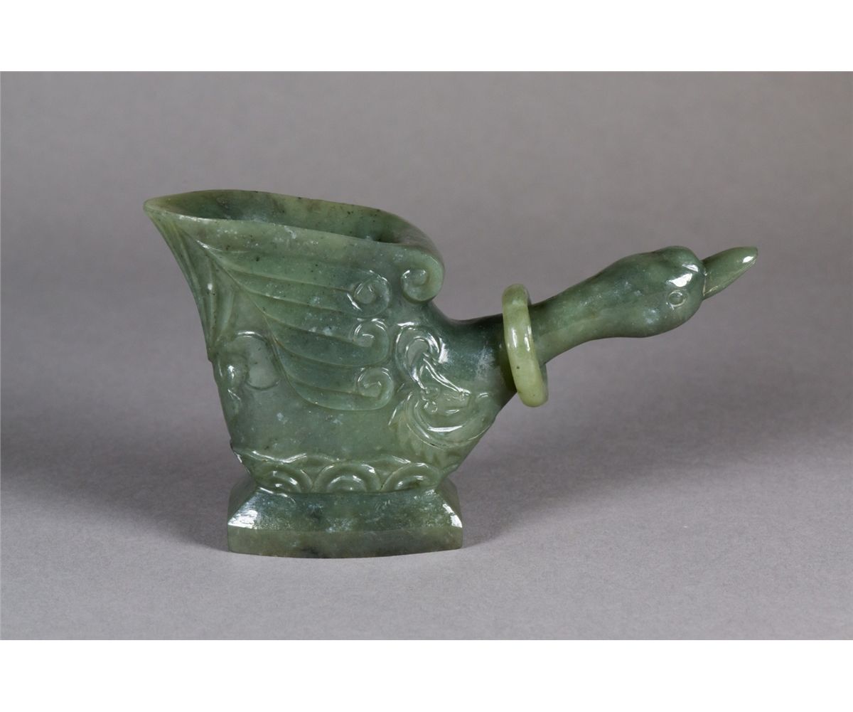 Chinese spinach jade carved duck cup; featuring form of a duck; with a ring on the neck; of spinach green tone; H: 11 cm, L: 18 cm, 531 grams
