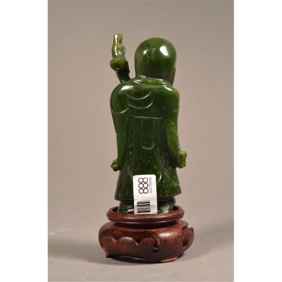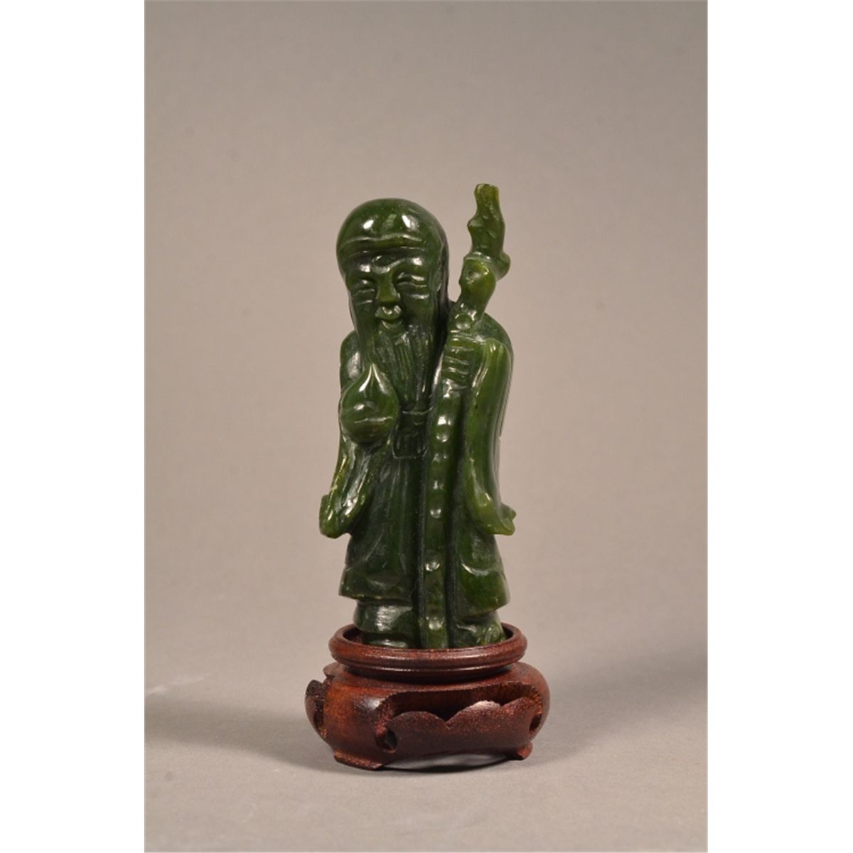 Chinese carved spinach green jade figure of Happy Man: holding peach and staff; 4" tall, wood stand