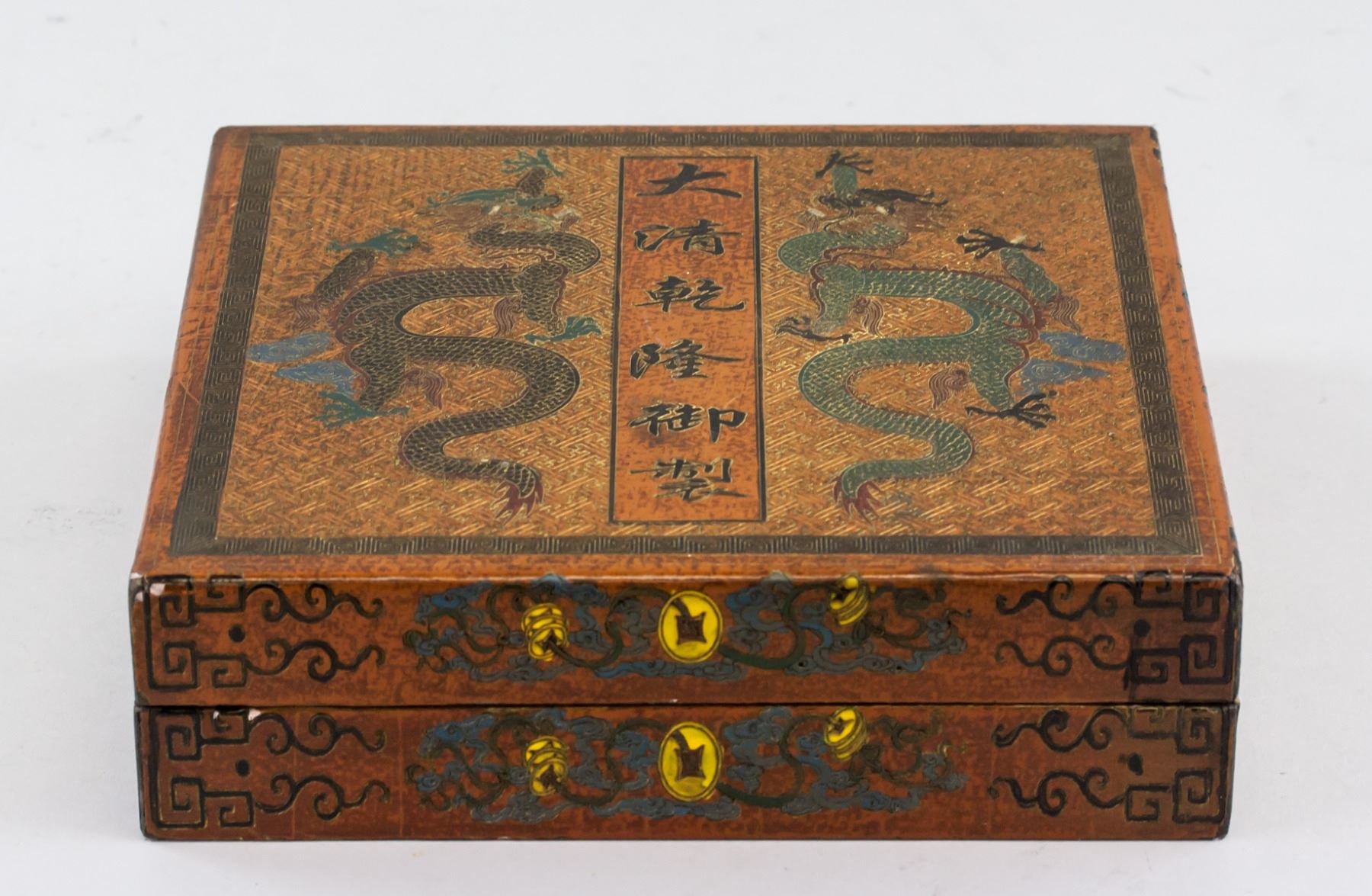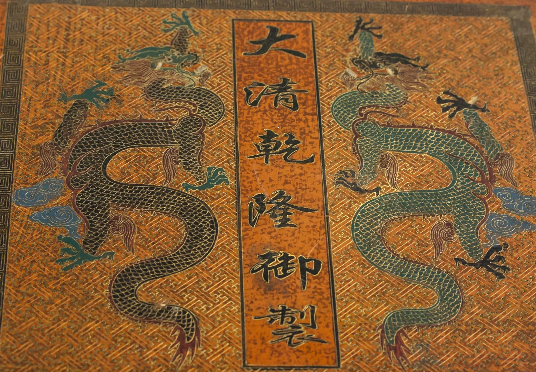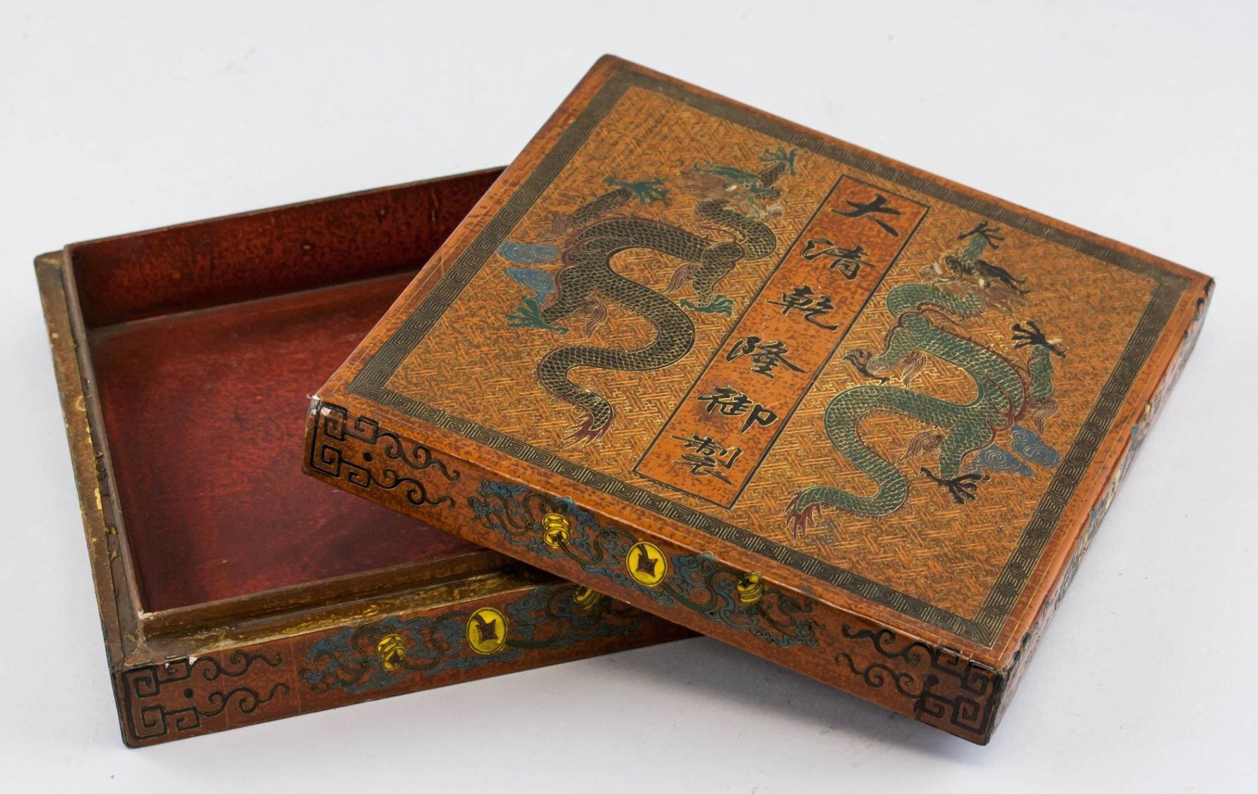 Chinese box. Of square shape. Lid painted with dragon. Lettering Da Qing Qian Long Yu Zhi. 6 x 22 cm. 862 grams