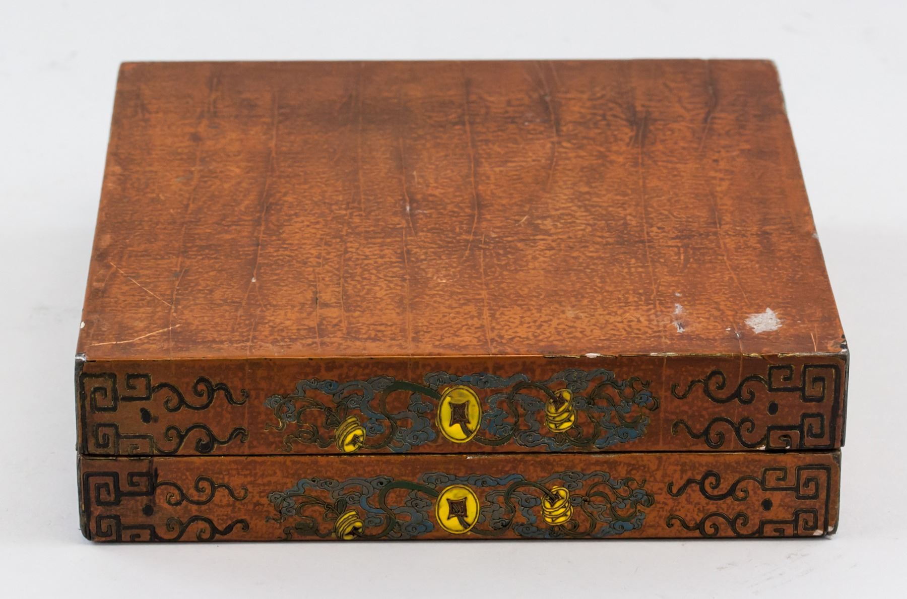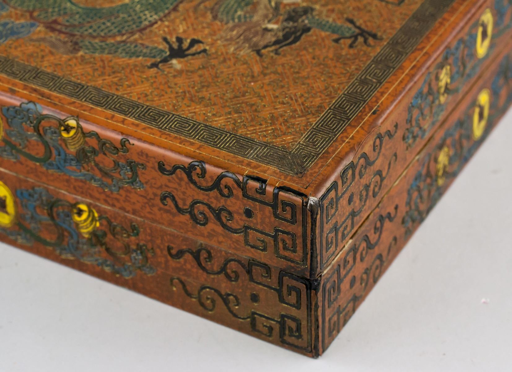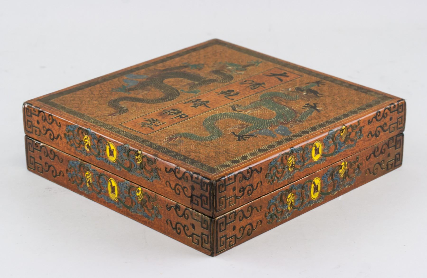 Chinese box. Of square shape. Lid painted with dragon. Lettering Da Qing Qian Long Yu Zhi. 6 x 22 cm. 862 grams