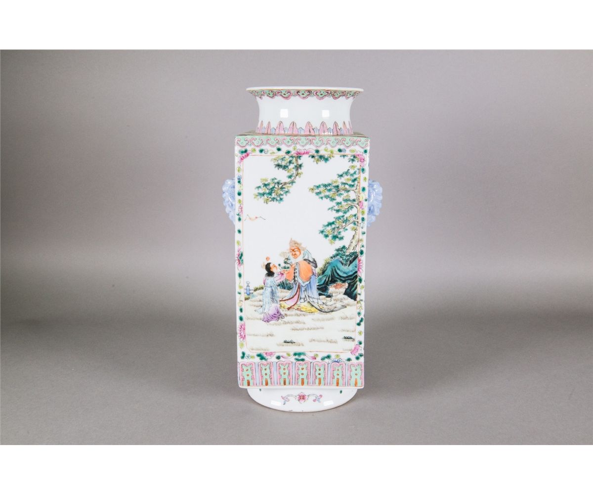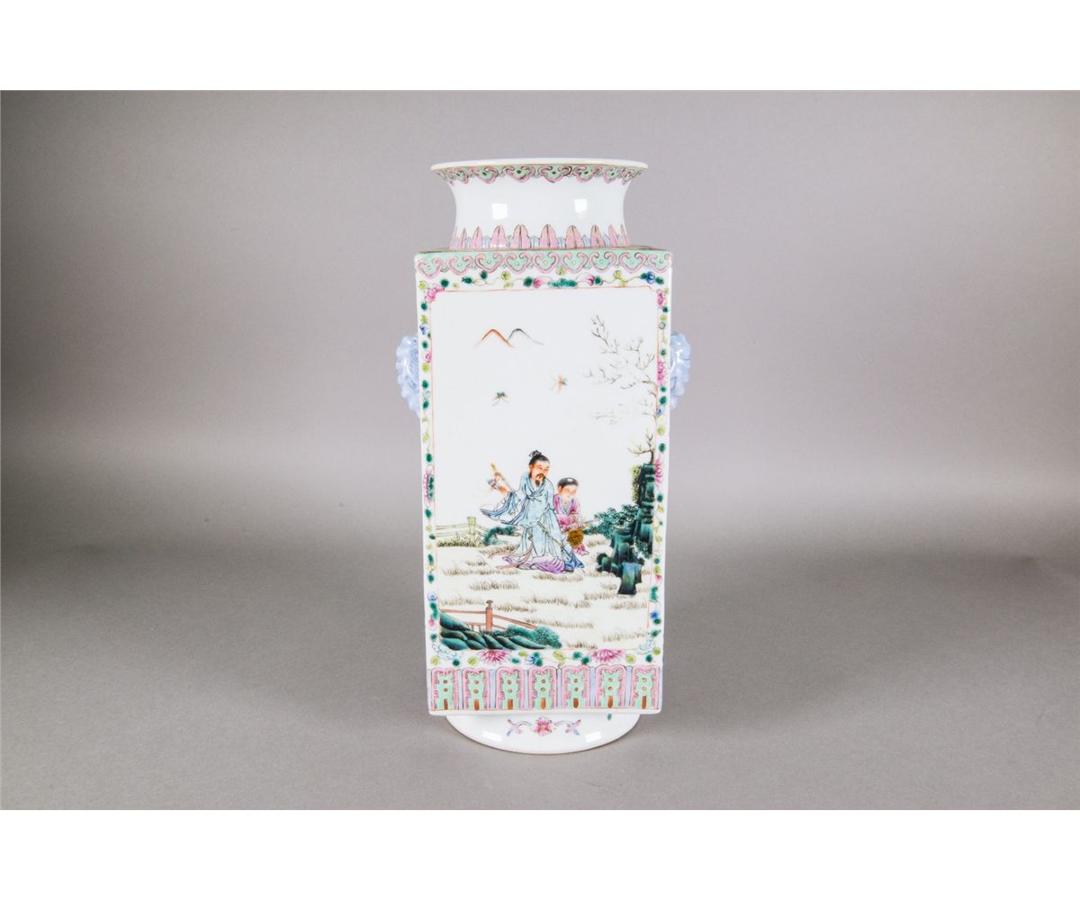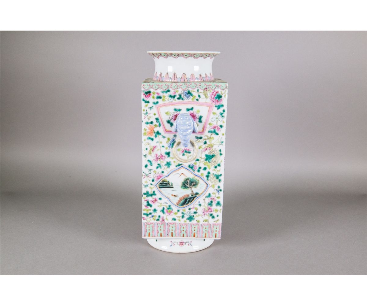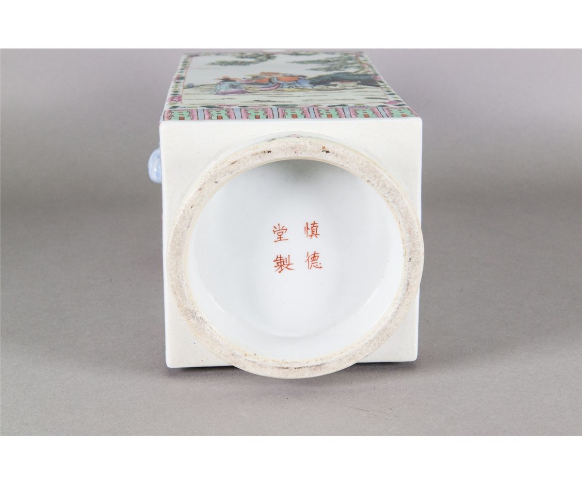 Chinese square Famille rose porcelain vase; featuring a square outer section and a circular inner section; with two elephant handles on side; depicting people and landscape; four-character Jingdezhen mark on base; W: 14 cm, 35 grams