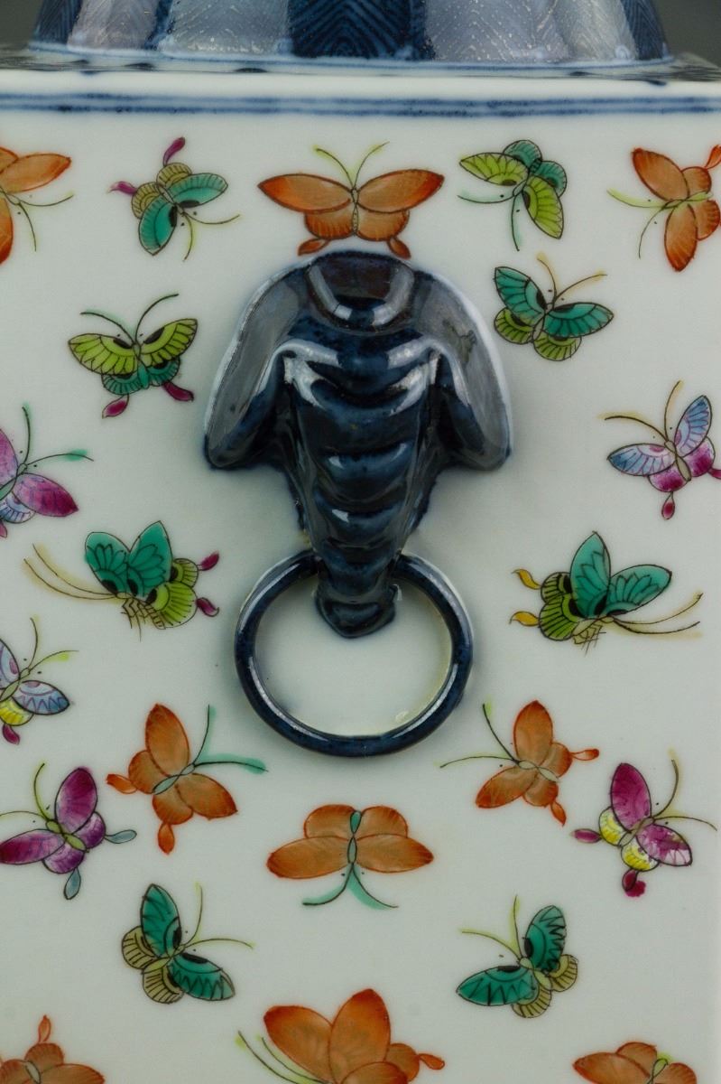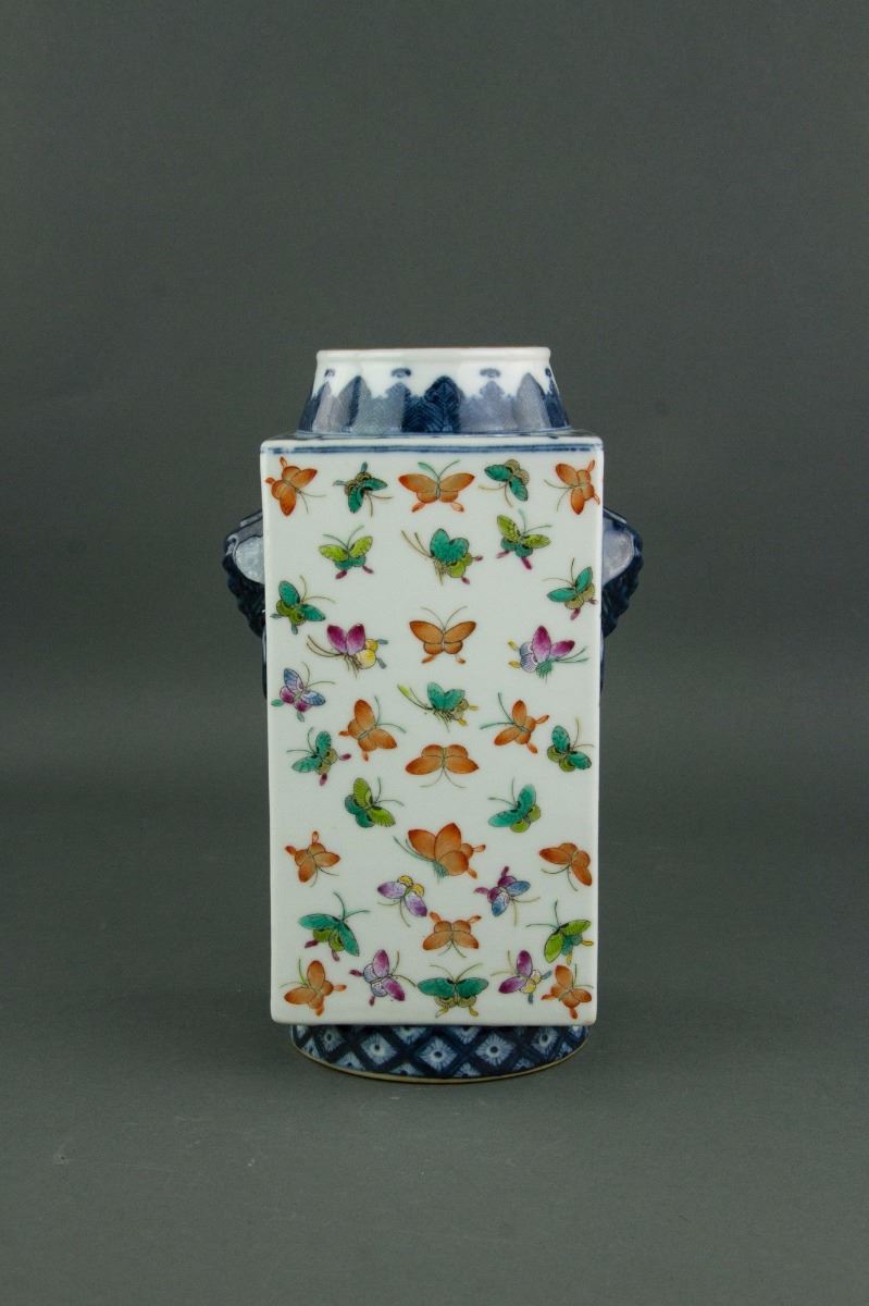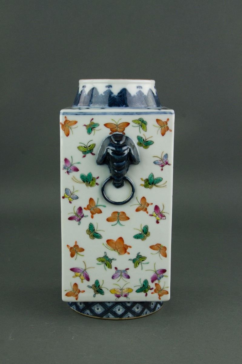 Chinese Famille Rose porcelain Cong vase; of square body supported by a flared foot and a slightly inverted mouth; flanked by a pair of elephant-head handles; the body painted with one hundred butterflies; six-character Qianlong reign mark on base; H: 31 cm, D: 11 cm, 1538 grams