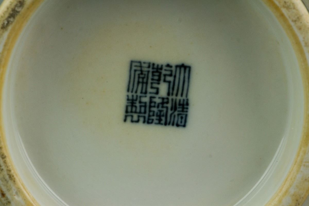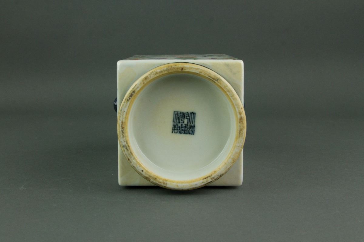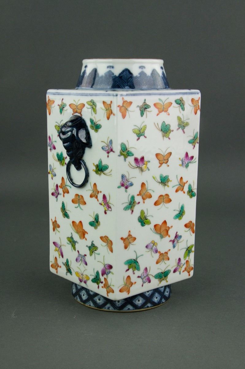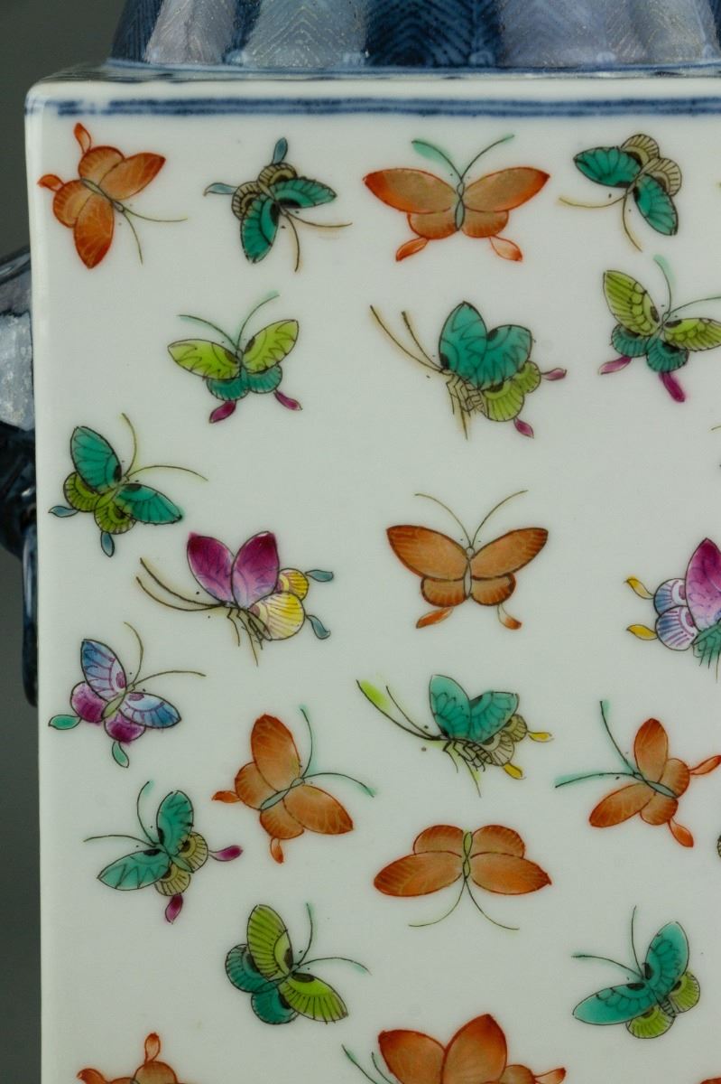 Chinese Famille Rose porcelain Cong vase; of square body supported by a flared foot and a slightly inverted mouth; flanked by a pair of elephant-head handles; the body painted with one hundred butterflies; six-character Qianlong reign mark on base; H: 31 cm, D: 11 cm, 1538 grams