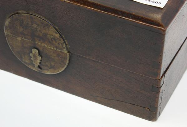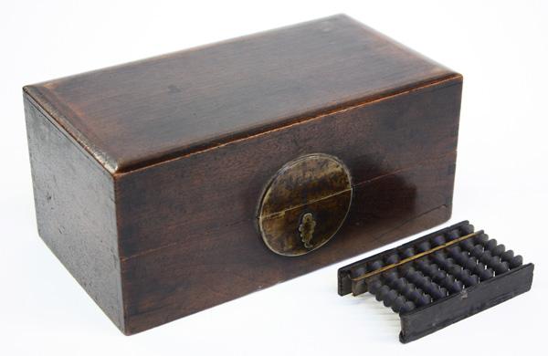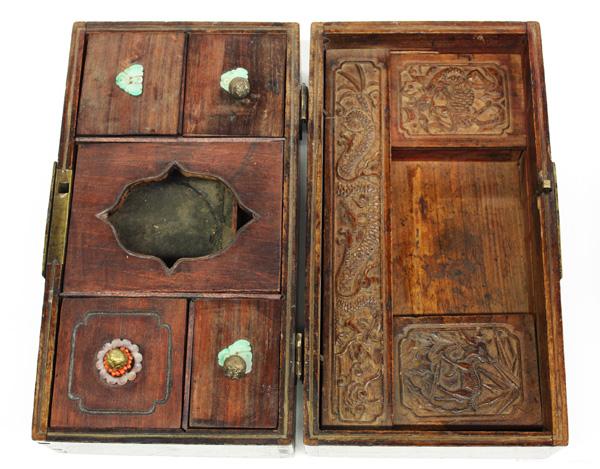 Chinese stained hardwood accessory box, Late Qing/Republic period, the rectangular box with a hinged lid opening to reveal a multi-compartment interior, some with jadeite-and-bell pulls, the underside of the lid with sliding panels carved with a dragon and qilin, now with a small abacus, with a bronze moon-form lock plate, 9.875''l