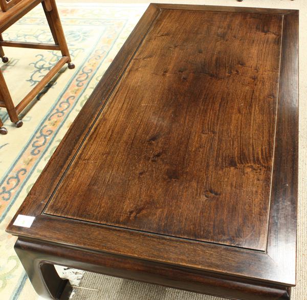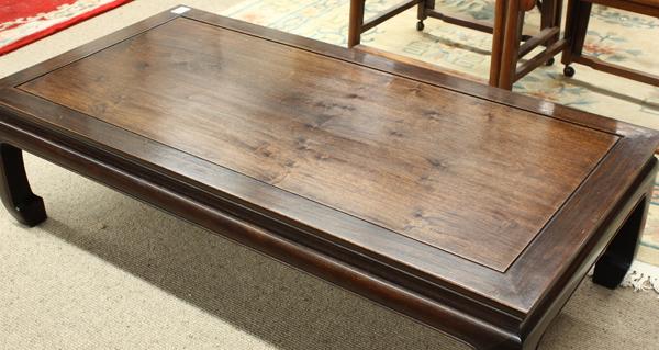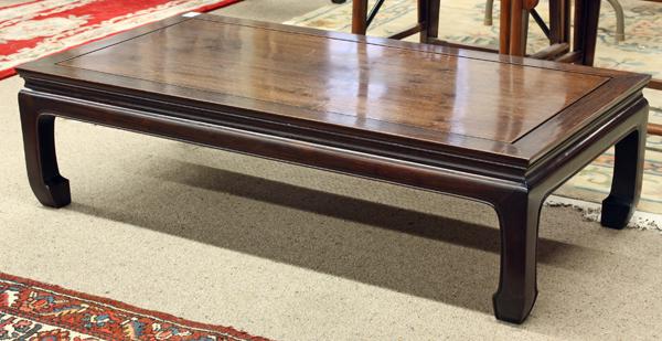 Chinese hardwood coffee table, the top inset with a large rectangular floating panel into a mortise and tenon frame, above a slight waist set over a plain apron with beaded accents continuing down the supports with hoof terminals, 14''h x 51.75''w x 25.8''d