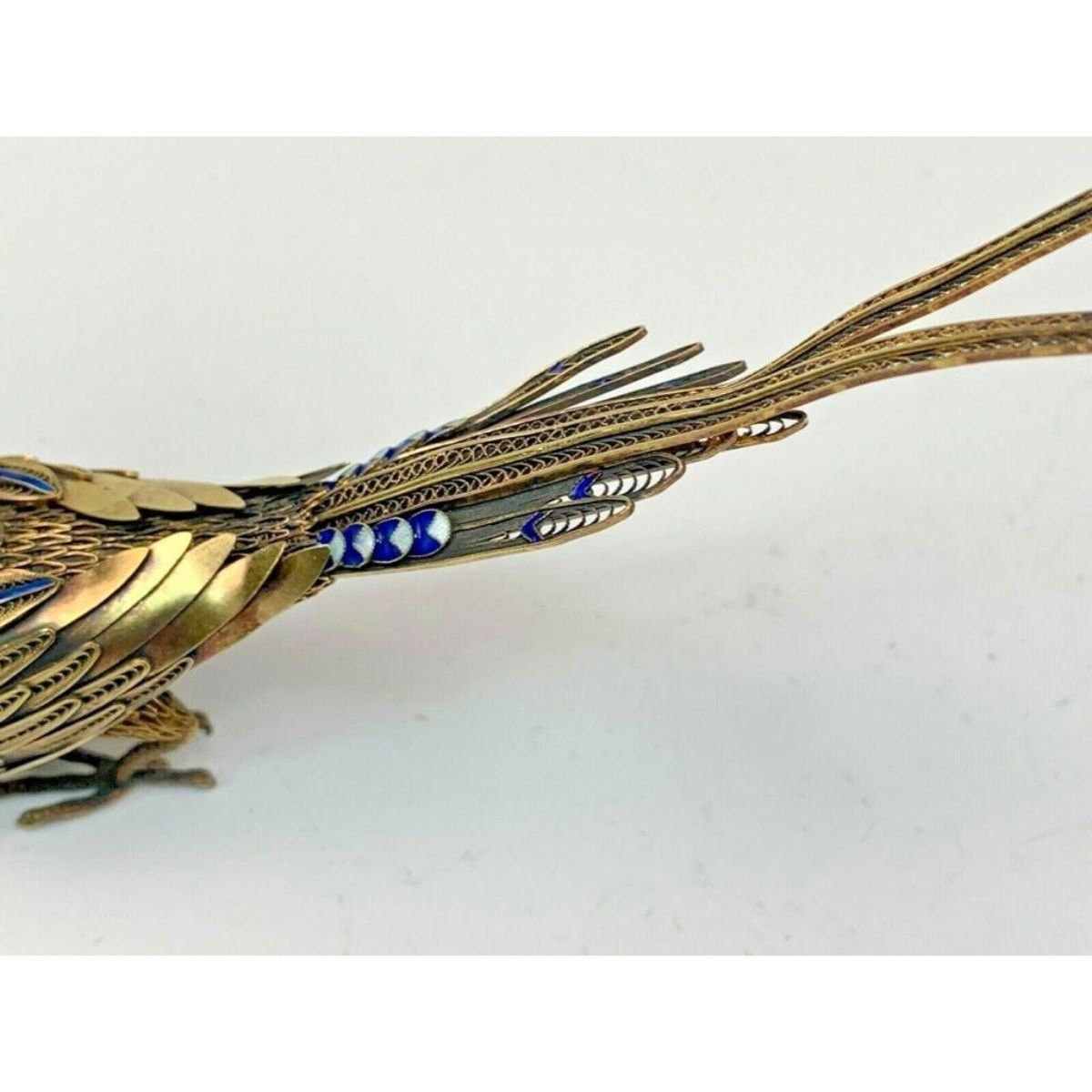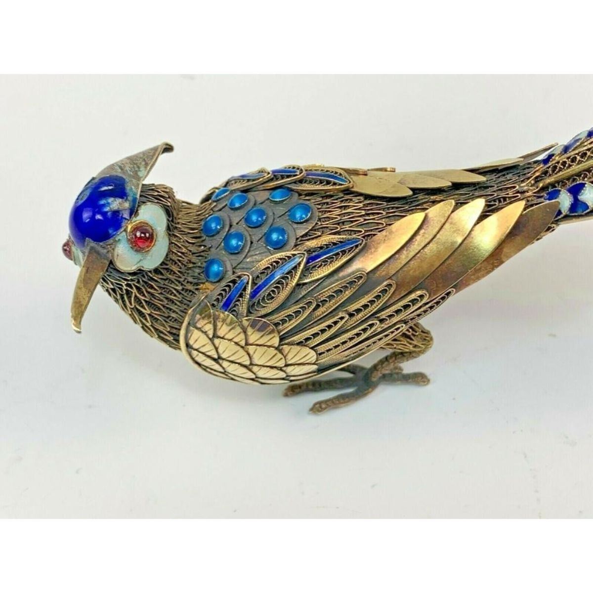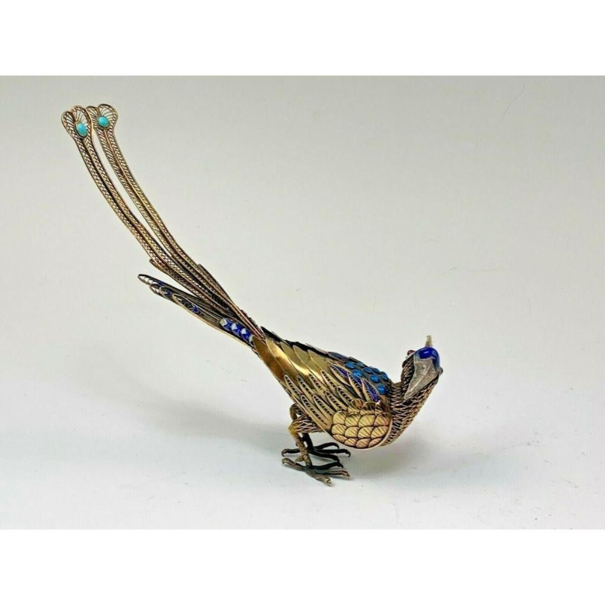 Chinese Sterling Silver filigree enameled & jeweled Bird of Paradise figure, standing about 5" tall at the tail tips & about 6" in length. The bird is constructed of silver, presumed sterling, with a vermeil gold wash & enameled with colorful dots at the head, eyes, back & feathers. Garnet cabochon eyes, marked Silver ( a common mark the Chinese used for fine quality silver, though we cannot be certain the exact purity for items marked this way ) Weighs 2.34 troy ounces.  * some enamel loss to top of bird's head, as pictured. Â