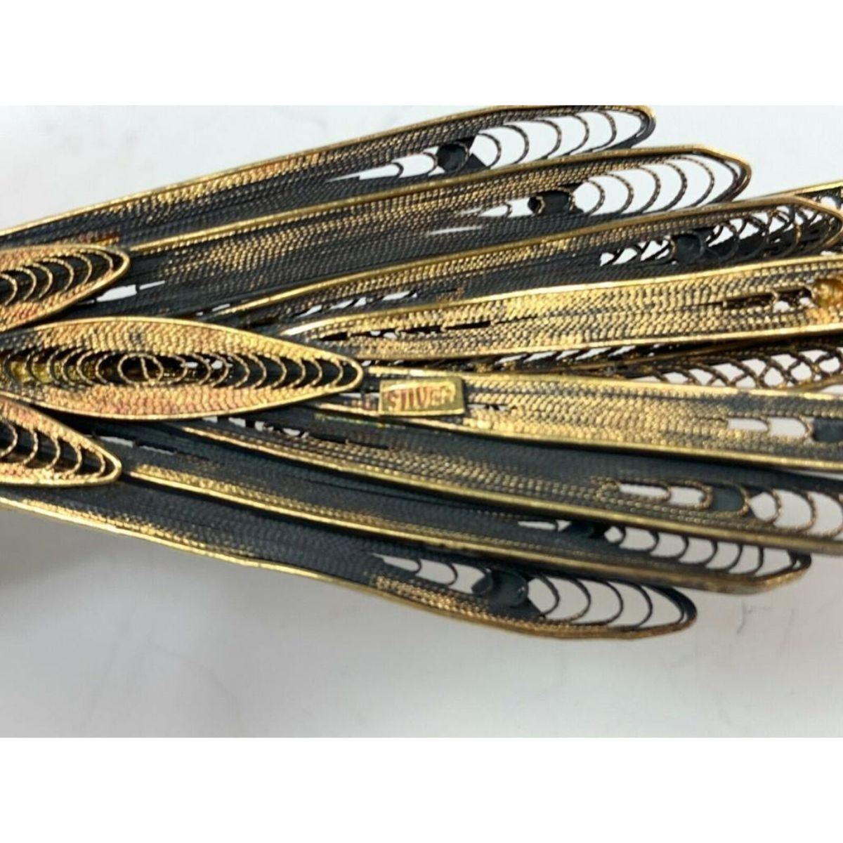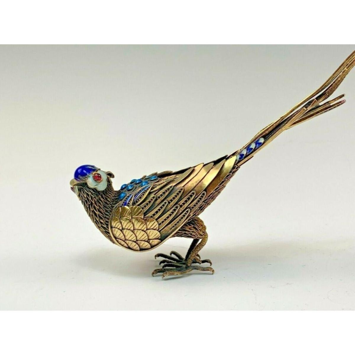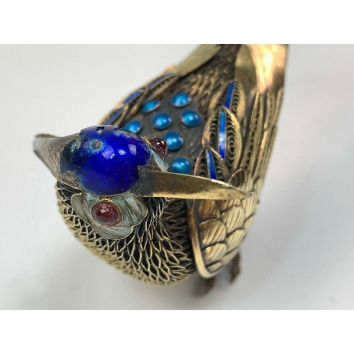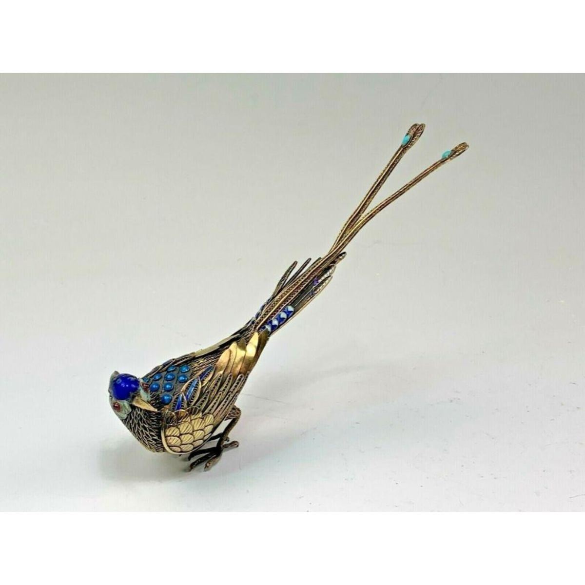 Chinese Sterling Silver filigree enameled & jeweled Bird of Paradise figure, standing about 5" tall at the tail tips & about 6" in length. The bird is constructed of silver, presumed sterling, with a vermeil gold wash & enameled with colorful dots at the head, eyes, back & feathers. Garnet cabochon eyes, marked Silver ( a common mark the Chinese used for fine quality silver, though we cannot be certain the exact purity for items marked this way ) Weighs 2.34 troy ounces.  * some enamel loss to top of bird's head, as pictured. Â
