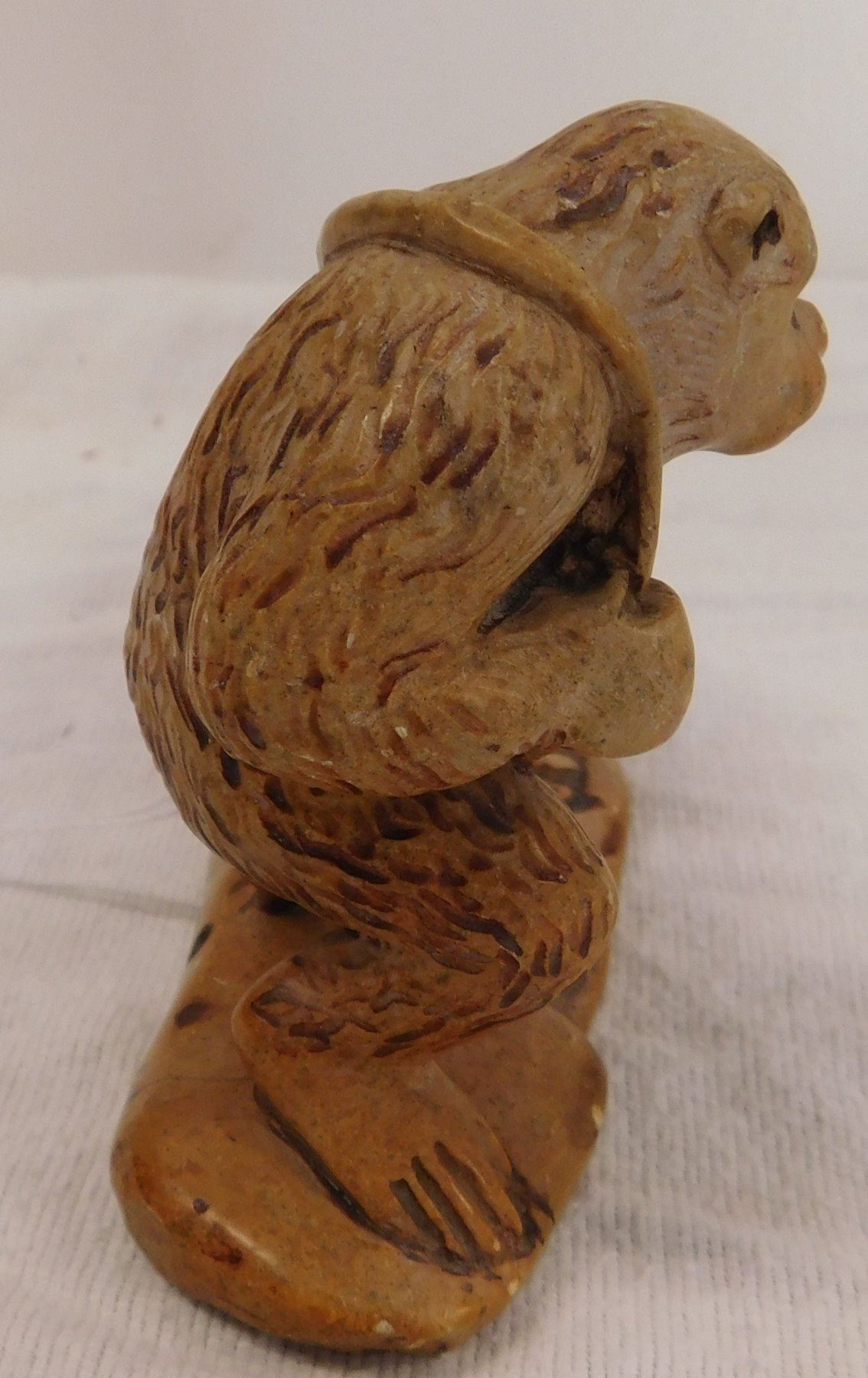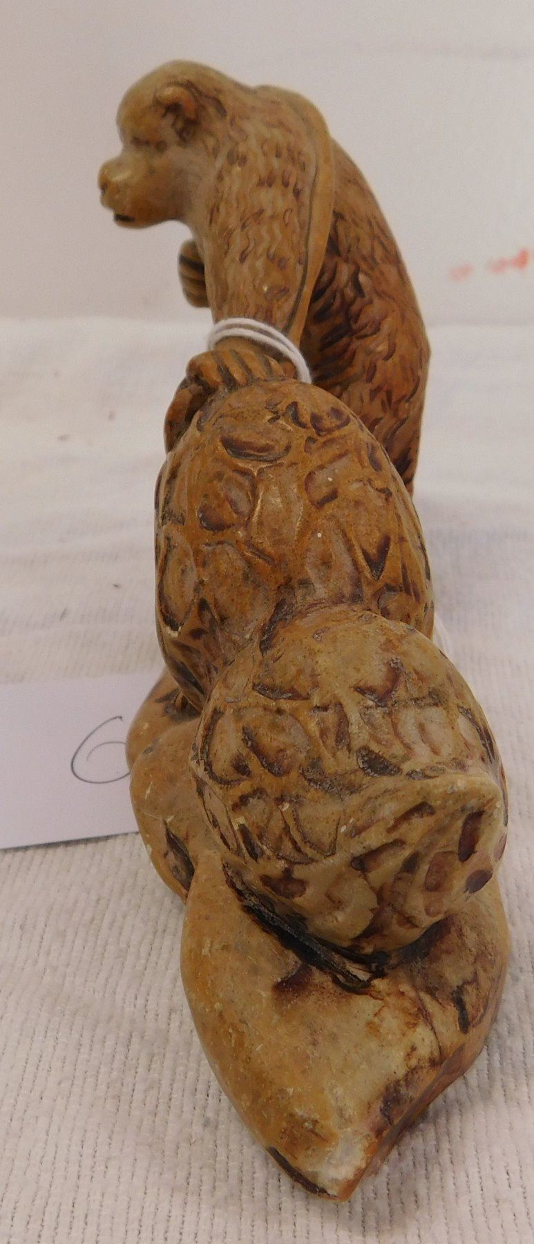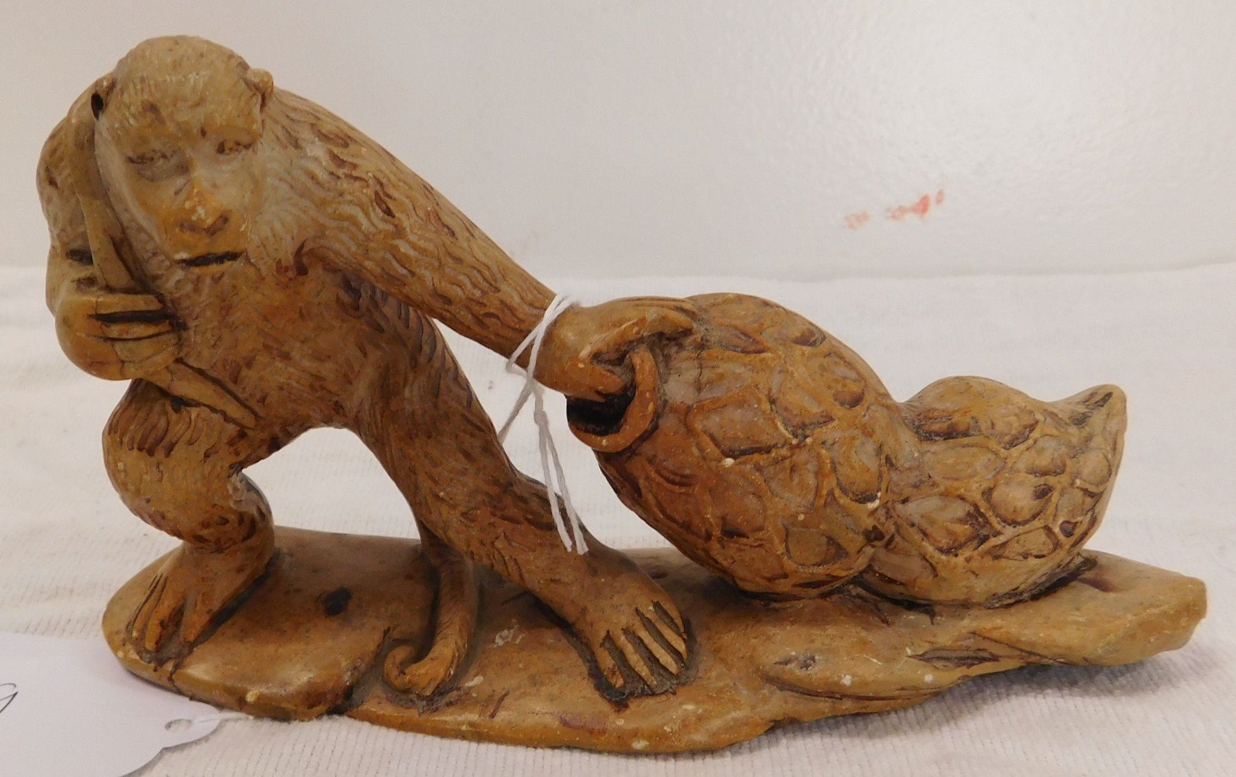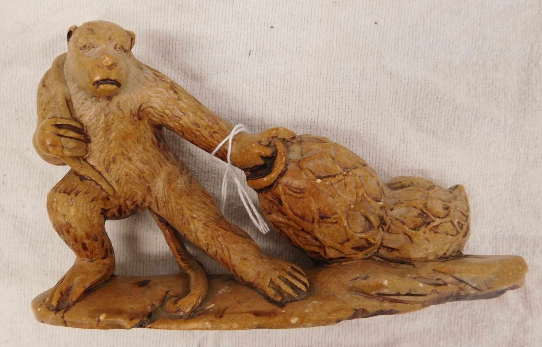 Chinese Stone Carving, circa 1910s. Made of stone, the item measures 7" x 2" x 4". China. Gorilla dragging a net with 2 jars inside. Condition: Good, see images. Shipping: $16.50 w/insurance and signature.