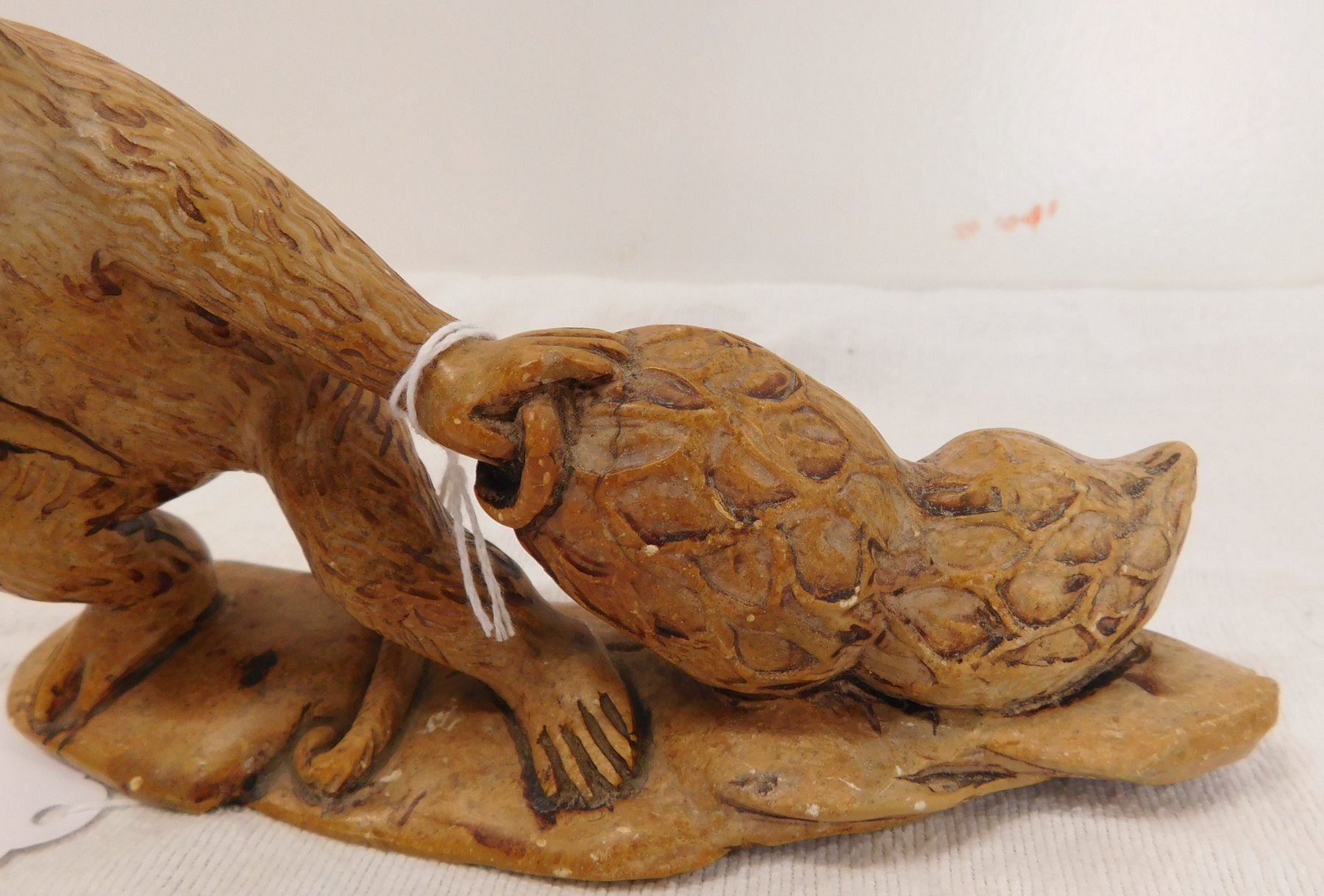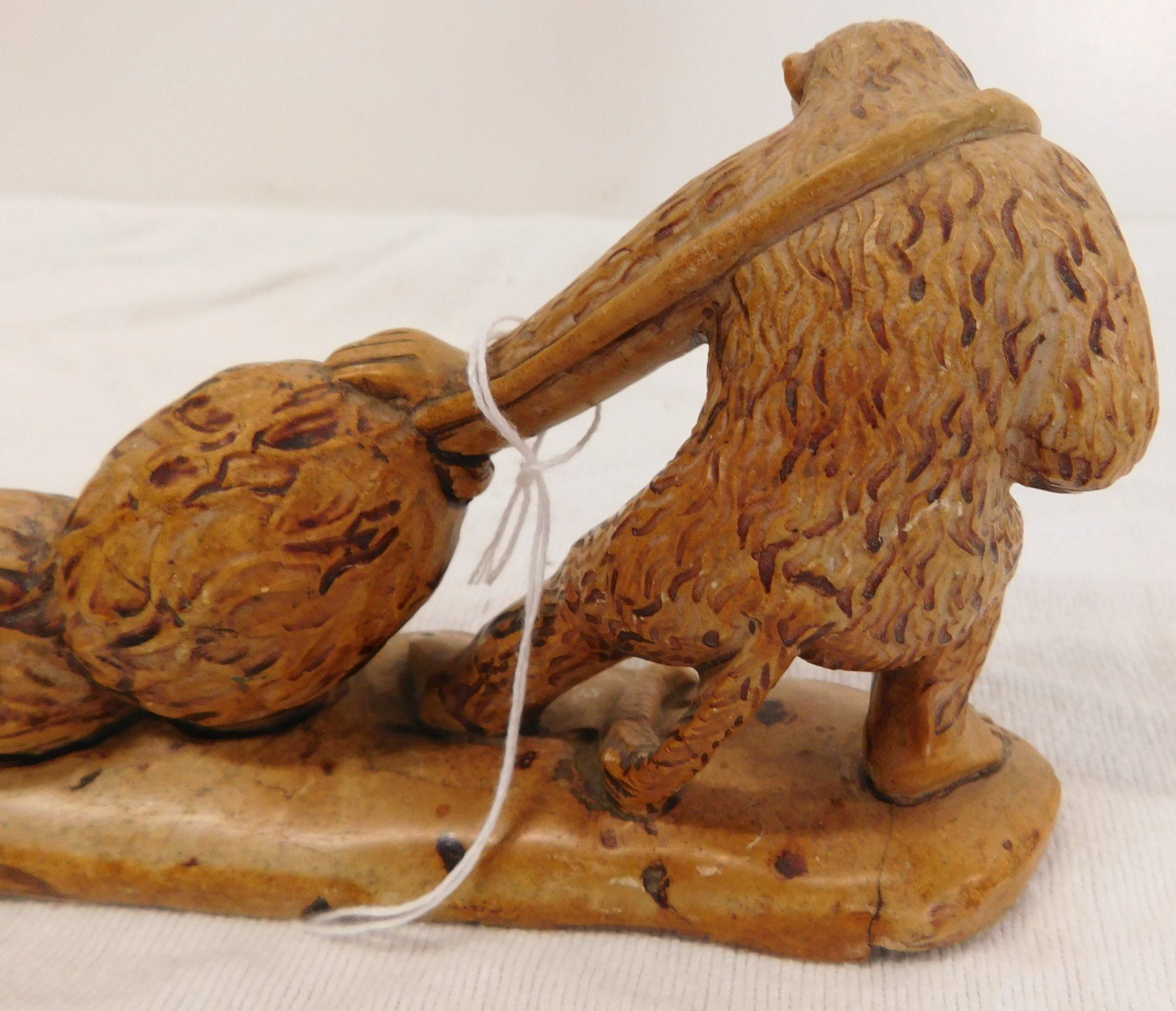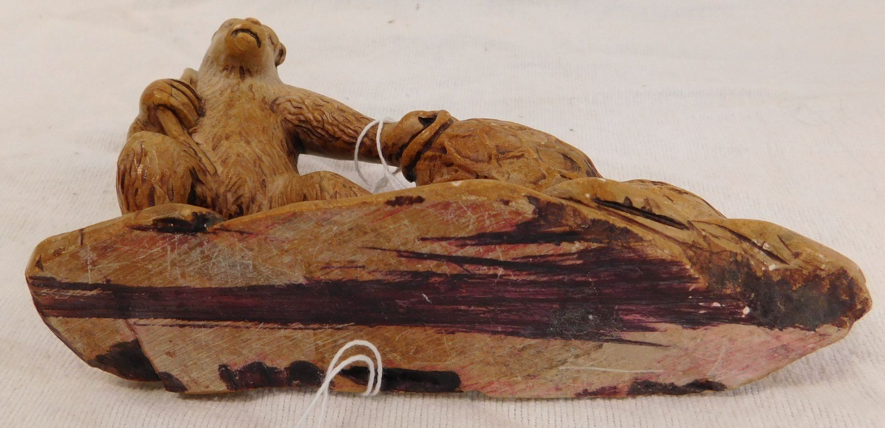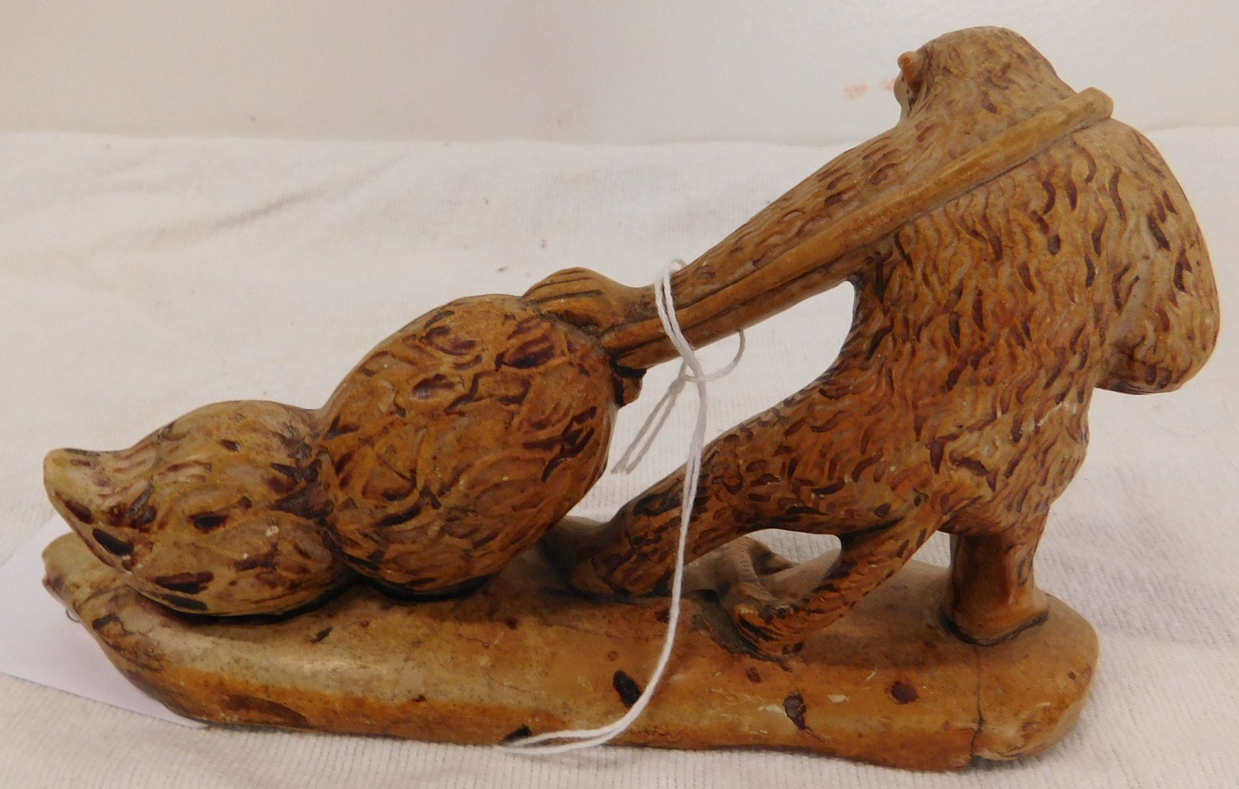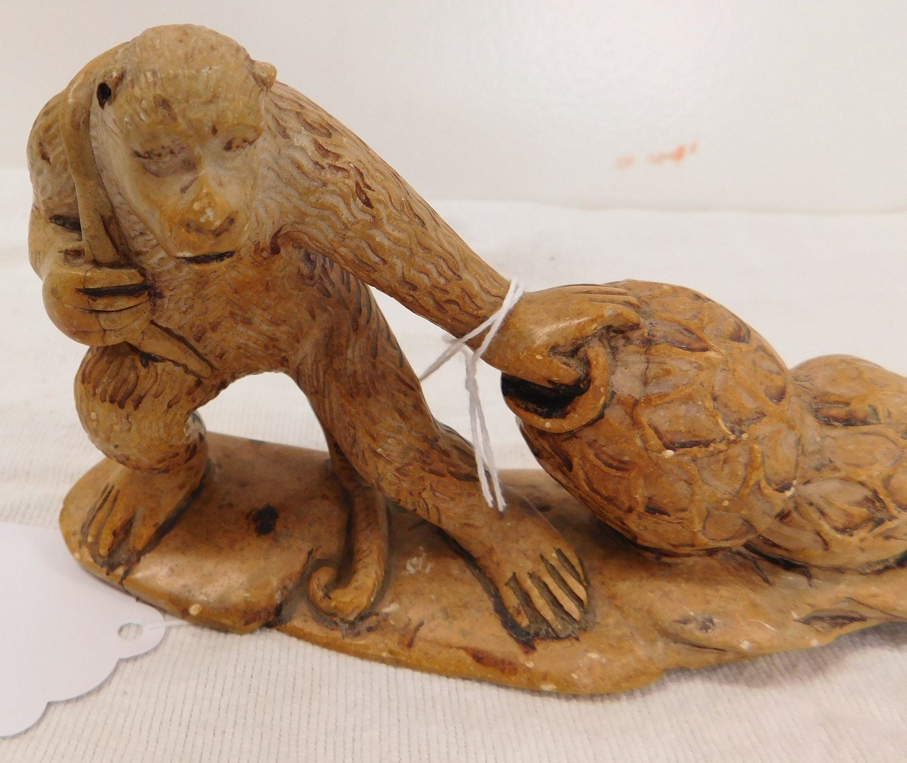 Chinese Stone Carving, circa 1910s. Made of stone, the item measures 7" x 2" x 4". China. Gorilla dragging a net with 2 jars inside. Condition: Good, see images. Shipping: $16.50 w/insurance and signature.