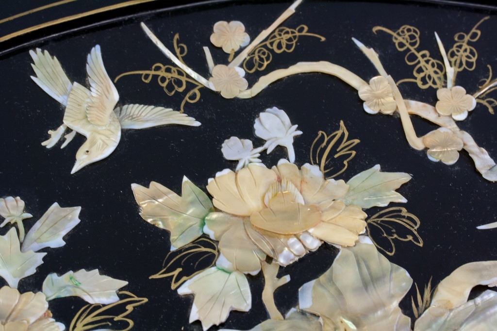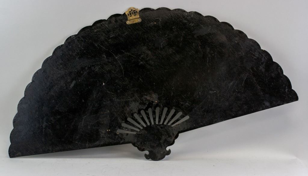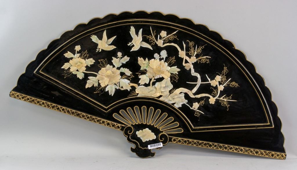 Chinese fan. Of black tone with gold details. Inlaid with stone design of birds and flowers. H: 45 cm. L: 88 cm, 918 grams.