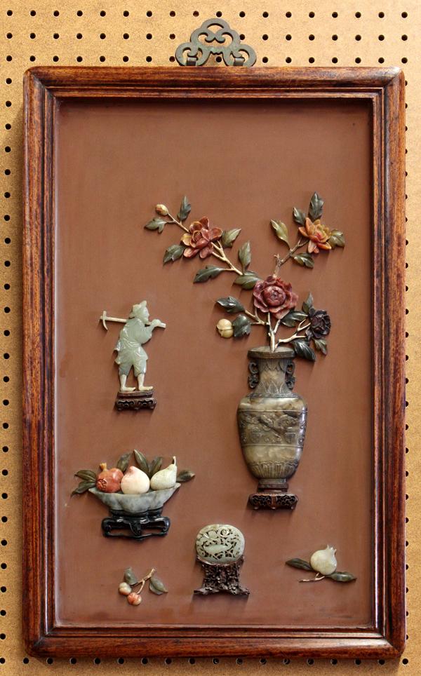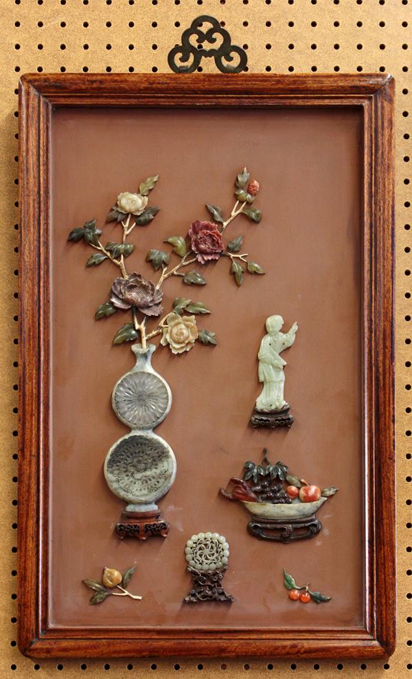 Pair of Chinese inlaid wooden panels, one featuring a double gourd-form soapstone vase issuing blossoming peonies near a jade carved with a beauty pointing to the right, the composition also including a bowl of grapes and Buddha hand citron, together with an oval plaque pierced with a geometric pattern set above a carved wooden stand; the other plaque similarly decorated with peonies in an archaistic vase to right of a jade carving of a farmer holding a plow, all above a bowl containing pomegranate, peach and pear, further accompanied by a jade plaque reticulated with a crane, all rendered in mutli-colored soapstone, hardstone, jade, bone and wooden inlay, 24.75''h x 16.25''w Provenance: Estate of Mr. and Mrs. Ben H. Eaton, San Francisco, California