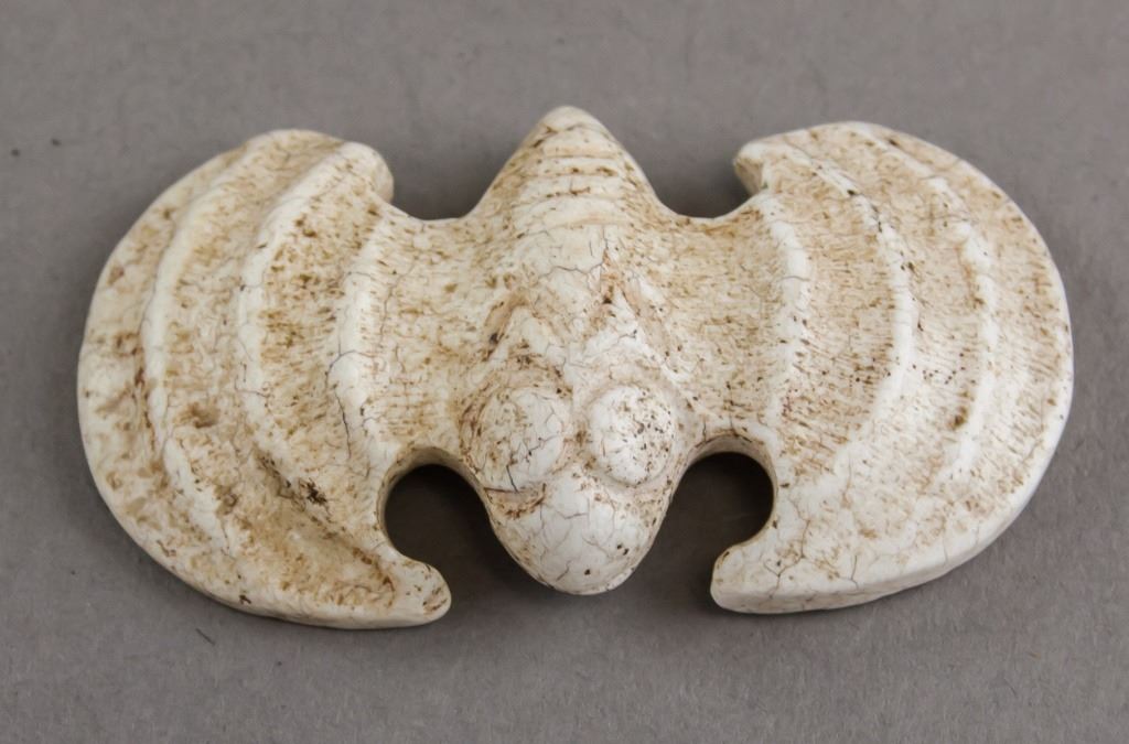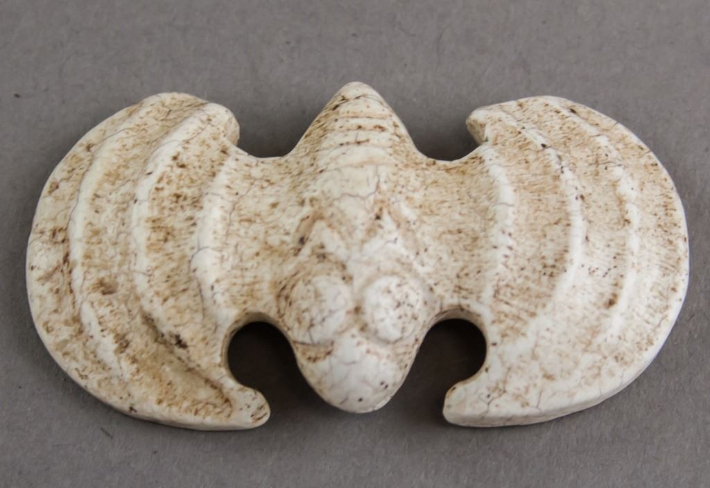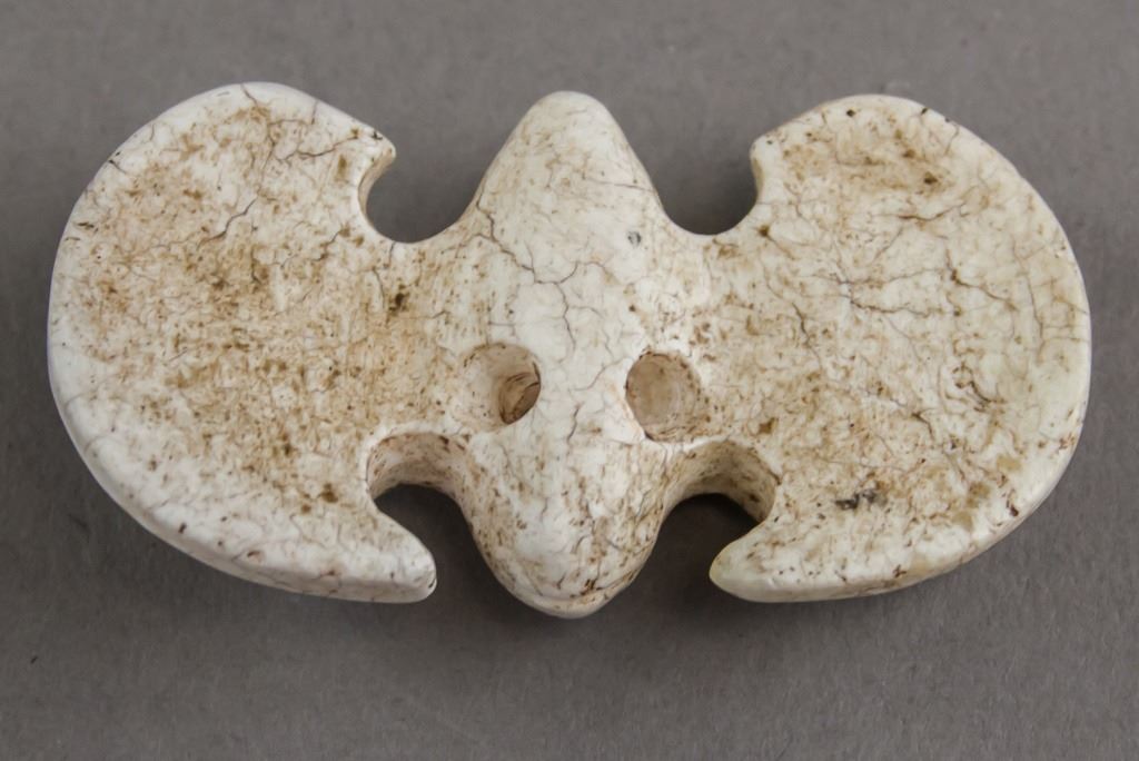 Chinese stone pendant. Of white tone with brown specks. Of bird shape. With two holes on the underside. 3 x 6 cm, 21g.