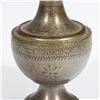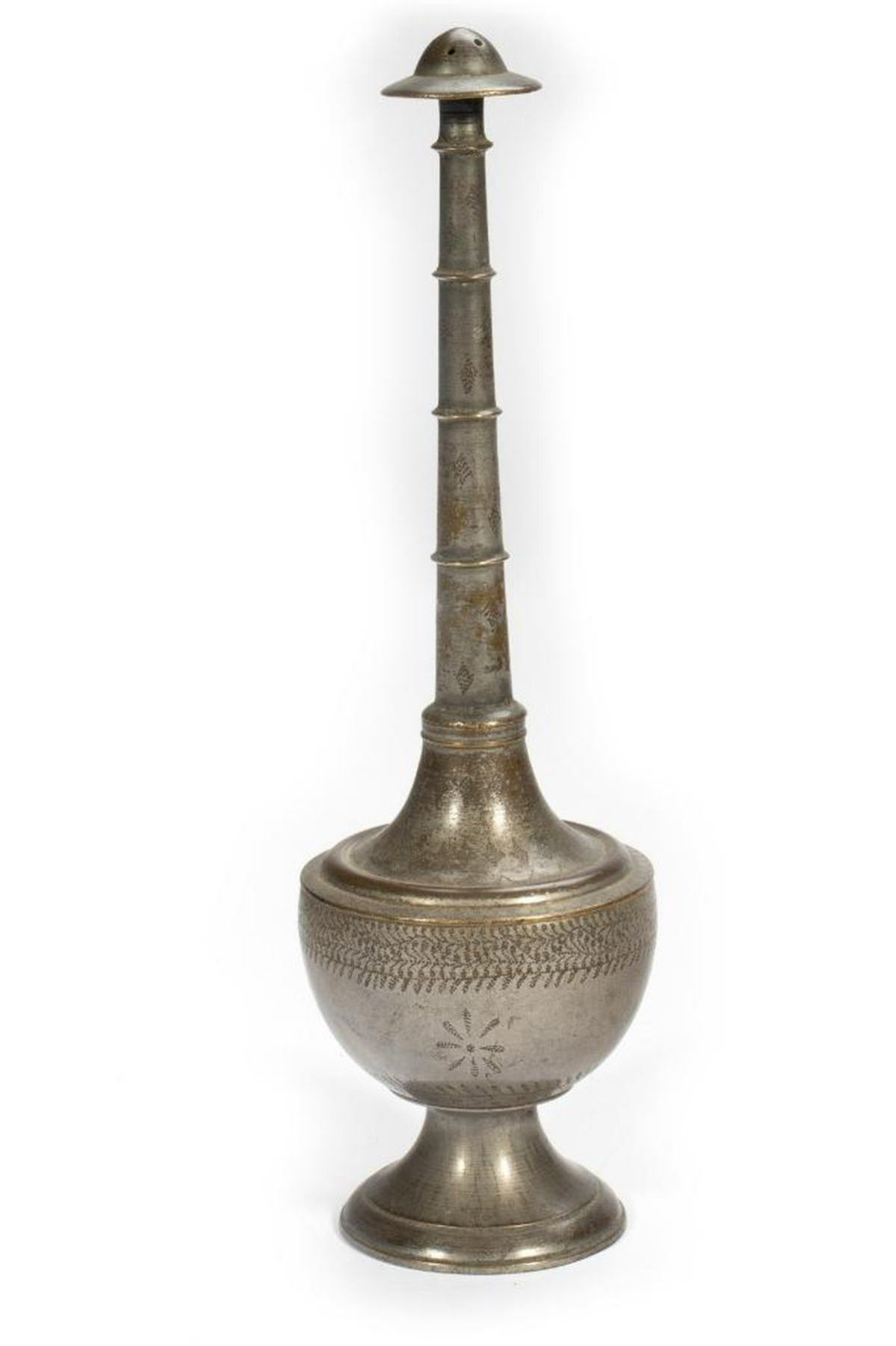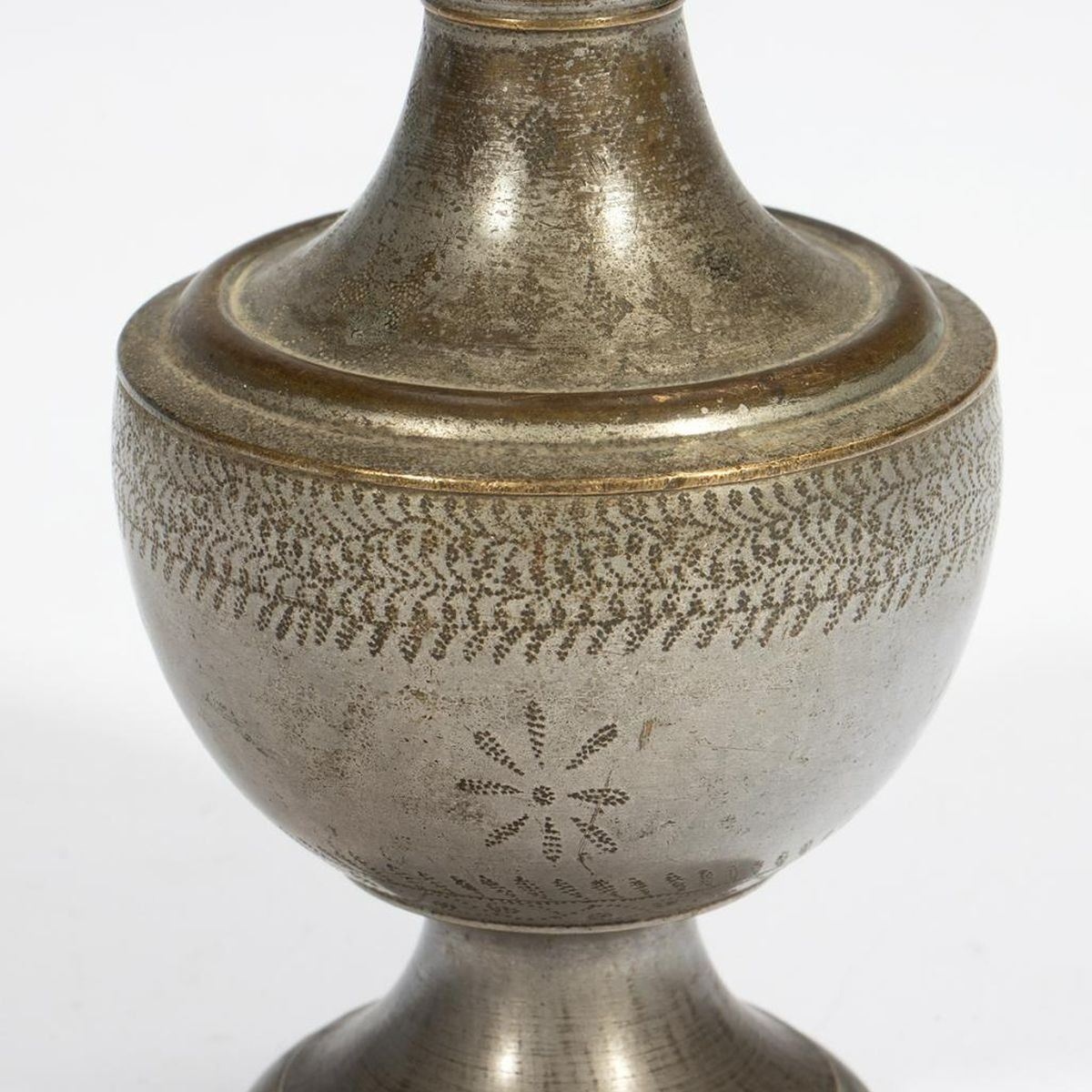 The contemporary copper vase with dragons on a blue ground; no marks; 6 1/2in. x 3 1/2in. Together with a metal incense burner with incised decoration and a screw-off vent column; 10 3/4in. x 3in. Vase in good condition; incense burner with surface wear.
