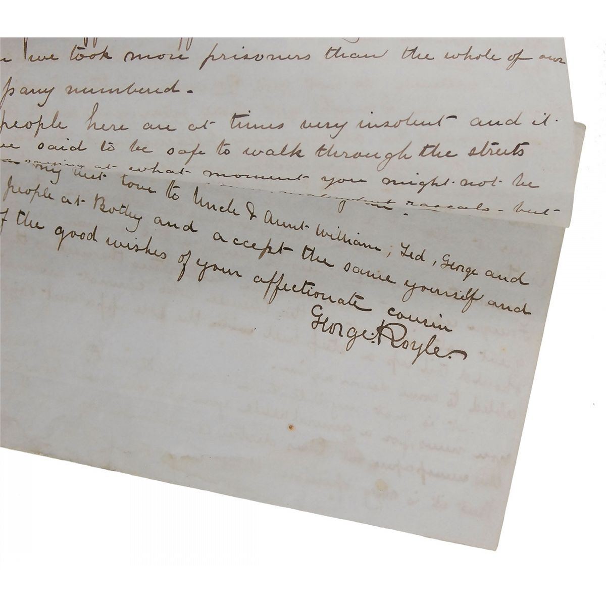ALS signed “George Royle,” four pages on two adjoining sheets, 9.25 x 11.75, engraved ‘Shanghai’ letterhead, May 20, 1862. Letter to his cousin Hester, written from the H. M. Gunboat Havoc in Kinkiang. In part: “I really do not deserve to be thanked for getting poor West’s things in order, because it was an act that it was only right a[nd] proper to perform for a brother officer and still more, should I not have been a barbarian to have neglected it, knowing that he was such a friend of yours?—I could not myself see the chest and things dispatched to England or even attend the sale of uniform, because, you see, the 'Snake' was at Shanghai and I was at Hankau, but I am told that the greater part sold for more than the cost price, the books as much as three times. I hope that long before this you have received the desk and everything all right. A monument is being made at Shanghai by subscription of the Officers and men; but the 'Snake' has been moving about so much lately that it has not yet been sent up. I am now going to write about it to the 'Snake.' The First Lieutenant of the 'Snake,' poor Royse, as good a fellow as ever breathed, has since died: he was very careful about West’s things: and her Doctor, Eastcott has been seriously wounded by the rebels and is not expected to live: she is a very unfortunate vessel.