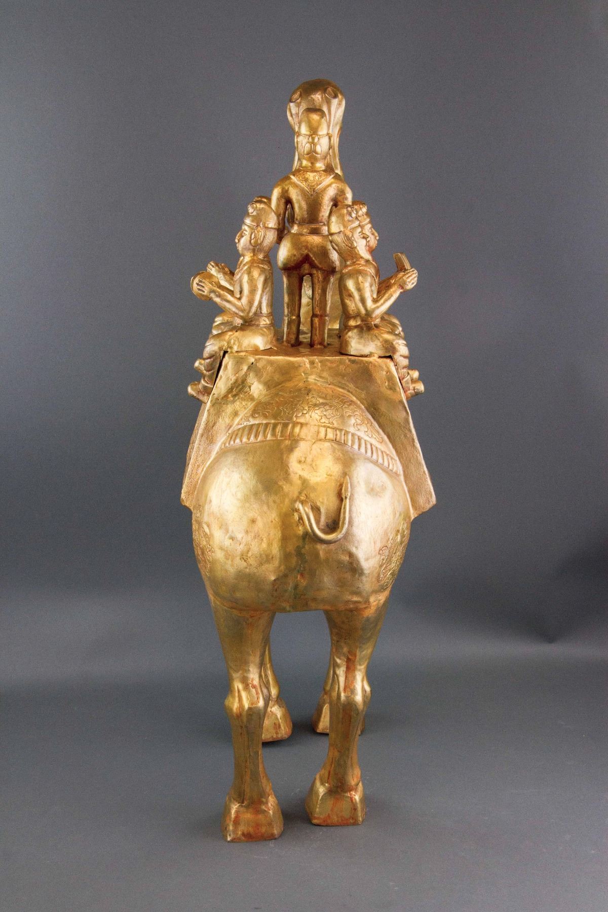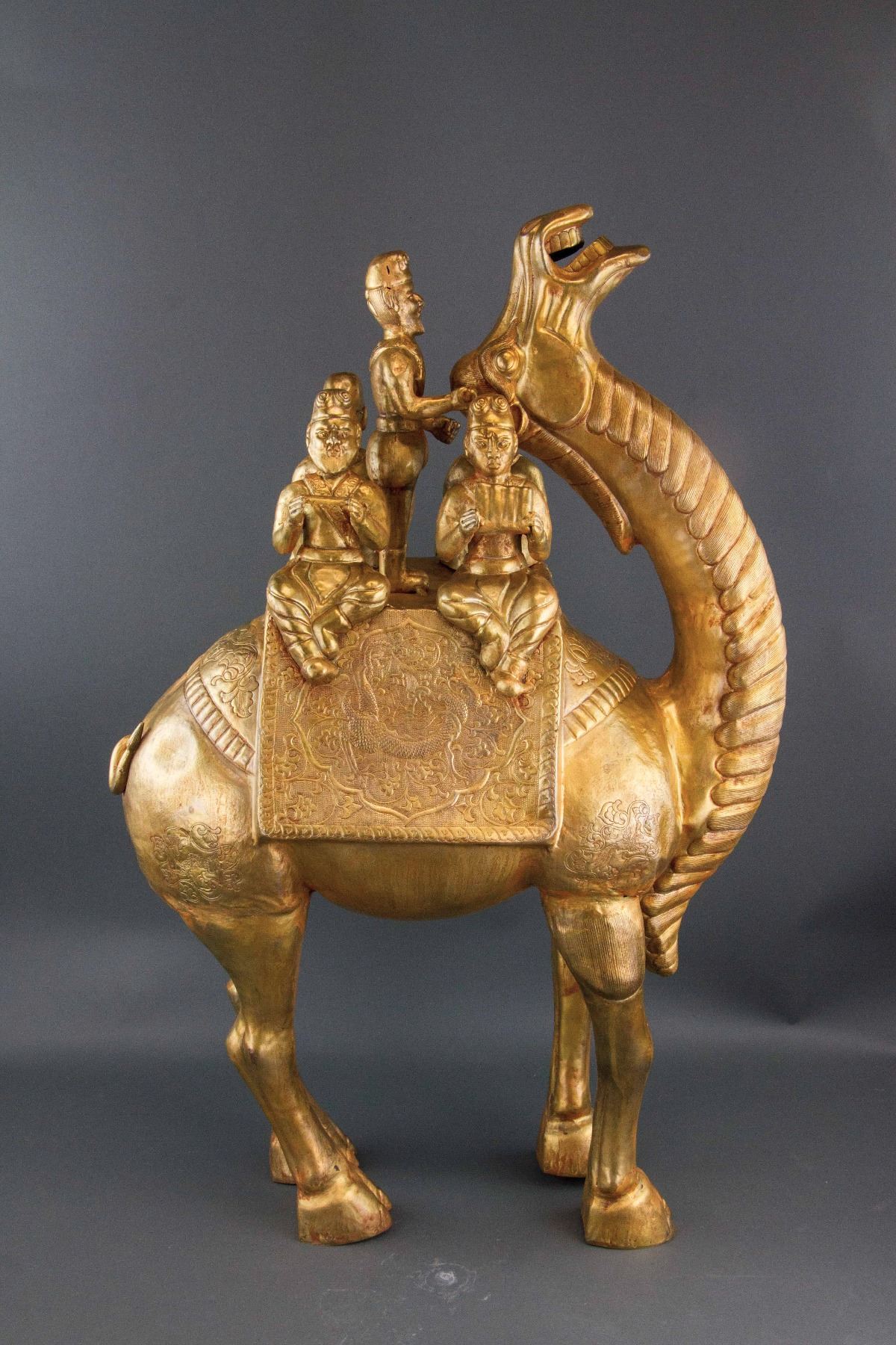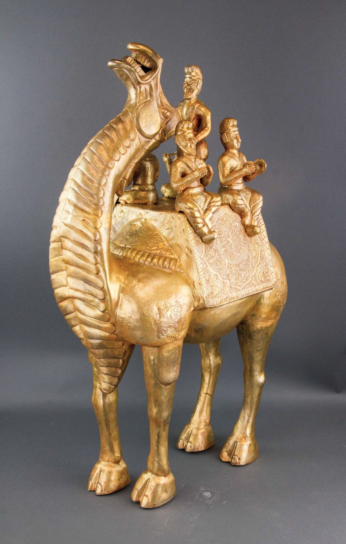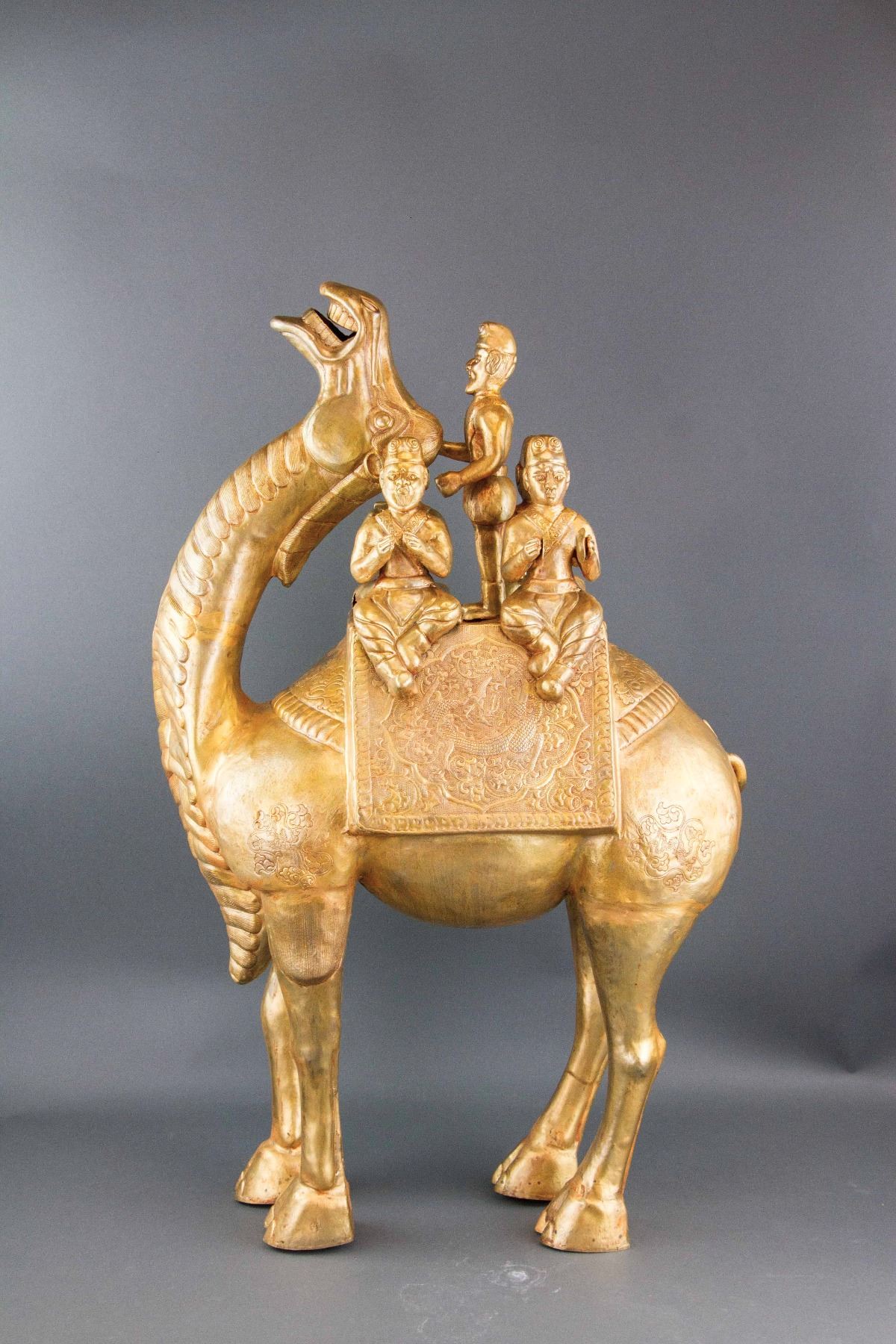 Chinese rare large Tang period figure; made of gold, silver and copper; depicting five foreign musicians playing musical instruments on a camel; camel decorated with carving of dragon, floral and leafy pattern; four-character Da Tang Zhen Guan mark on belly of camel; 7th century to 8th century; 78 cm x 49 cm, 6 kilograms