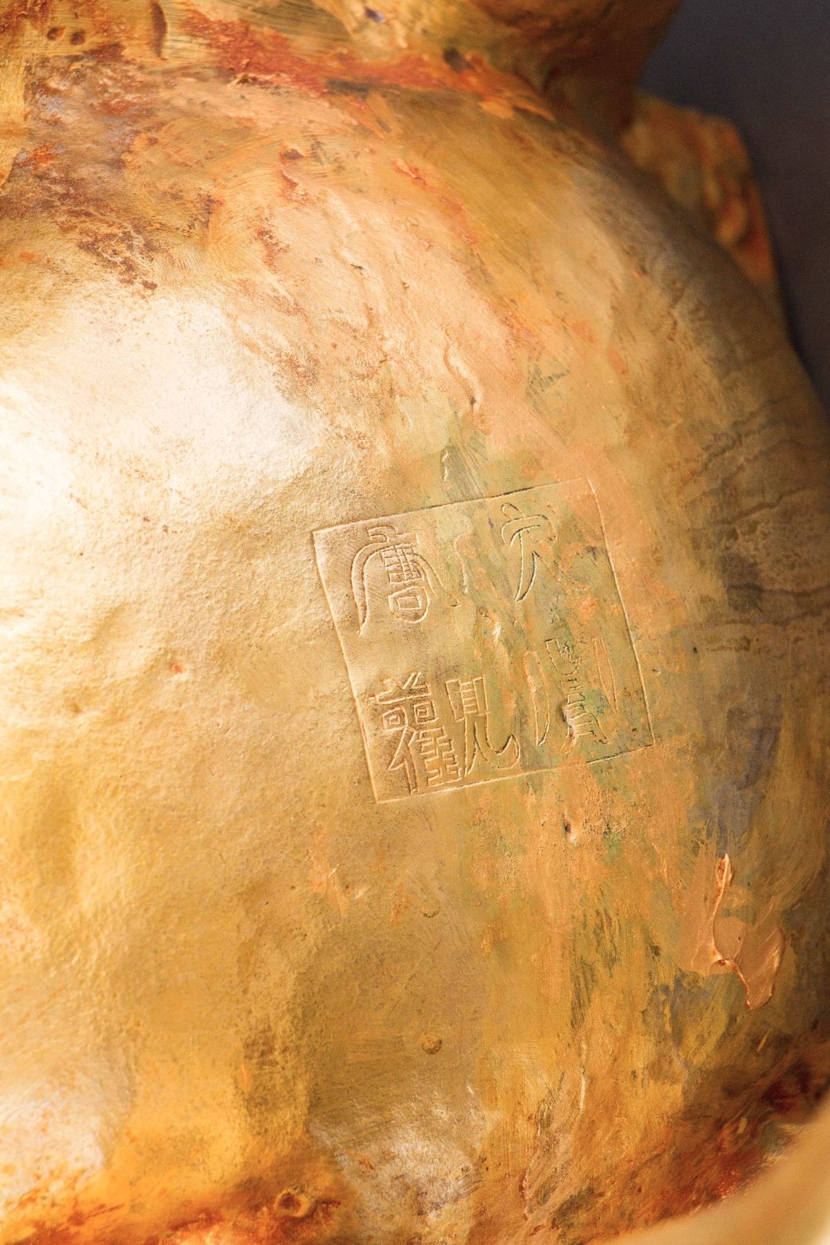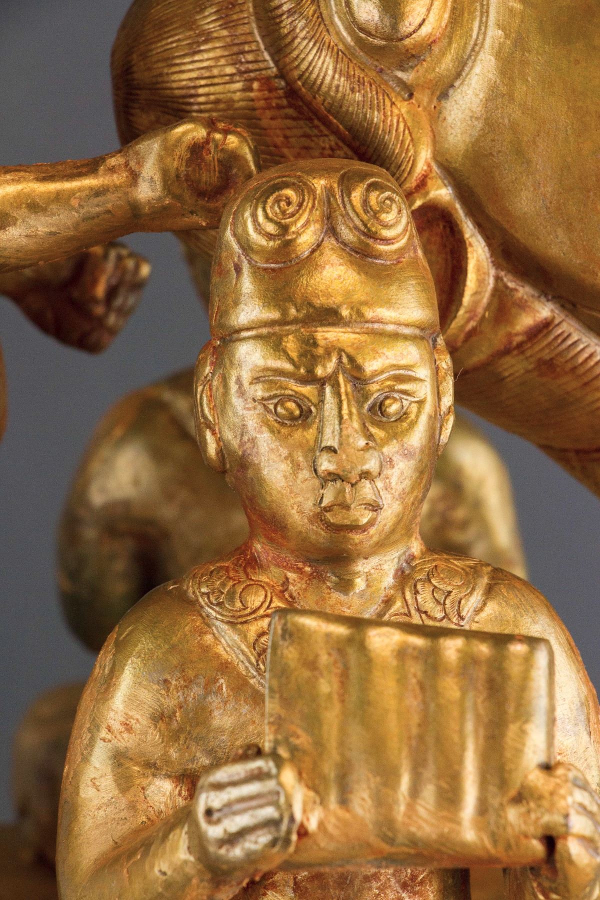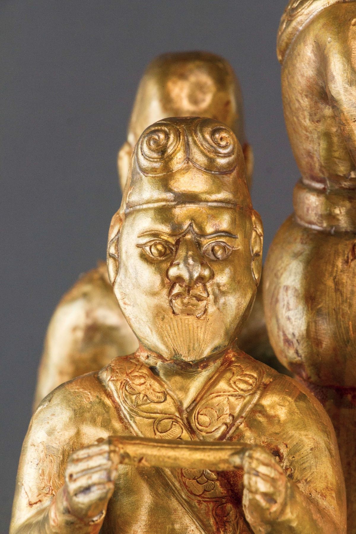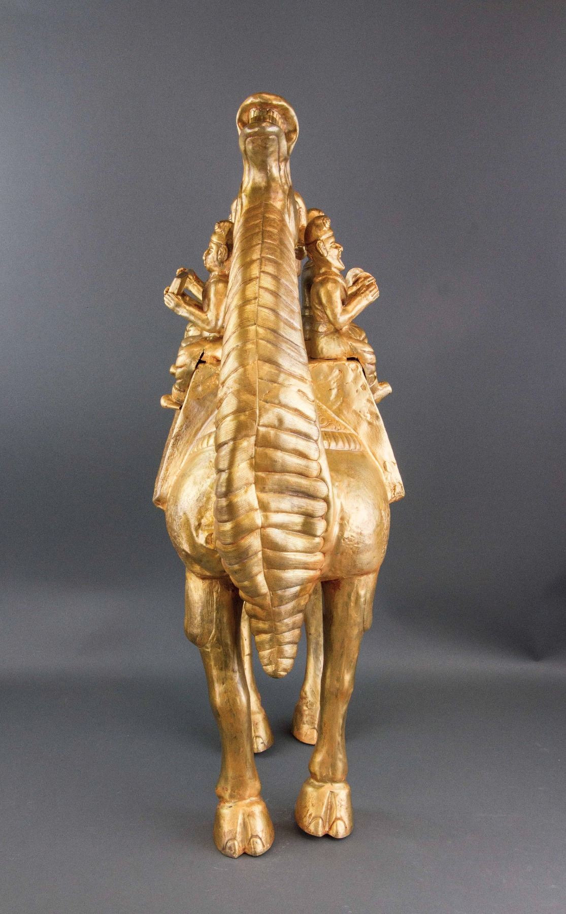 Chinese rare large Tang period figure; made of gold, silver and copper; depicting five foreign musicians playing musical instruments on a camel; camel decorated with carving of dragon, floral and leafy pattern; four-character Da Tang Zhen Guan mark on belly of camel; 7th century to 8th century; 78 cm x 49 cm, 6 kilograms