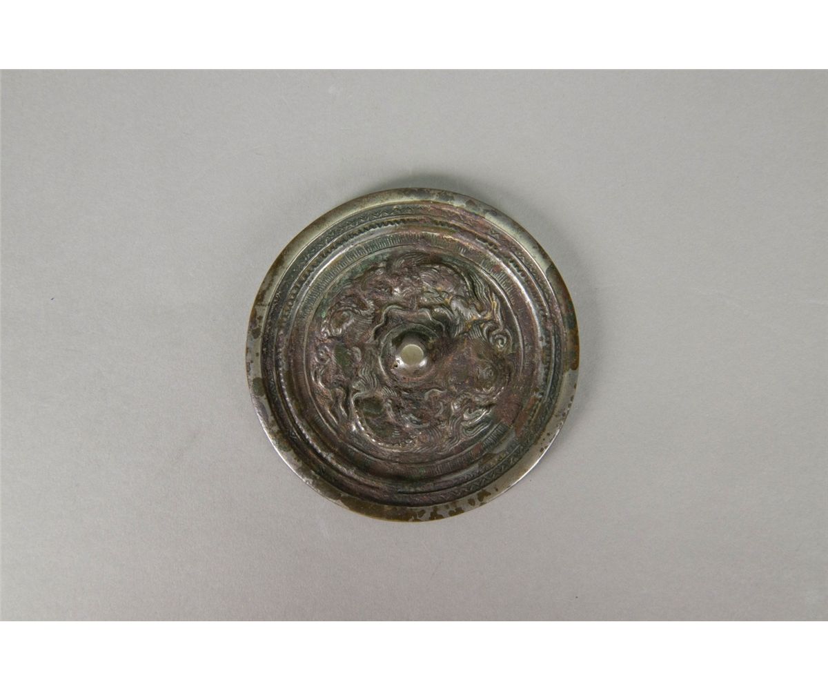Chinese bronze mirror; of circular form; polished on the front; Chinese traditional monsters in low-relief and a knob in the center of the back; pssibly Tang or Ming Dynasty; H: 2 cm, D: 13 cm, 539 grams
