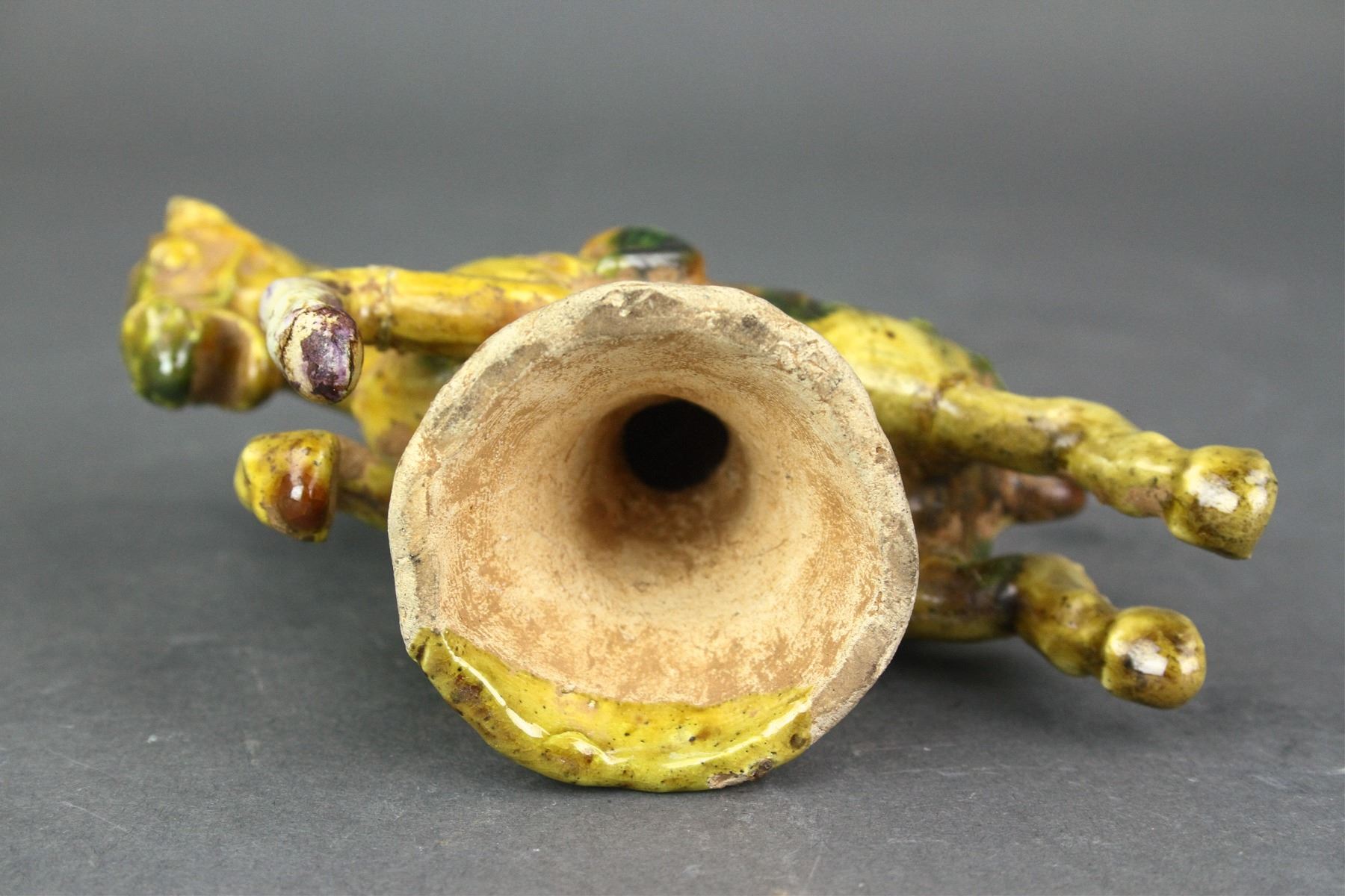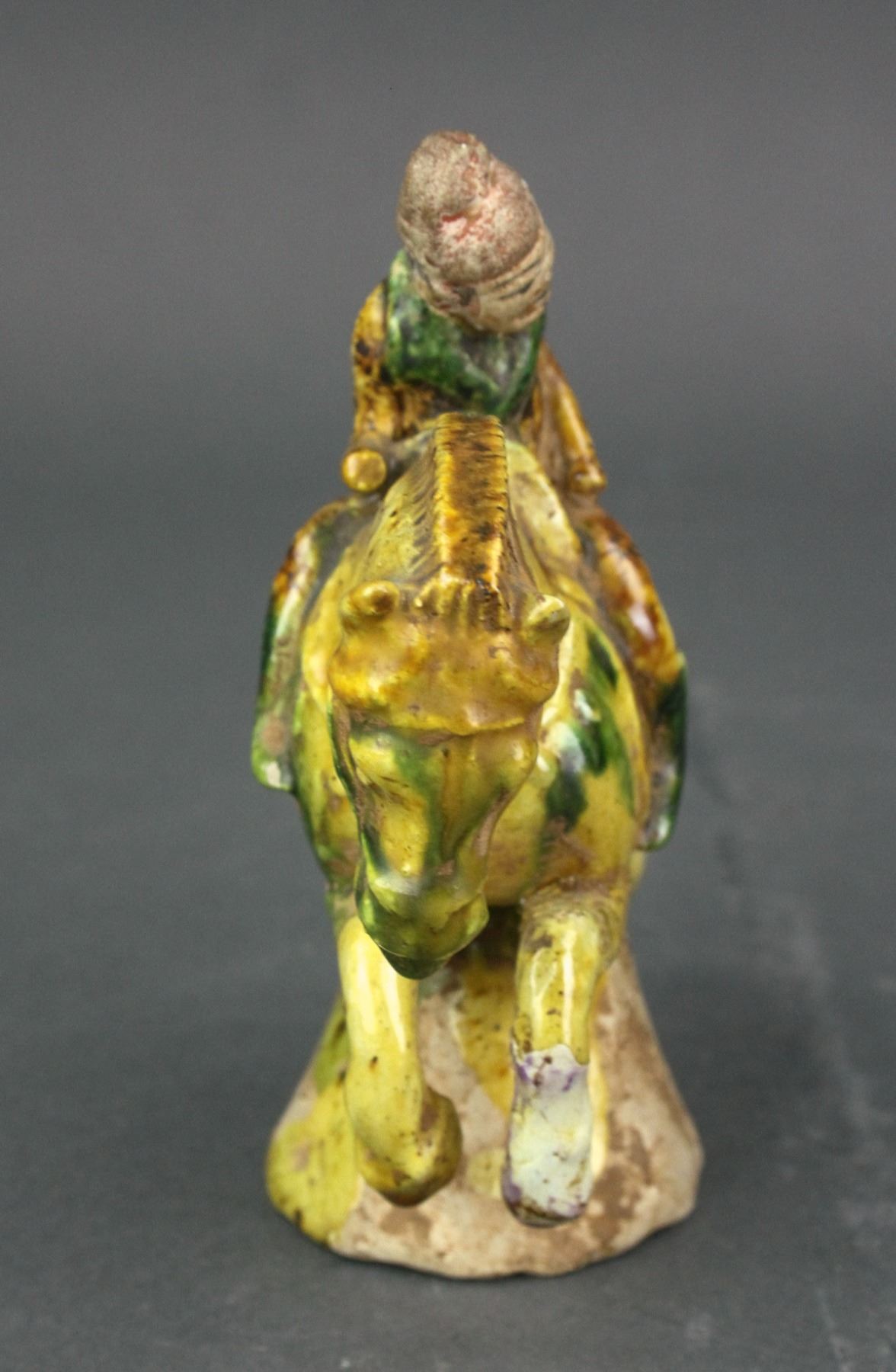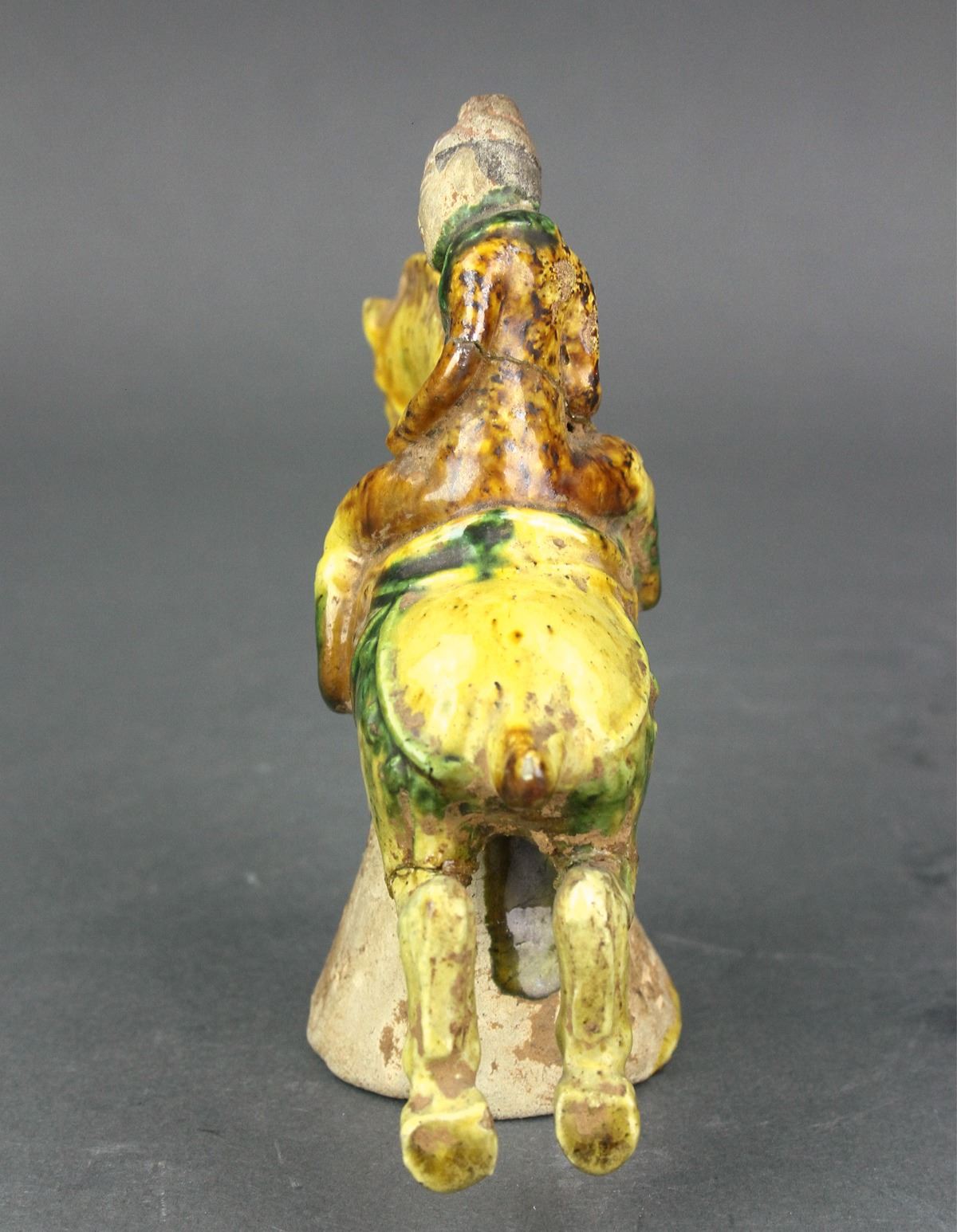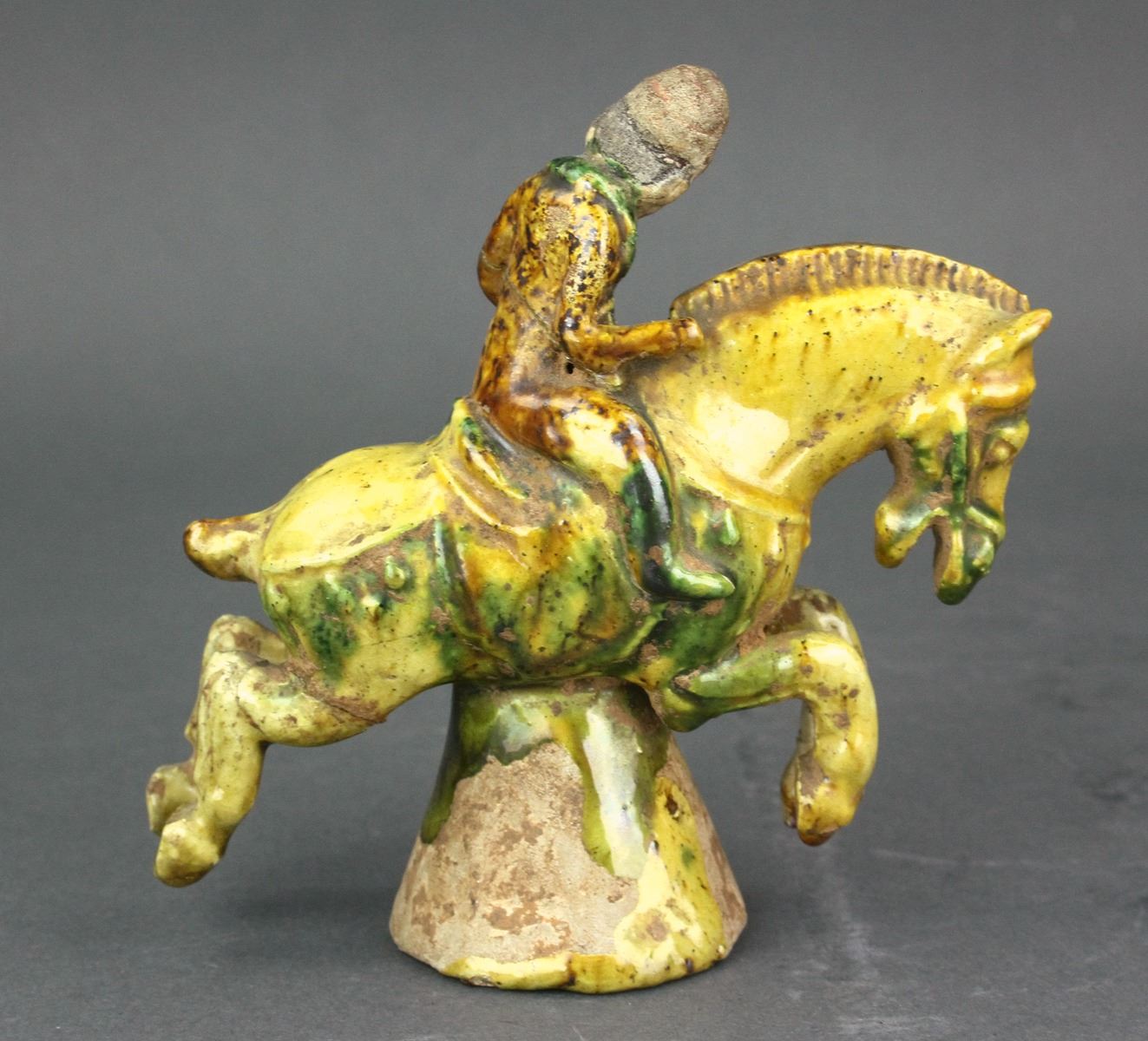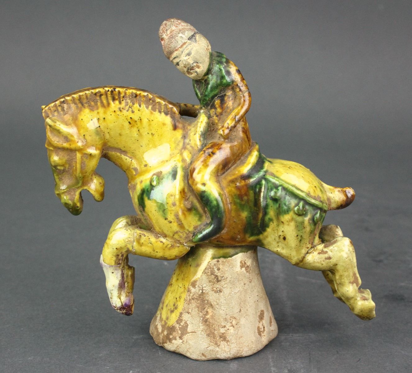 Chinese Sancai pottery figure; Tang period; with a cone-shaped stand; featuring man on horseback playing Dakyu game; H: 12 cm, W: 12 cm, 153 grams